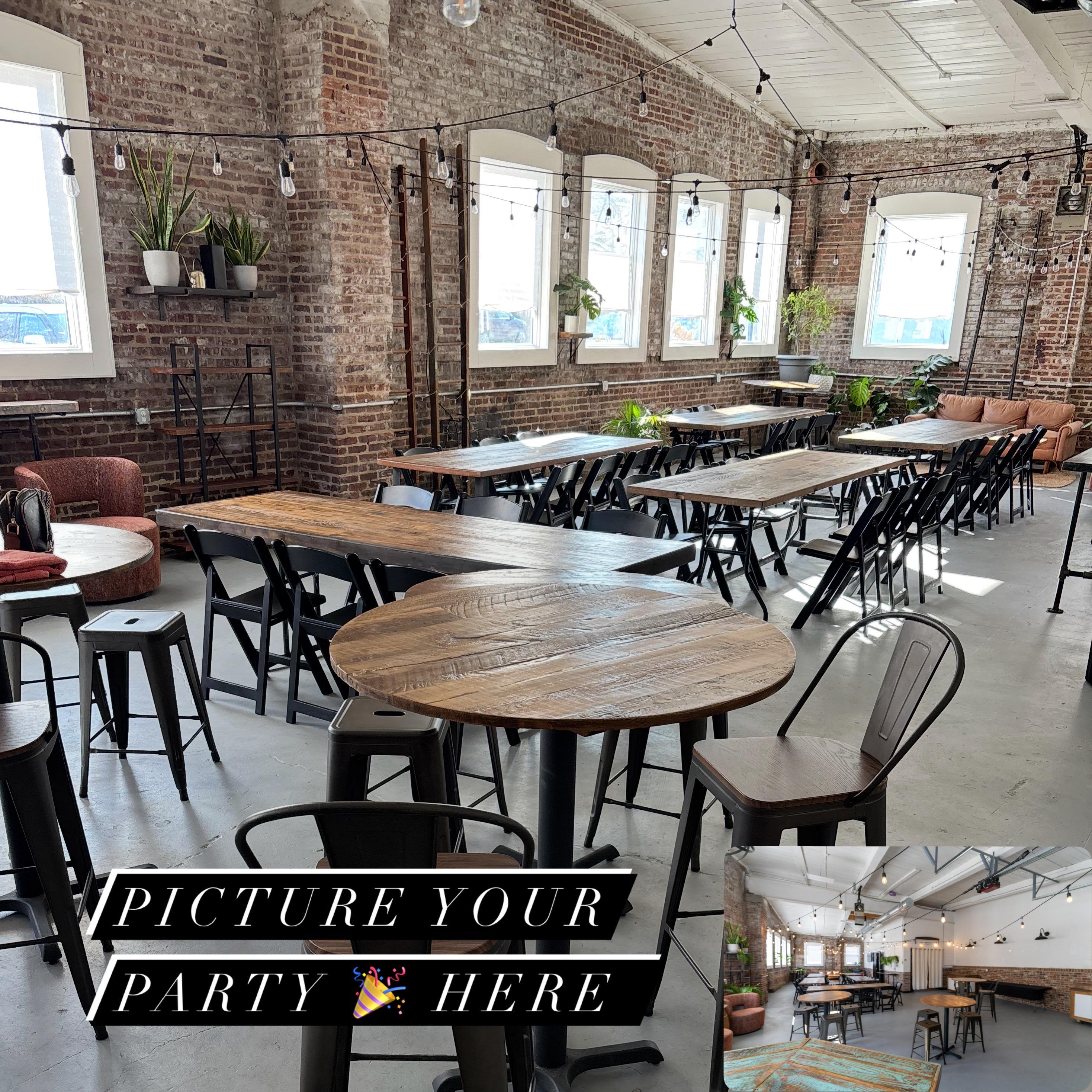 With this package you are renting the room which includes our wood tables and black resin chairs. We have 5 8 foot tables that seat 8 to 10 and we have (7) high top tables with 3 stools each. You can source your decor and food and wait staff.