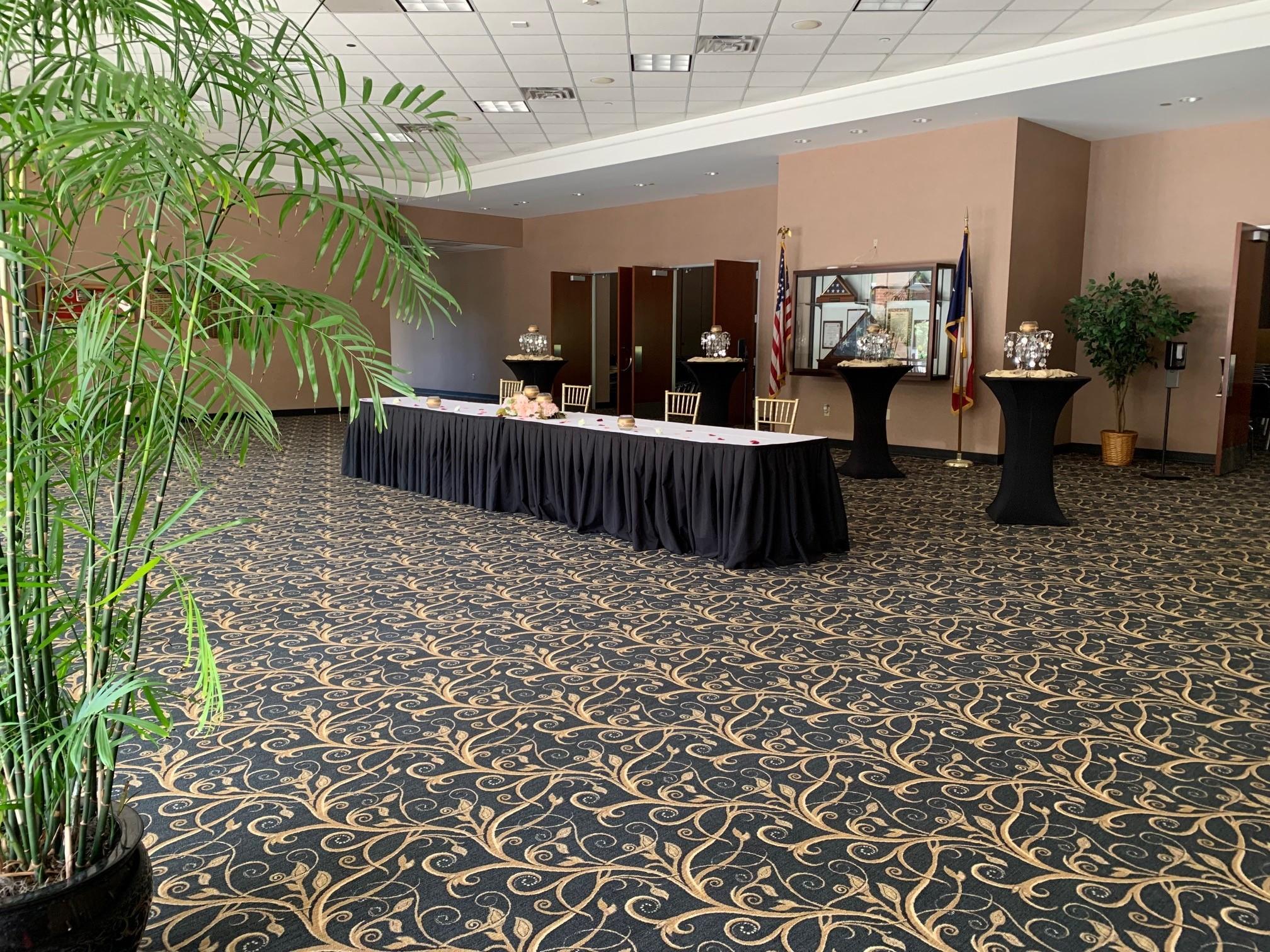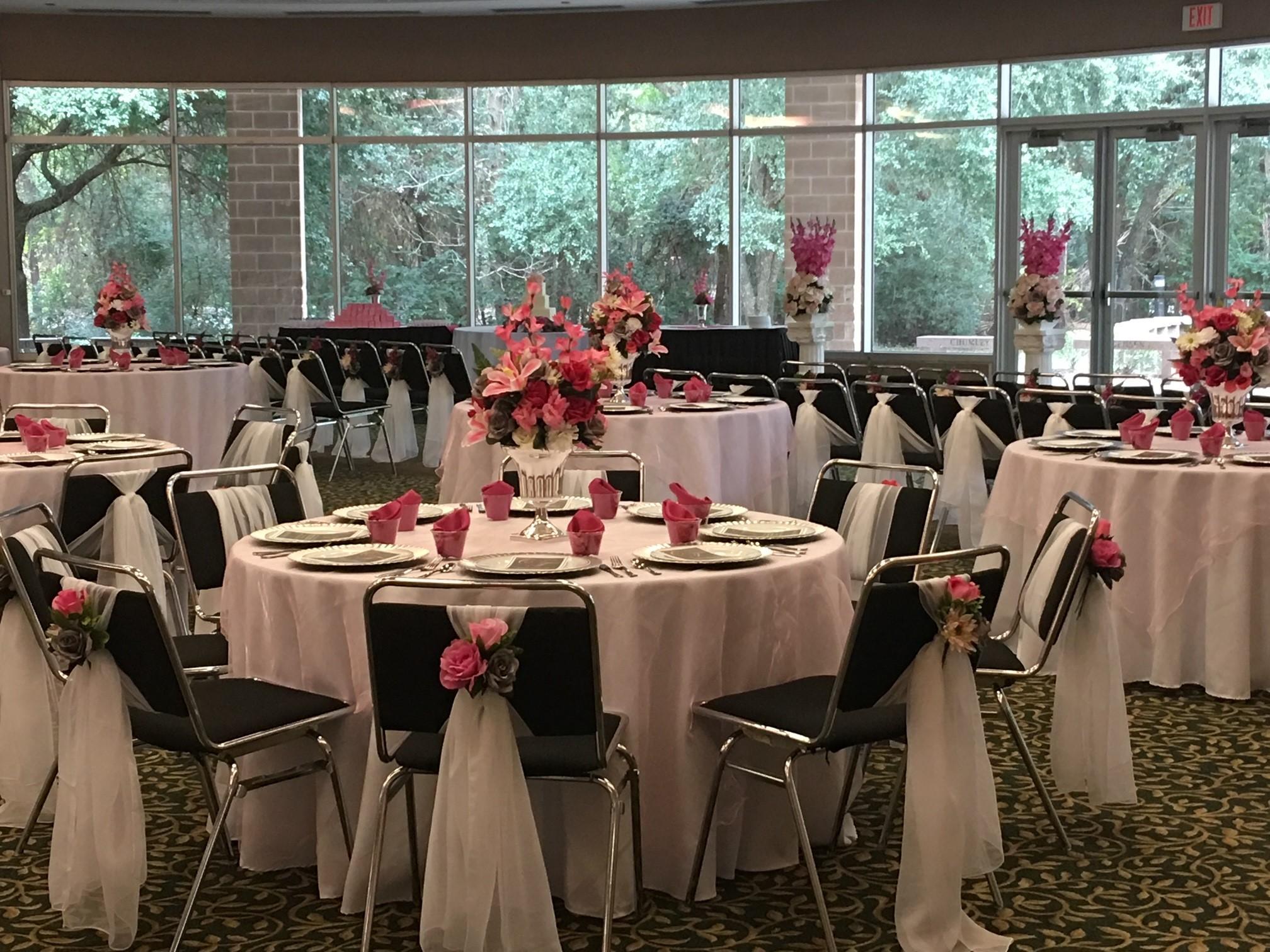 Rental includes tables, chairs, dance floor, and staging (if needed) set up to an approved diagram. Up to (9) rectangle tables for sign in, beverage station, buffet, etc. will have white linen tablecloths and black skirting. Linen for the round tables is available for an additional $10 + tax per table. Bluetooth sound system for announcement and background music. Complimentary WIFI.