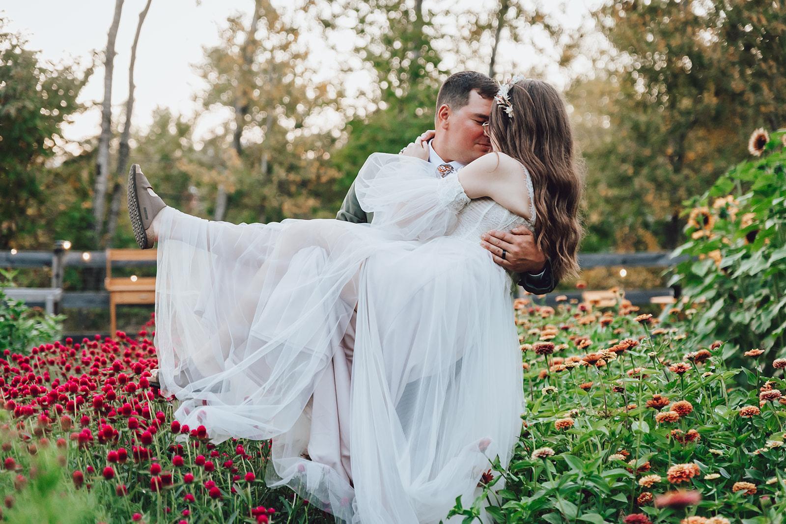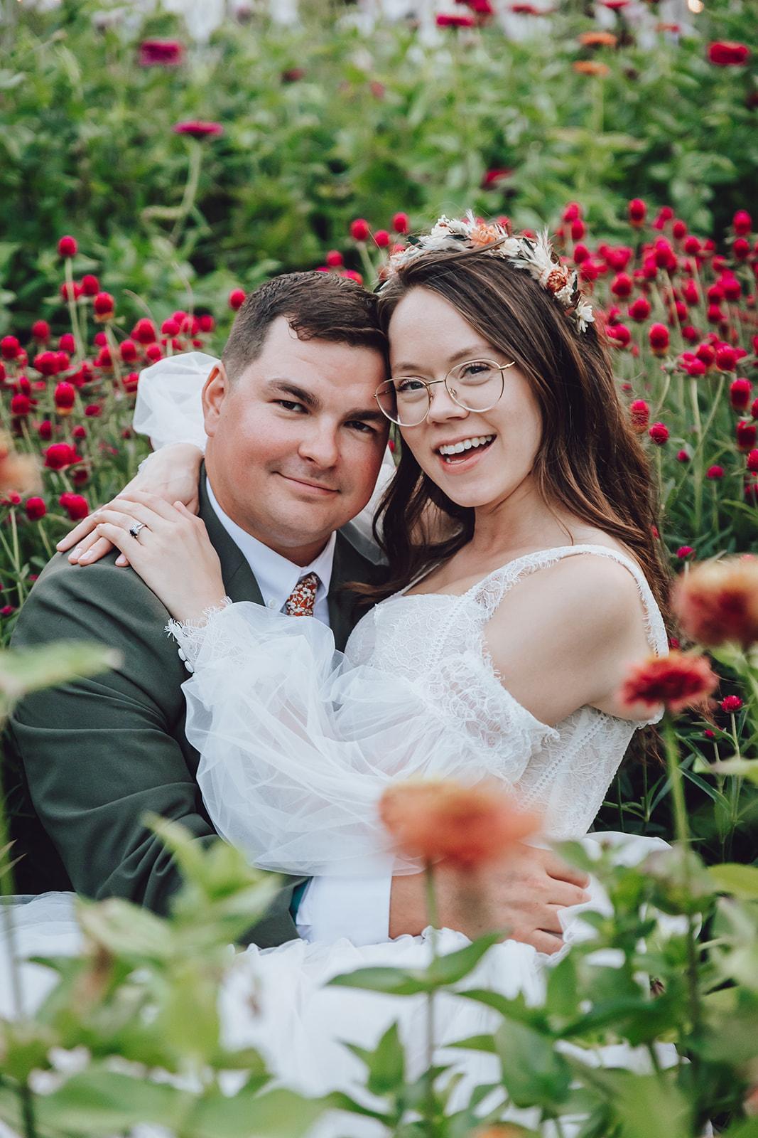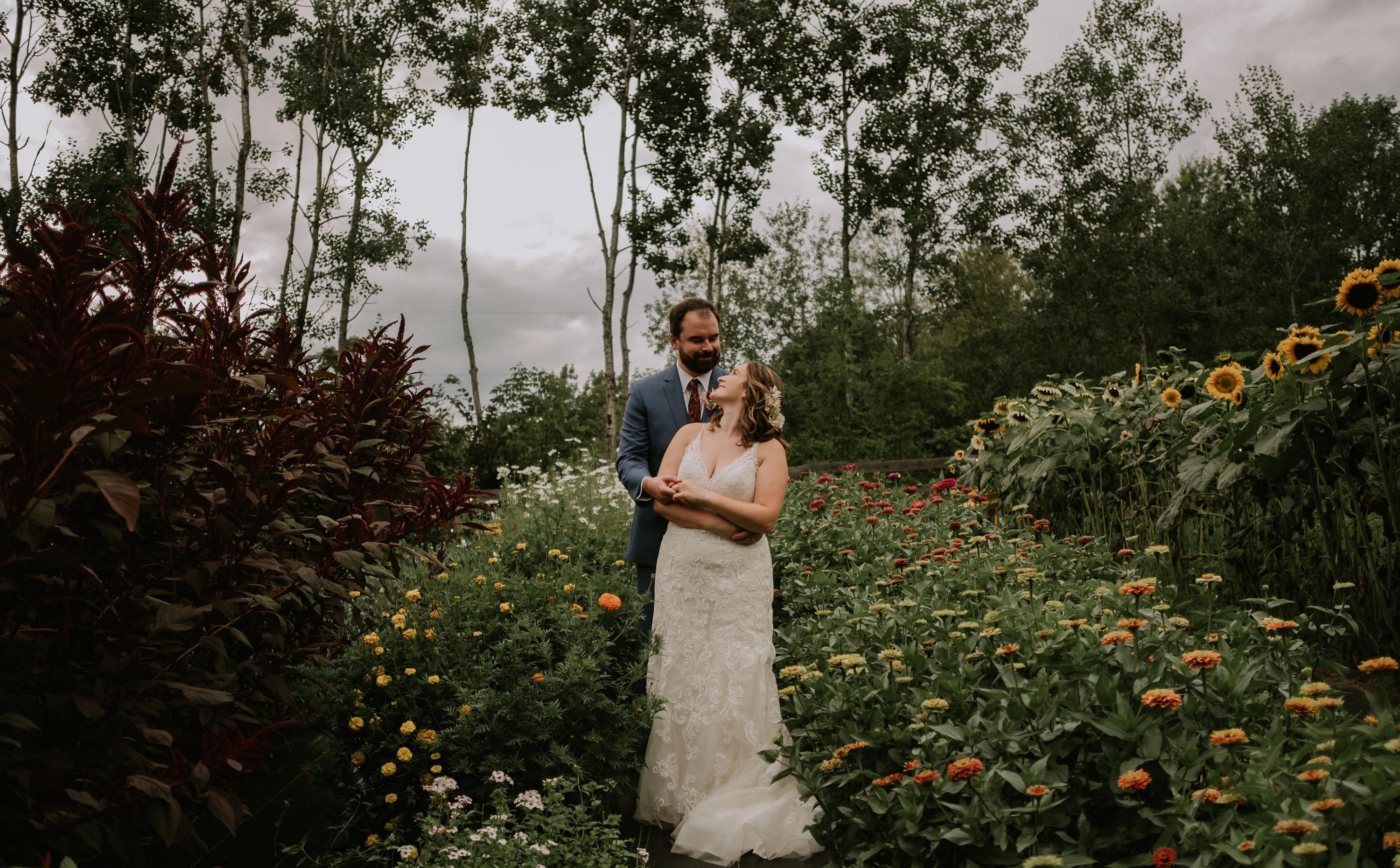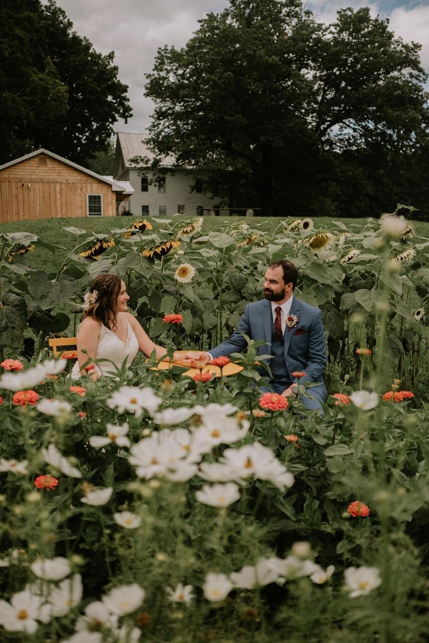 From early August to late September, the Flower Field at Garden Gate is in full bloom, providing a beautiful backdrop for your wedding portraits and a peaceful location for private vows. Stand among rows of dahlias, zinnias, sunflowers, cosmos, and more in our charming field. Garden Gate also provides bulk flowers for your DIY wedding flowers.