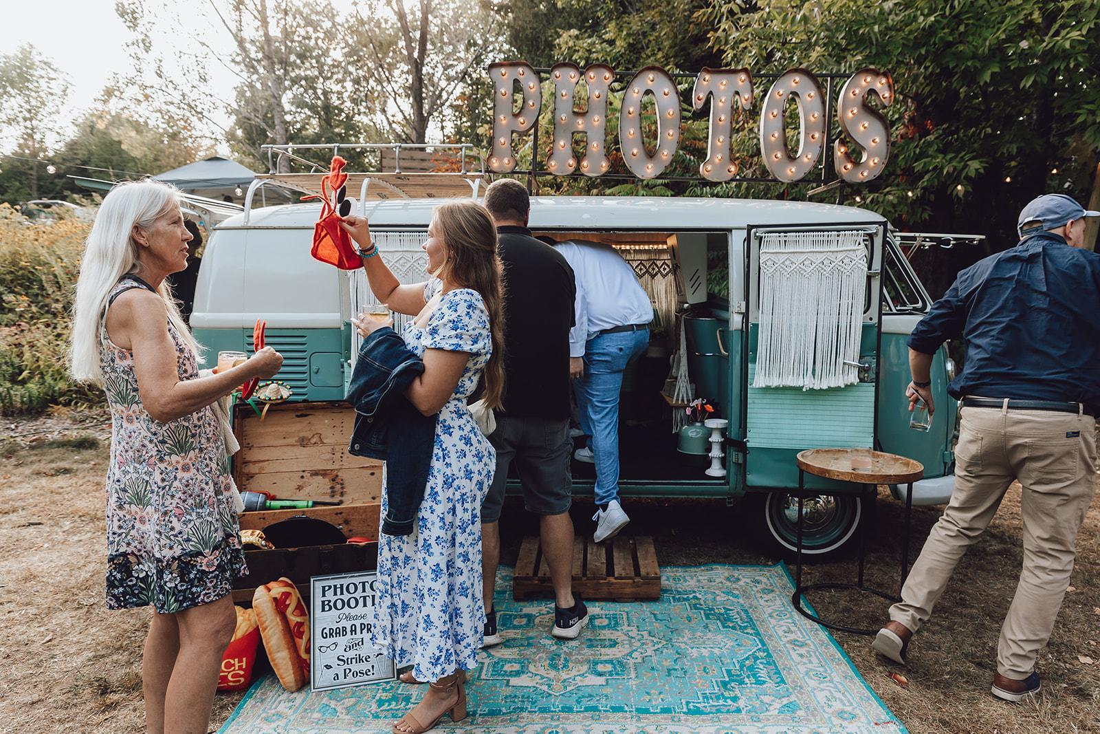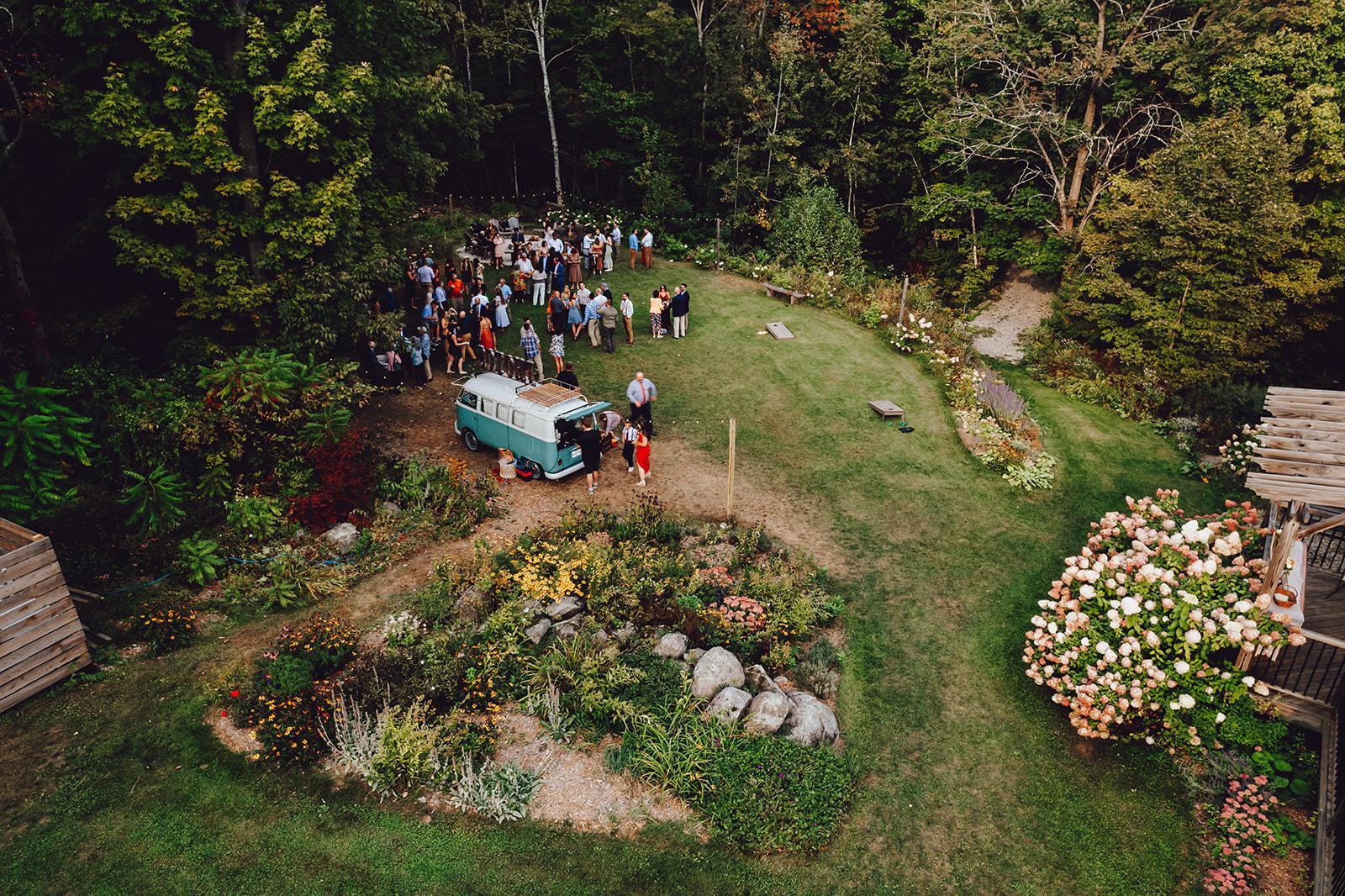 Next to the barn is a grass lawn surrounded by forest, gardens, and twinkle lights. Ideal for cocktail hour, the lawn is large enough for mobile bar trailers, space for lawn games, and has a fire pit with benches to end the evening.