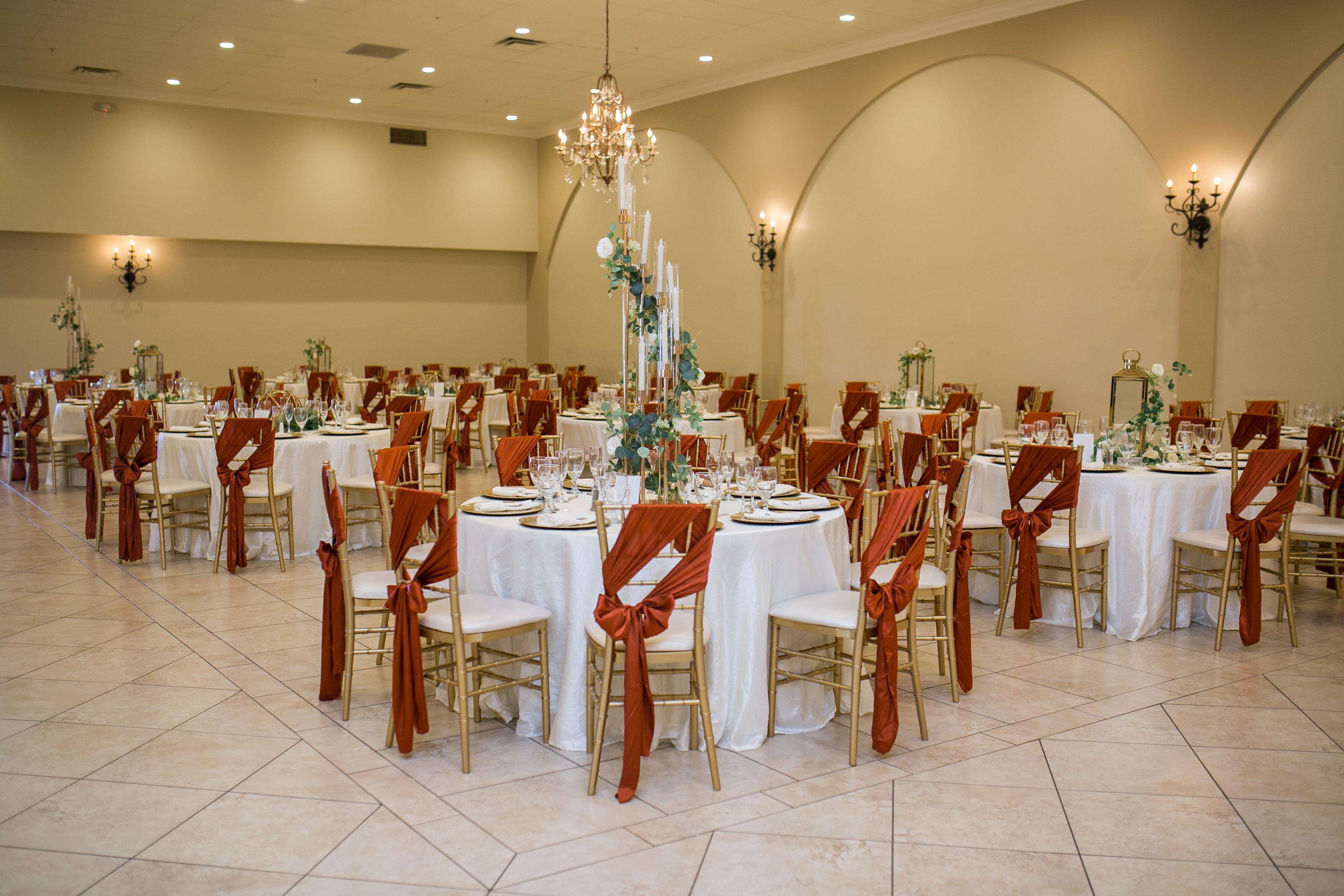 Our beautiful ballroom has a charming Tuscan décor that can comfortably host up to 500 guests. The space features two stages for the head table and cake, or for your band, and a large open dance floor. With more than 40 color themes available, our professional team will transform your reception hall into the room of your dreams.