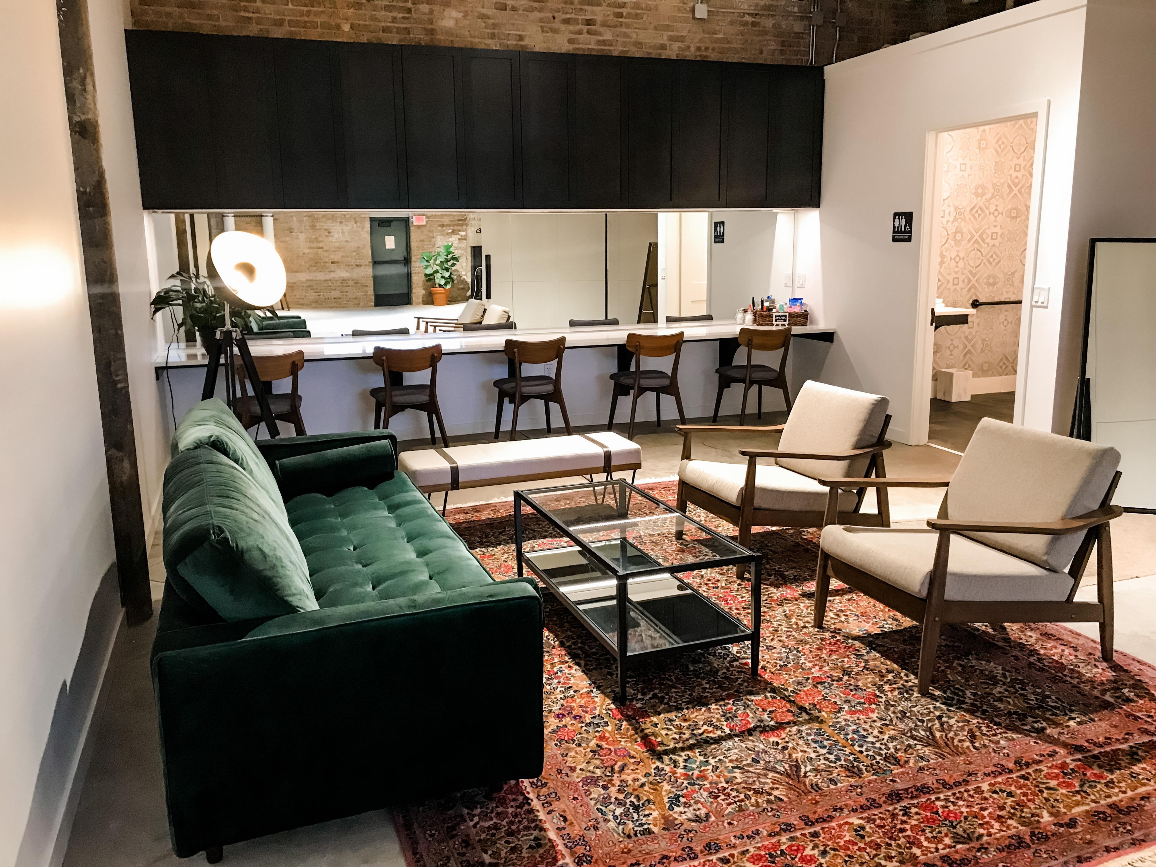 This cozy getting-ready space includes a makeup counter, a stocked mini fridge, a lounge area, a private restroom, and adjustable lighting and A/C.