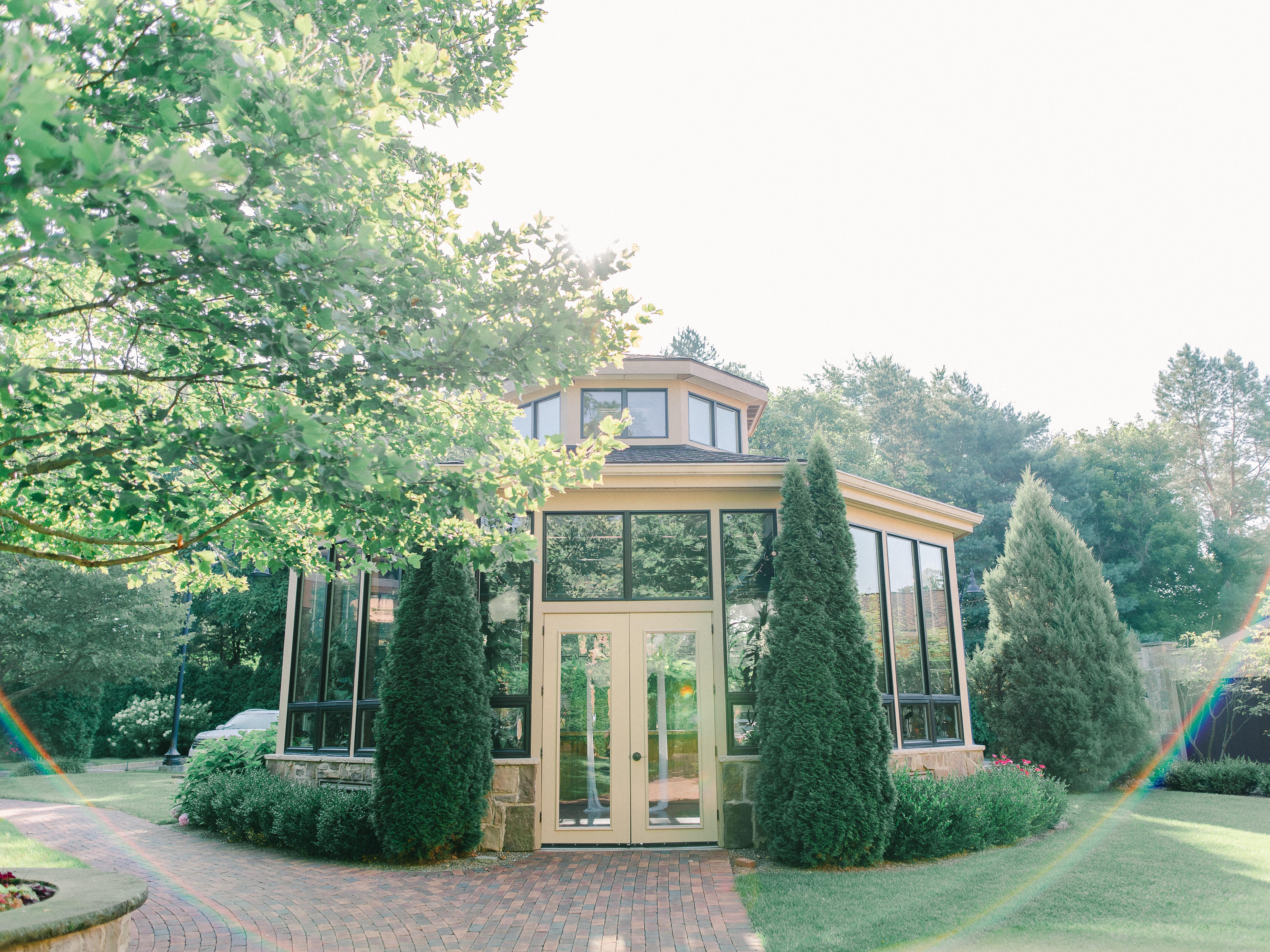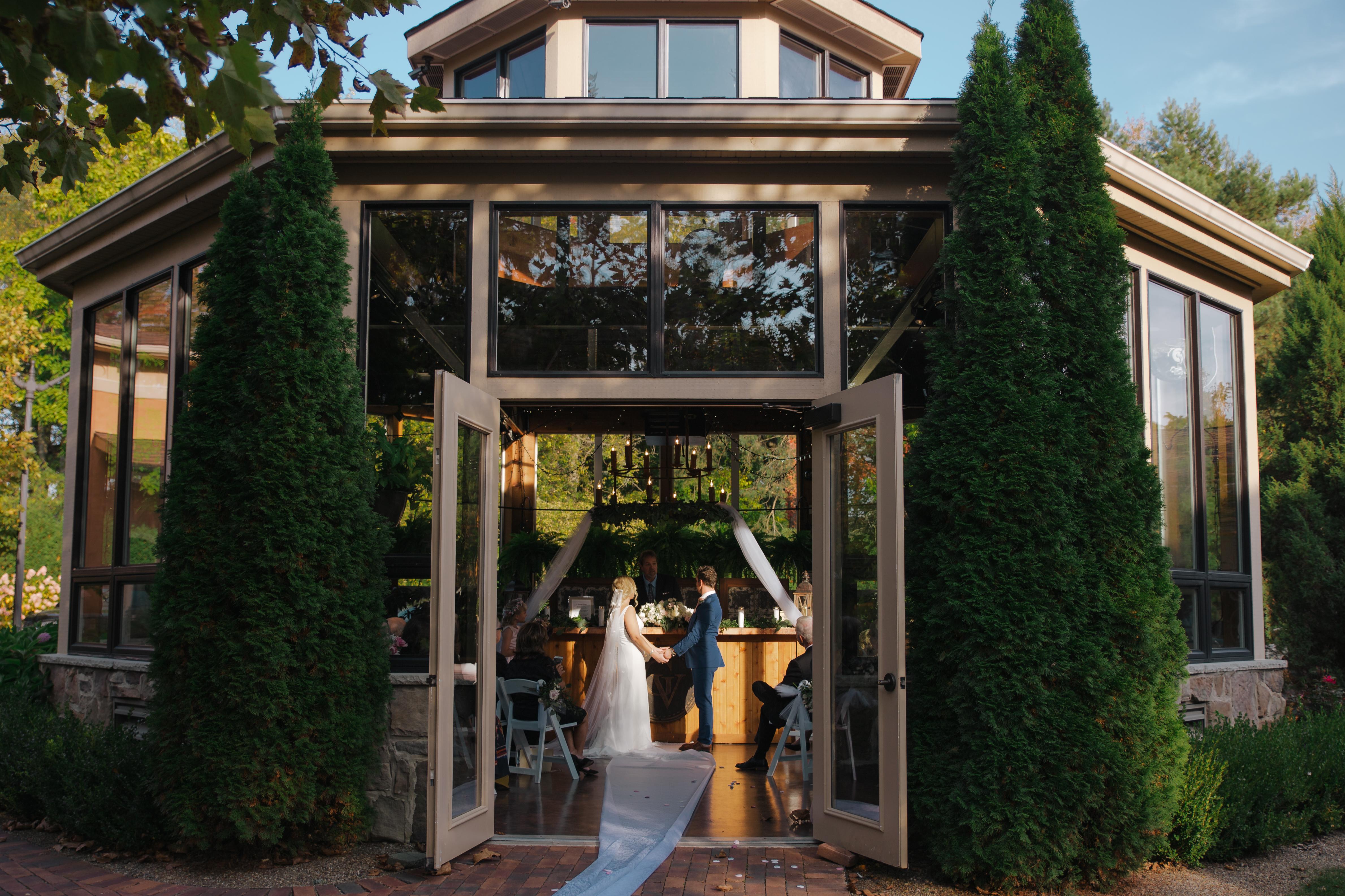 The Conservatory is an elegant greenhouse with a charming ambiance for ceremonies. Surrounded by flowers, shrubs, greenery and Tuscan architecture.