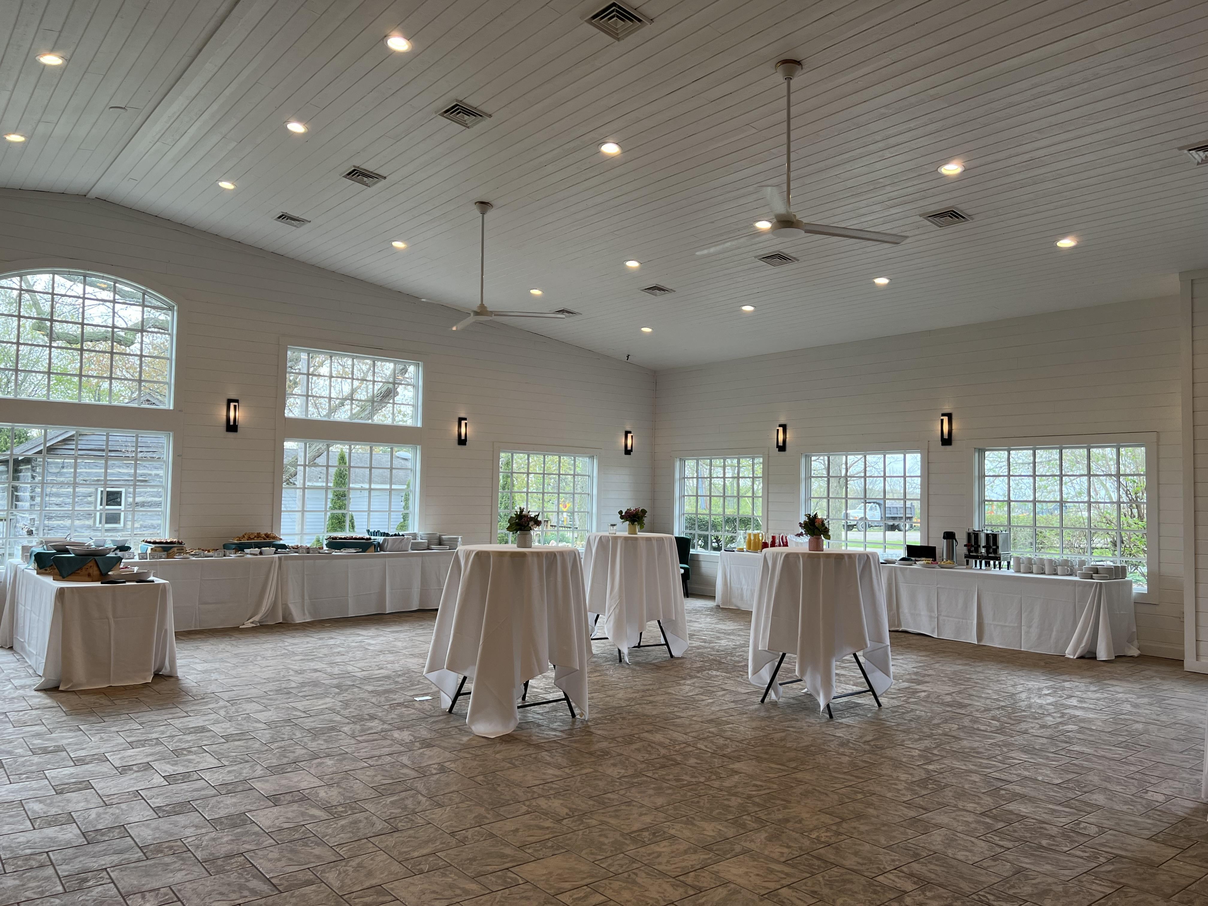 Largest, indoor event space located on the first floor includes wood beams, limestone walls, fireplace and chandeliers with seating for up to 180 guests.