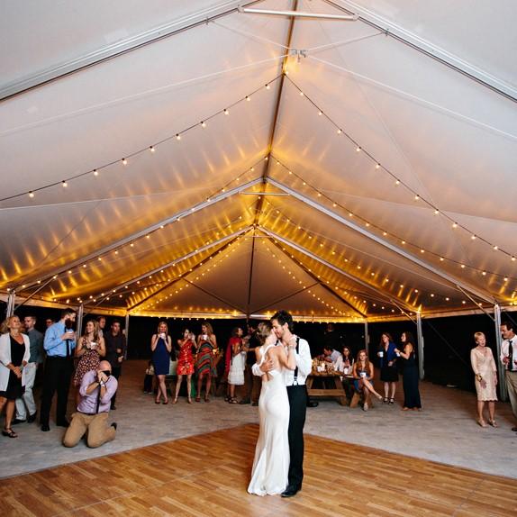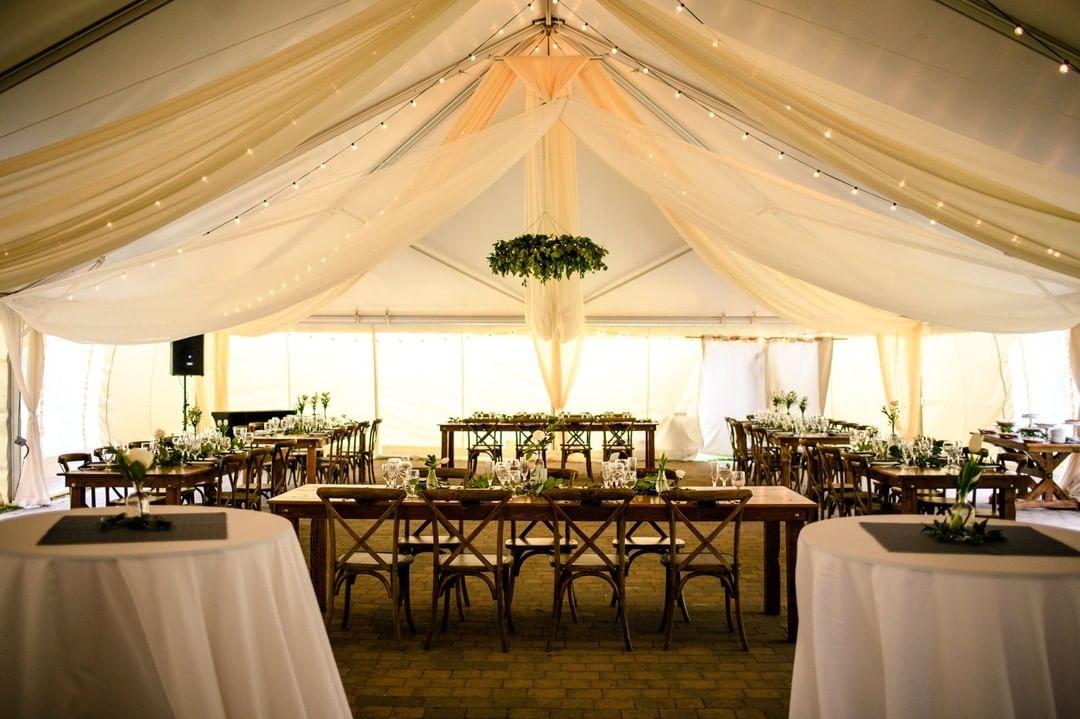 From the ceremony, a short charming path will take your guests down to the reception, which is held under a classic white tent in an airy meadow. The simple surroundings offer infinite possibilities for decor, so you’ll be able to make the space feel like your own. The 40x75 foot frame tent, which comes fully installed with the venue rental, can be arranged in countless ways to best accommodate your guest count. Smaller groups find it cozy and intimate, while groups of 200 find it perfectly comfortable