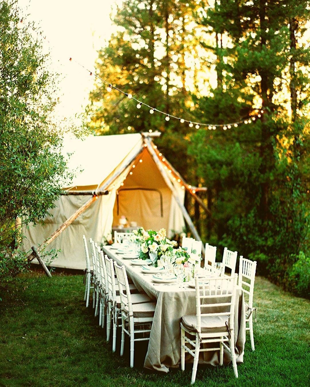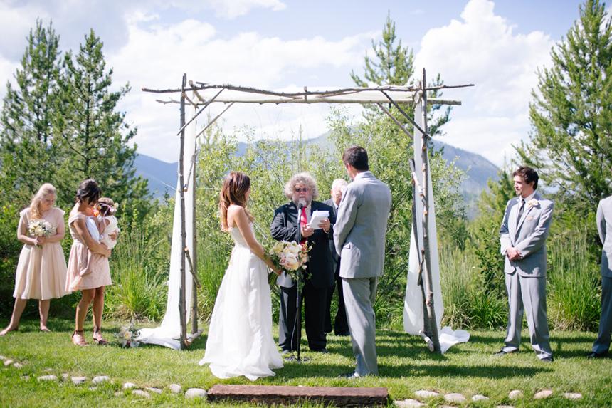 A wooded path takes your guests up to a grassy clearing surrounded by pines and wild foliage, with spectacular panoramic views of the mountains of Glacier National Park. A lovely wall-tent, stylishly appointed with chairs and a dresser, provides a shady spot for the bridal party to gather, take a deep breath (and a sip of champagne!), and wait for the ceremony to begin. The ceremony lawn is tiered so that, no matter the size of your group, everyone will have a fantastic view.