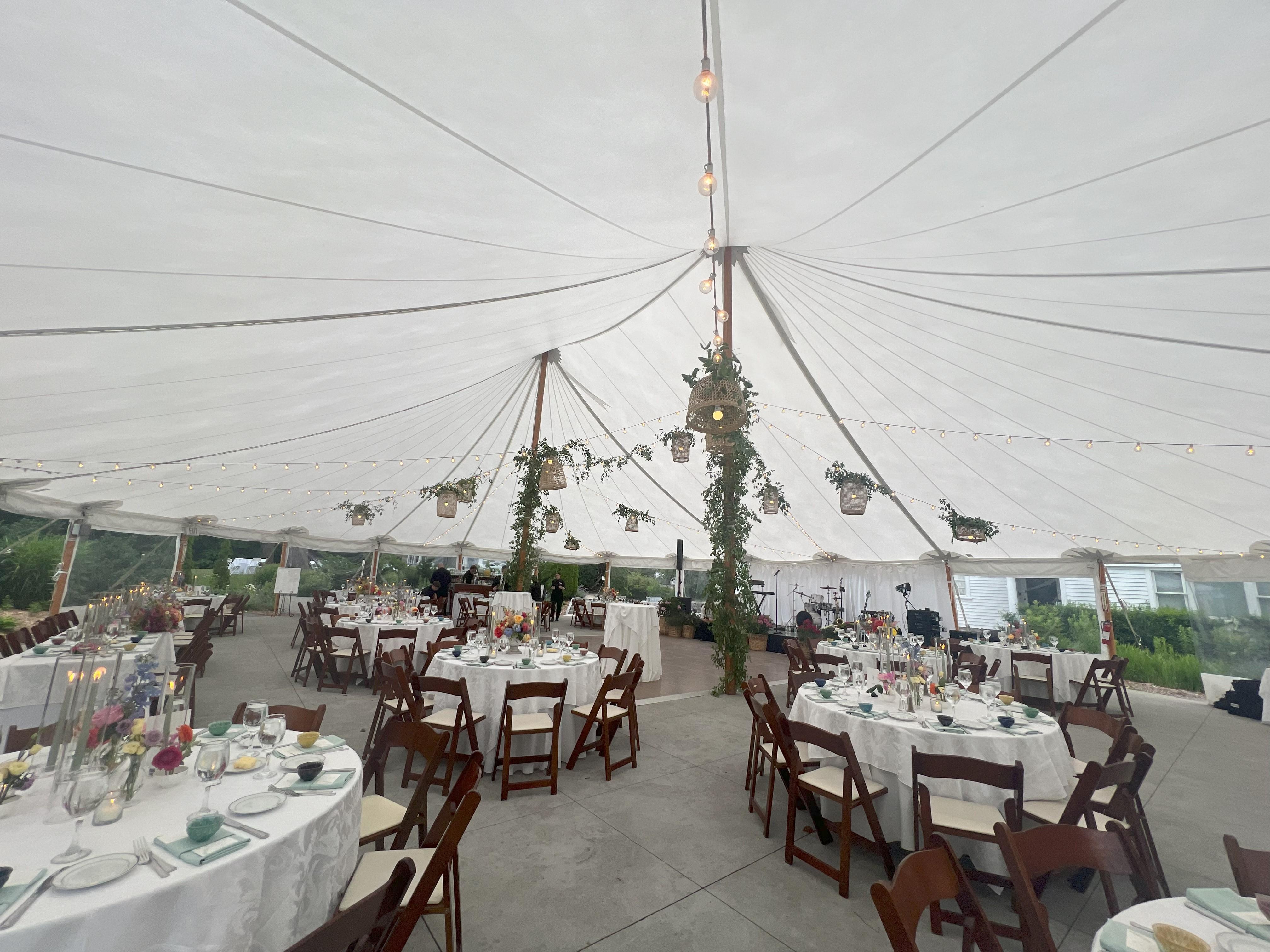 Tent includes clear sides, dance floor, bistro lighting, tables, chairs and heat as needed.