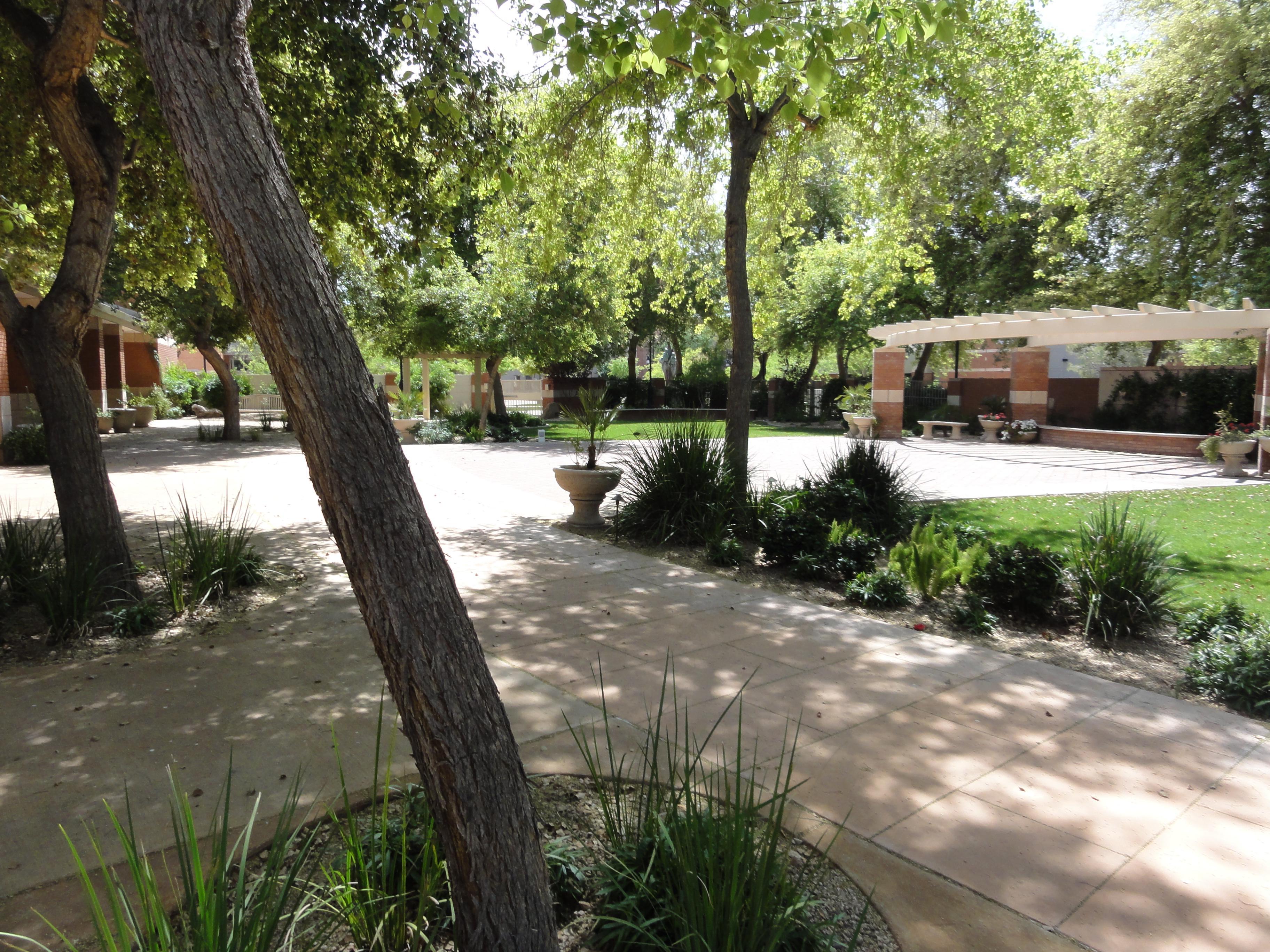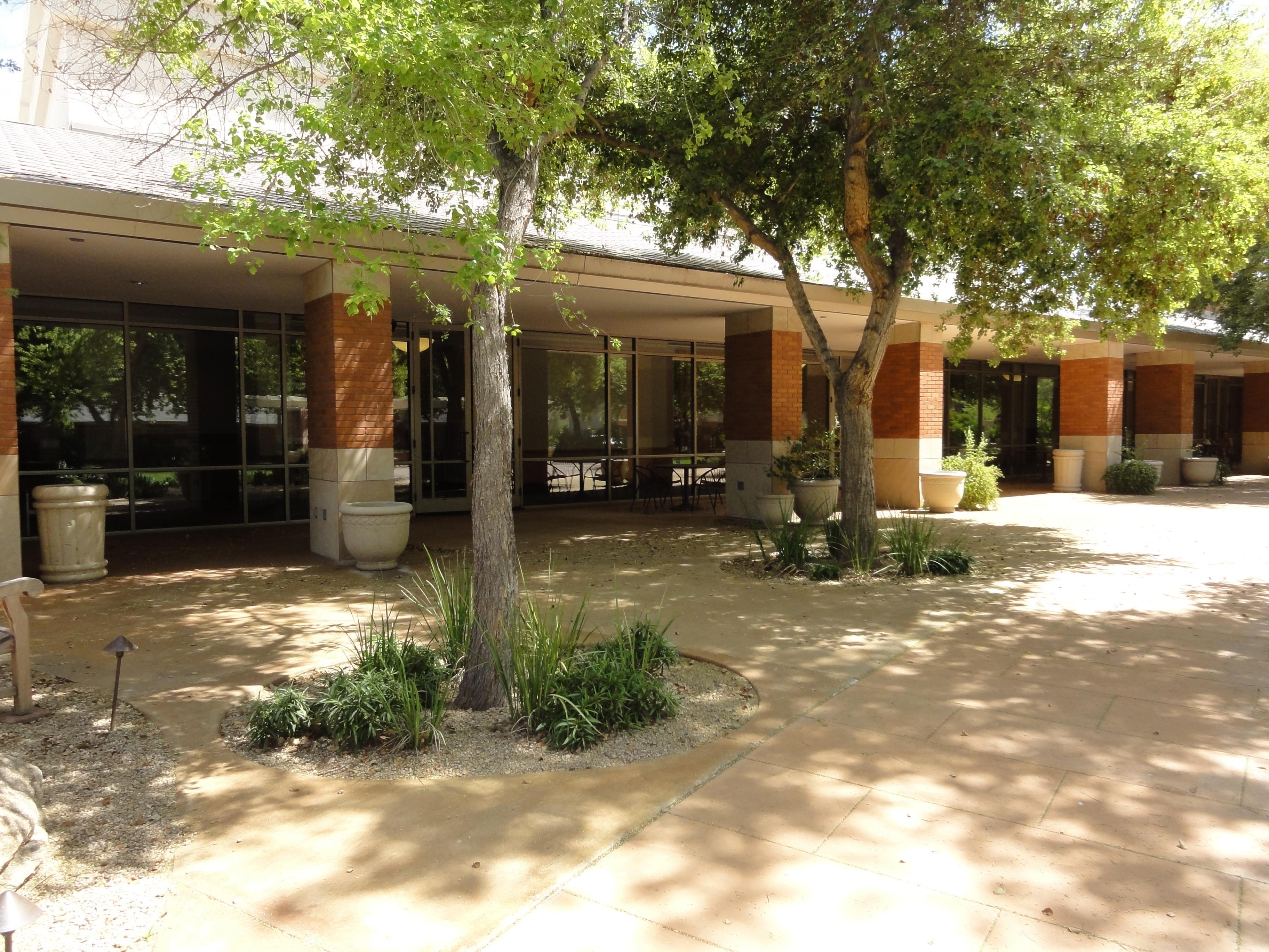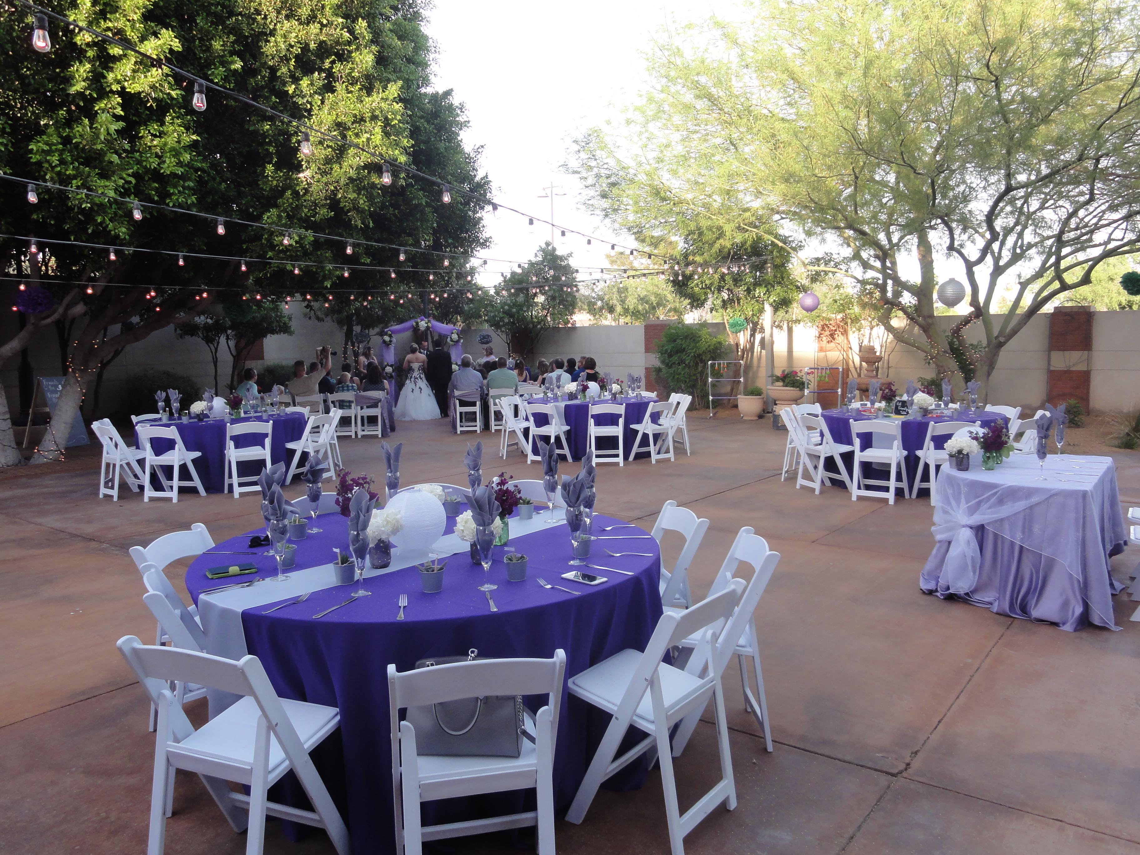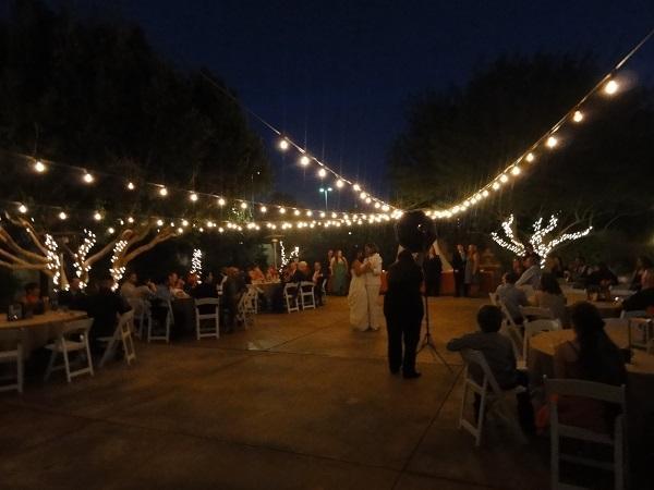 This intimate Garden Courtyard setting has warm stained concrete surrounded by a giant shade trees and green plants. Overhead hangs ambient romantic bistro lighting that sparkles above while twinkle lights wrap the trees for a sparkling night effect.