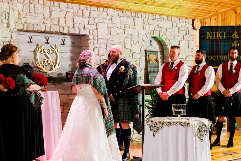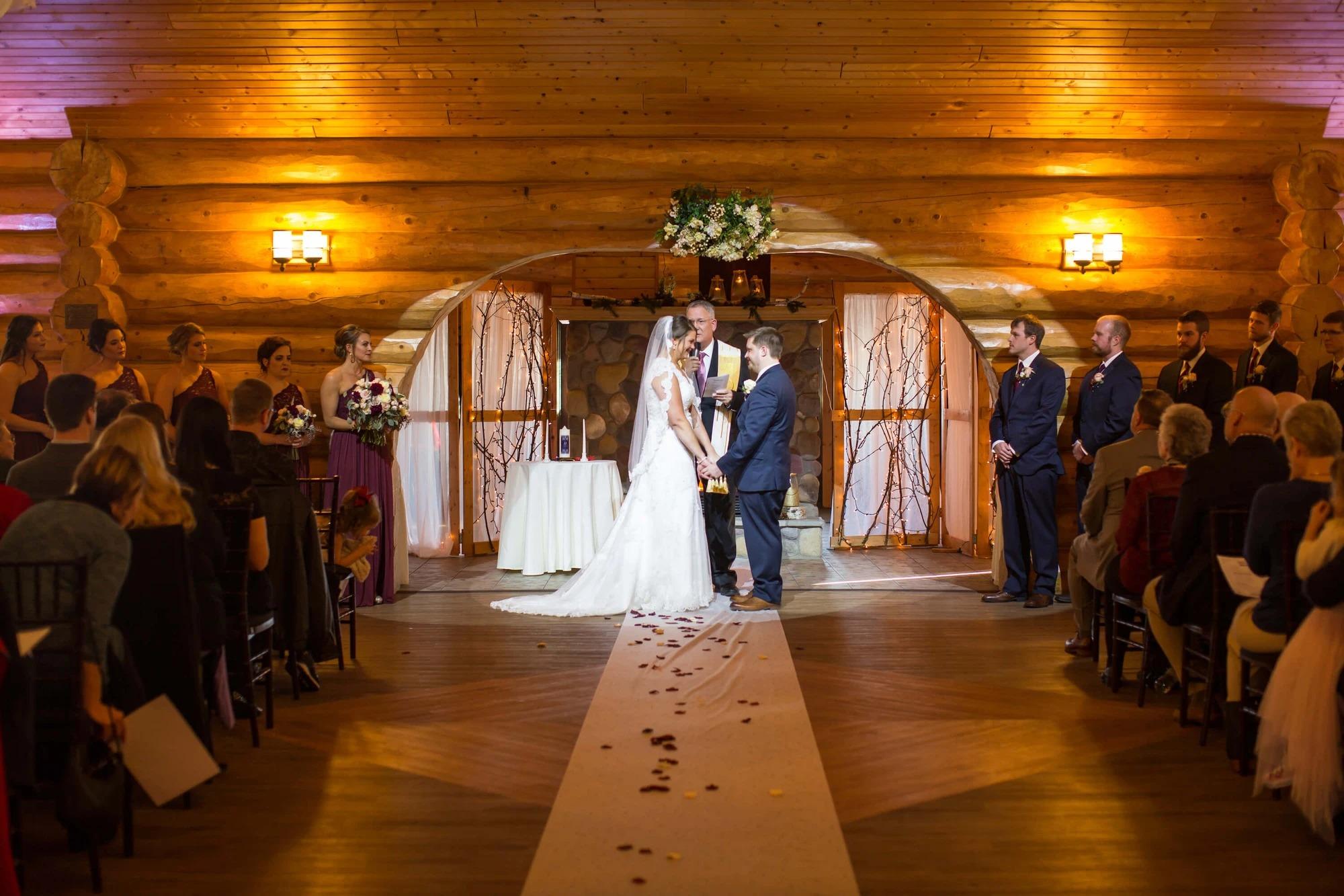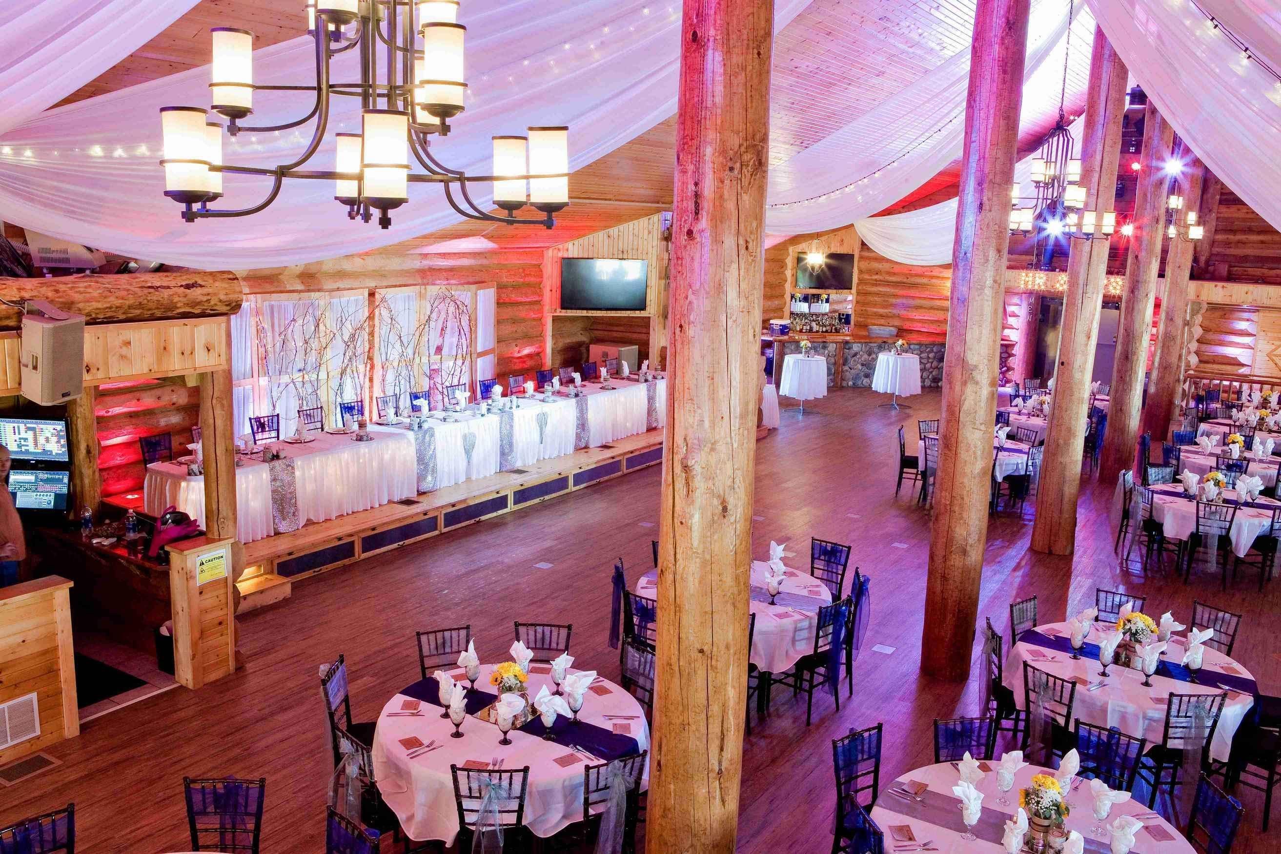 Exchange vows outdoors before our enchanting stone moon gate, framed by a lush forest of towering pines for a breathtaking natural backdrop. For a cozy and intimate affair, opt for our indoor hall. The warm, ambient lighting accentuates the stunning log-cabin architecture and a grand stone hearth, creating a deeply romantic atmosphere for your ceremony, no matter the season.