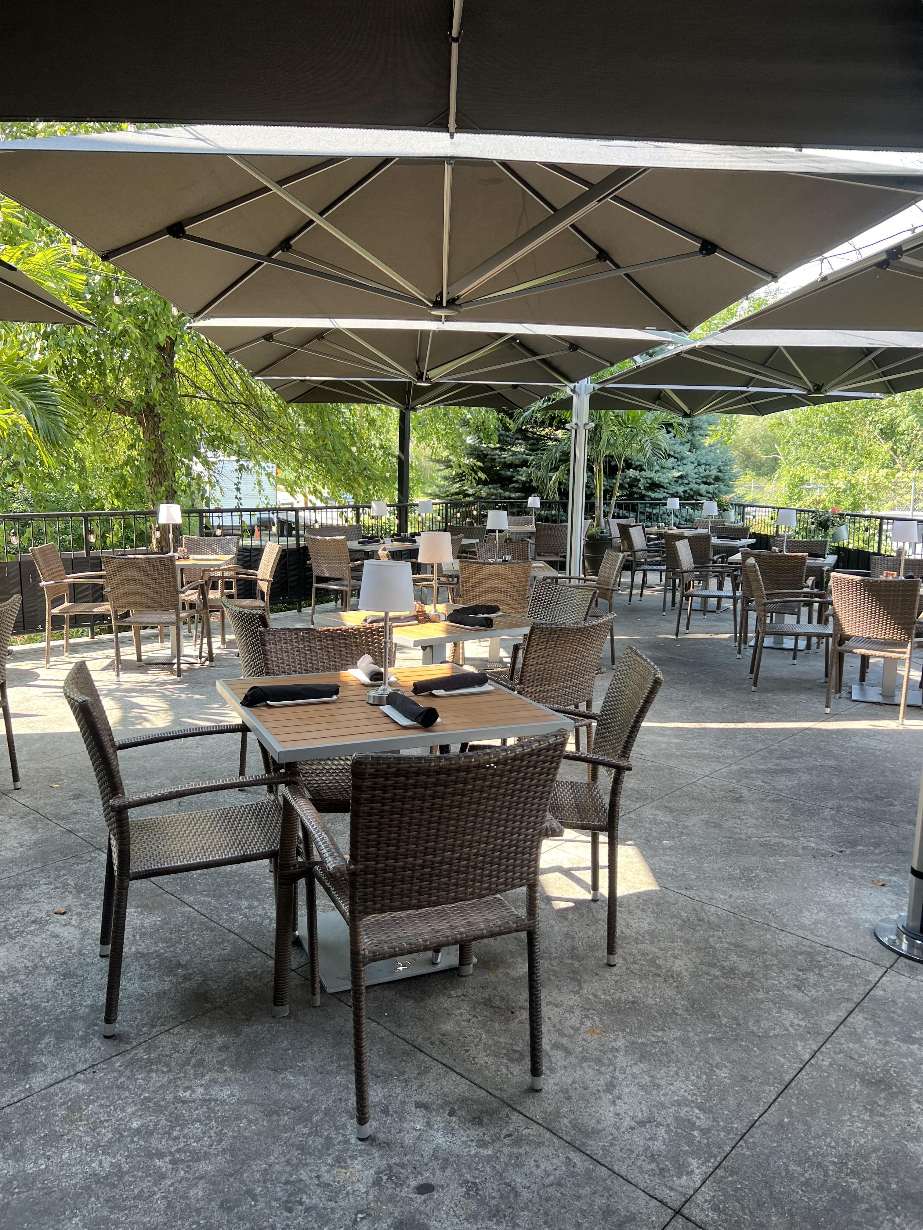 - string lights across the patio - umbrellas available - outdoor speakers - tables and chairs - mobile bar