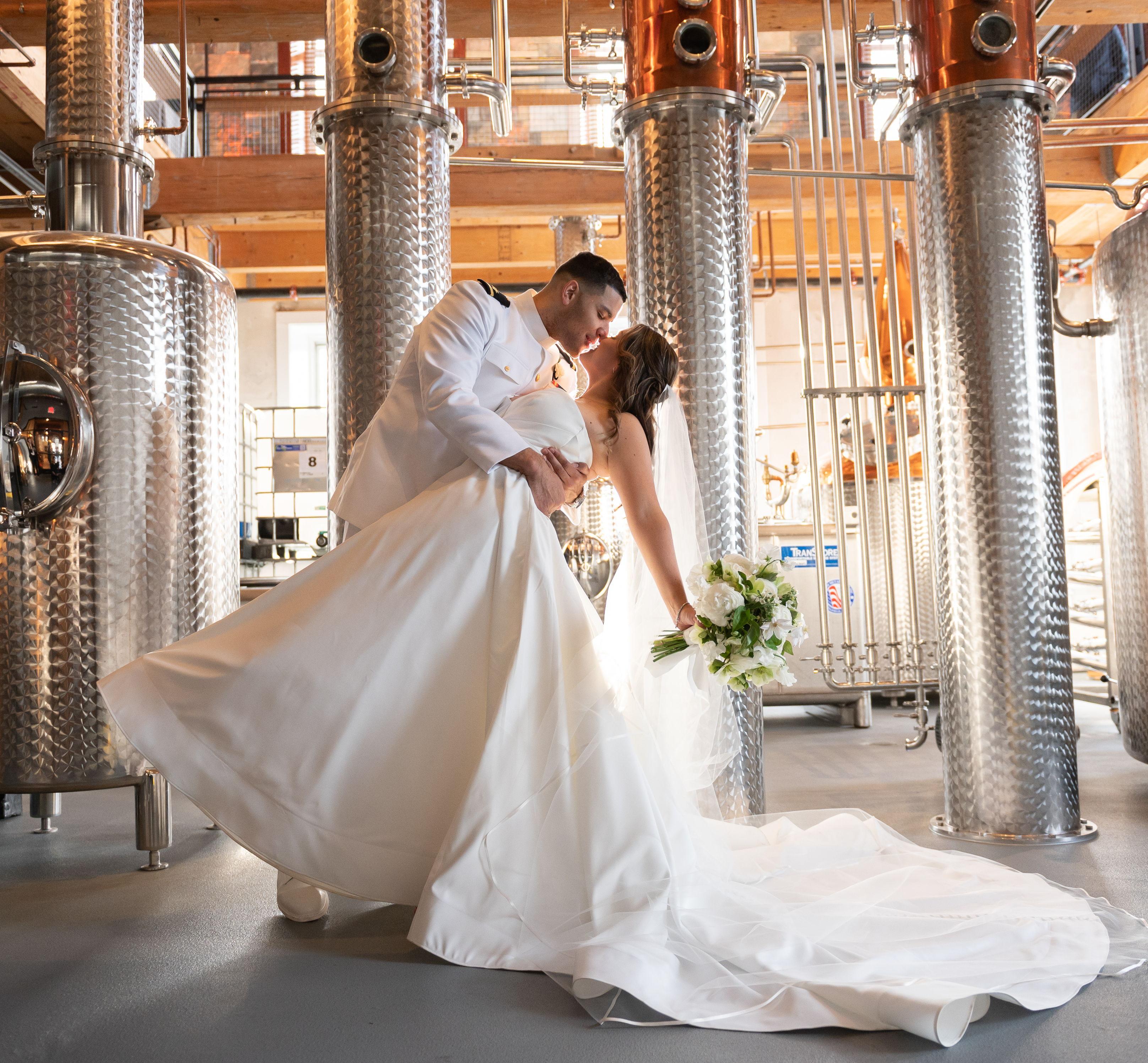 PROOF Speakeasy offers a large event space to hold your special day. With an expansive copper-topped bar in the middle, this space lends itself to transitioning between nuptial events seamlessly. One side offers a unique overlook into the distillery below with our Vodka columns