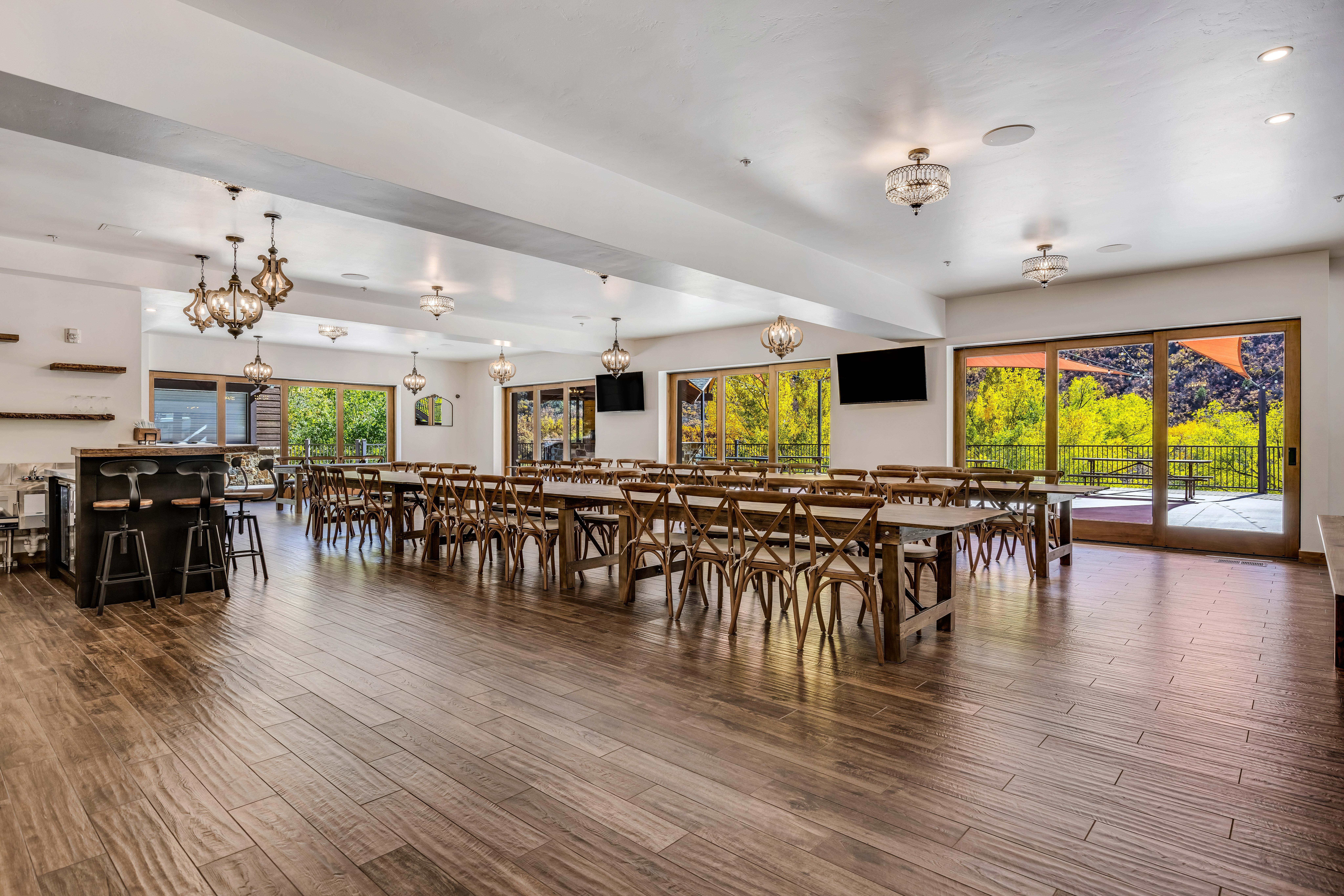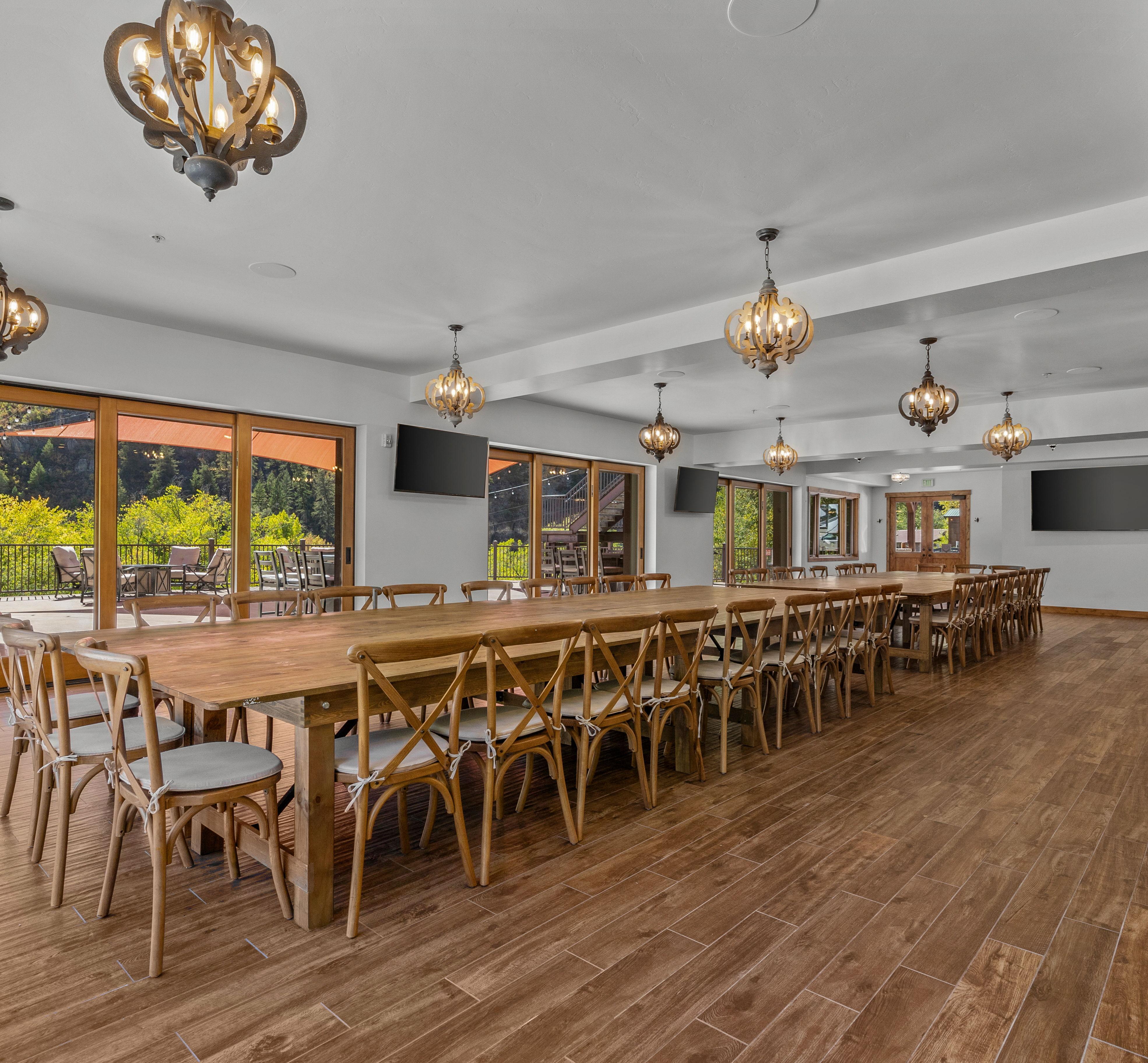 10 Farmhouse Tables 140 Farmhouse Chairs with cushions A built-in Indoor Bar 3 large Flat Screen Monitors A sonos system