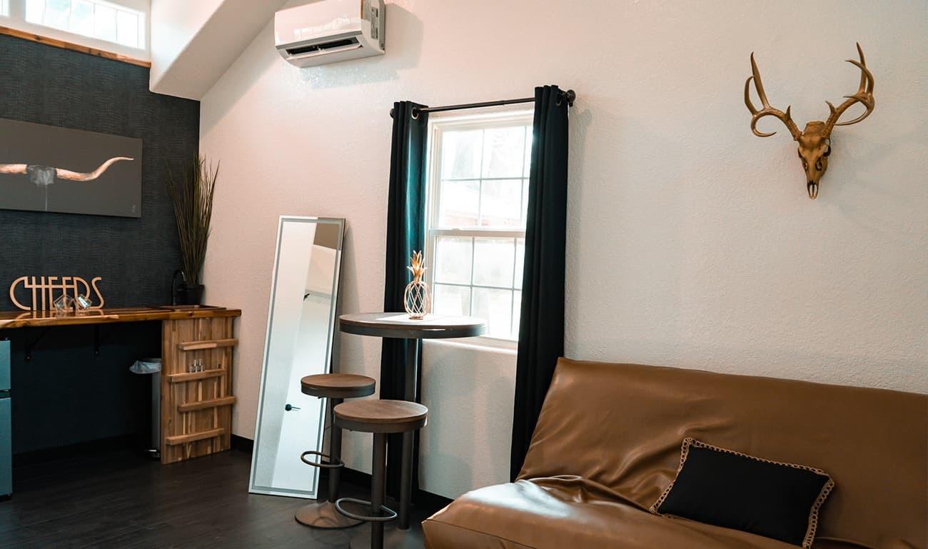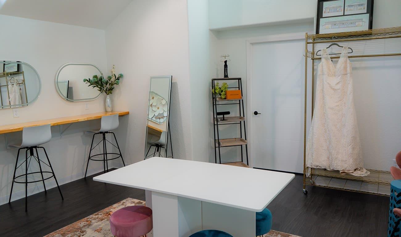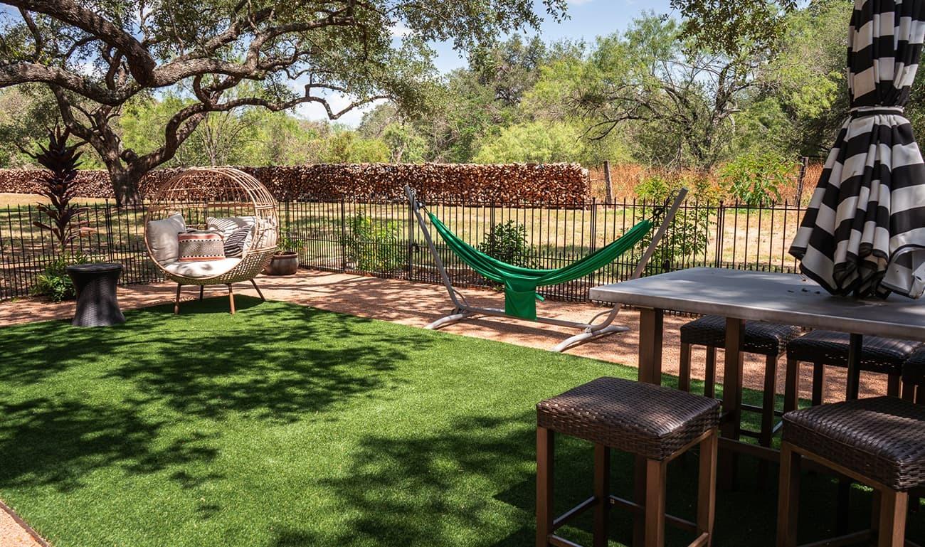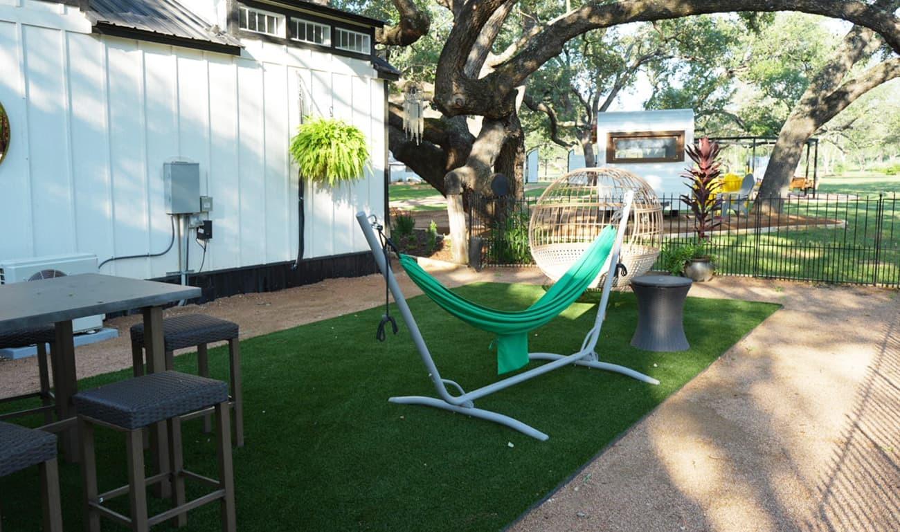 The bride’s and groom’s rooms, both fully air-conditioned, are thoughtfully designed for comfort and privacy. Each comes with an en-suite bathroom, a wet bar (though guests should note that alcohol isn’t provided), and their own private outdoor relaxation zone. The bride can unwind in her secluded area, featuring a soothing swinging chair and a hammock, while the groom can enjoy the shade of a covered gazebo and engage in a round on the mini putting green. Moreover, situated nearby is an outdoor bar, ready to mix and serve your favorite cocktails. For those looking for a cozy ambiance, there’s a firepit circled with swinging chairs, perfect for intimate gatherings under the stars.
