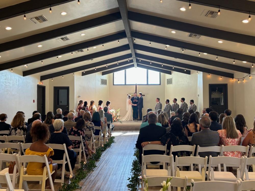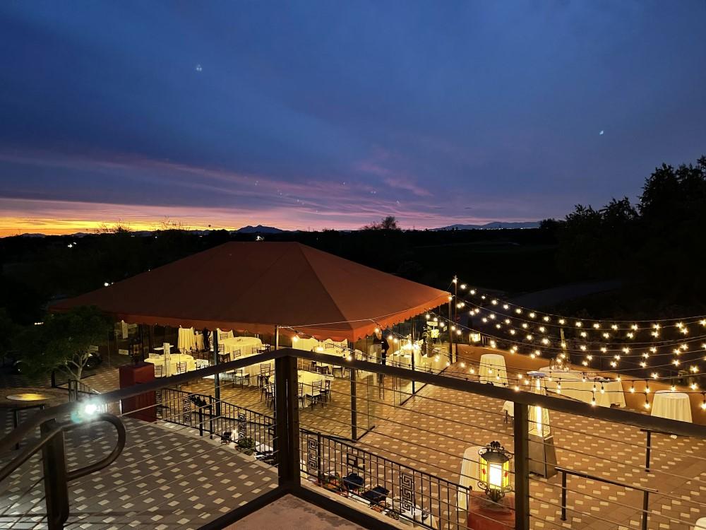 Our Upper Town Hall offers a charming indoor setting with oversized windows framing the Superstition Mountains. The exposed ceiling beams and bistro lighting create a warm and inviting atmosphere. This space is fully climate-controlled and is also available as a rain plan for outdoor ceremonies.