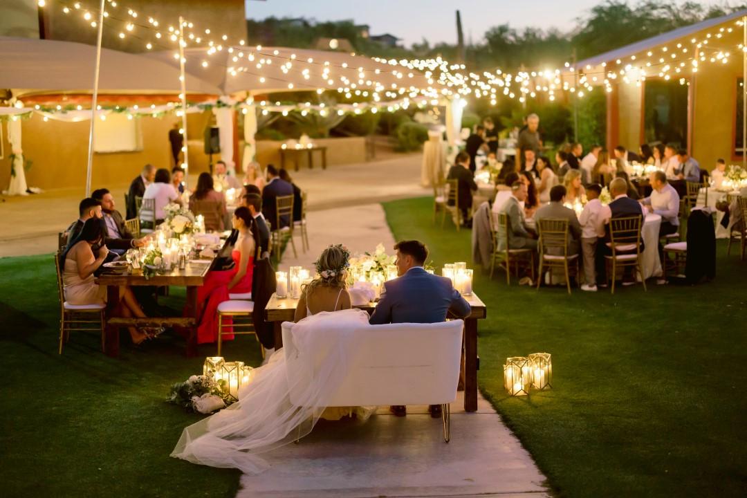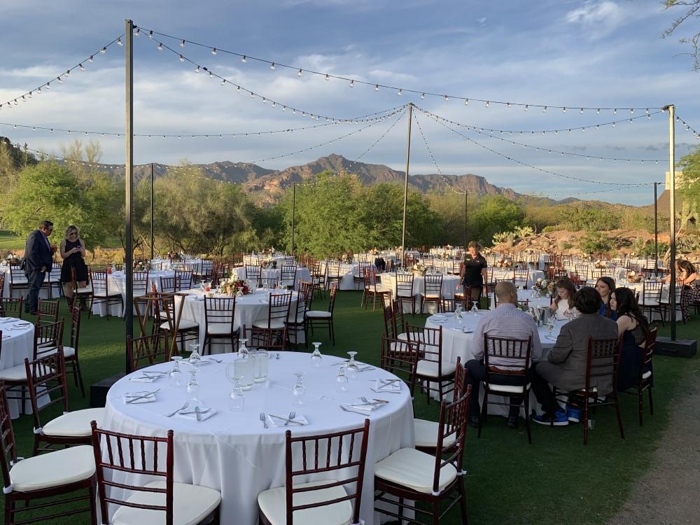 Our Upper Lawn Area is our most popular choice for outdoor ceremonies, offering breathtaking views of the Superstition Mountains. For those who prefer an entirely outdoor experience, the Lower Lawn Area can be transformed into a picturesque dinner reception space. Dancing would take place under the adjacent lighted pavilion. This convenient location is perfect for a seamless transition between ceremony, cocktail hour, and reception. Lawn lighting is available for an additional fee.