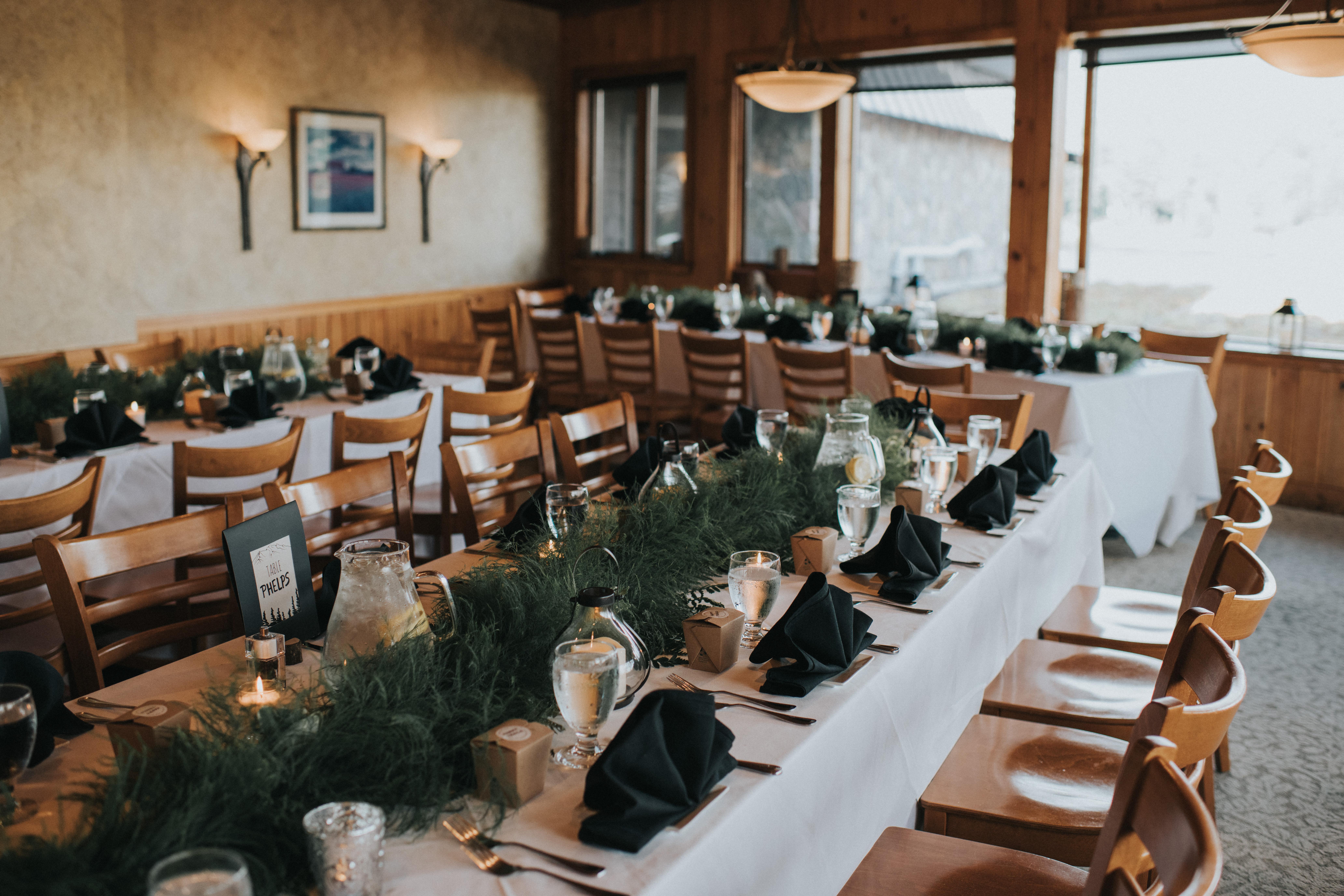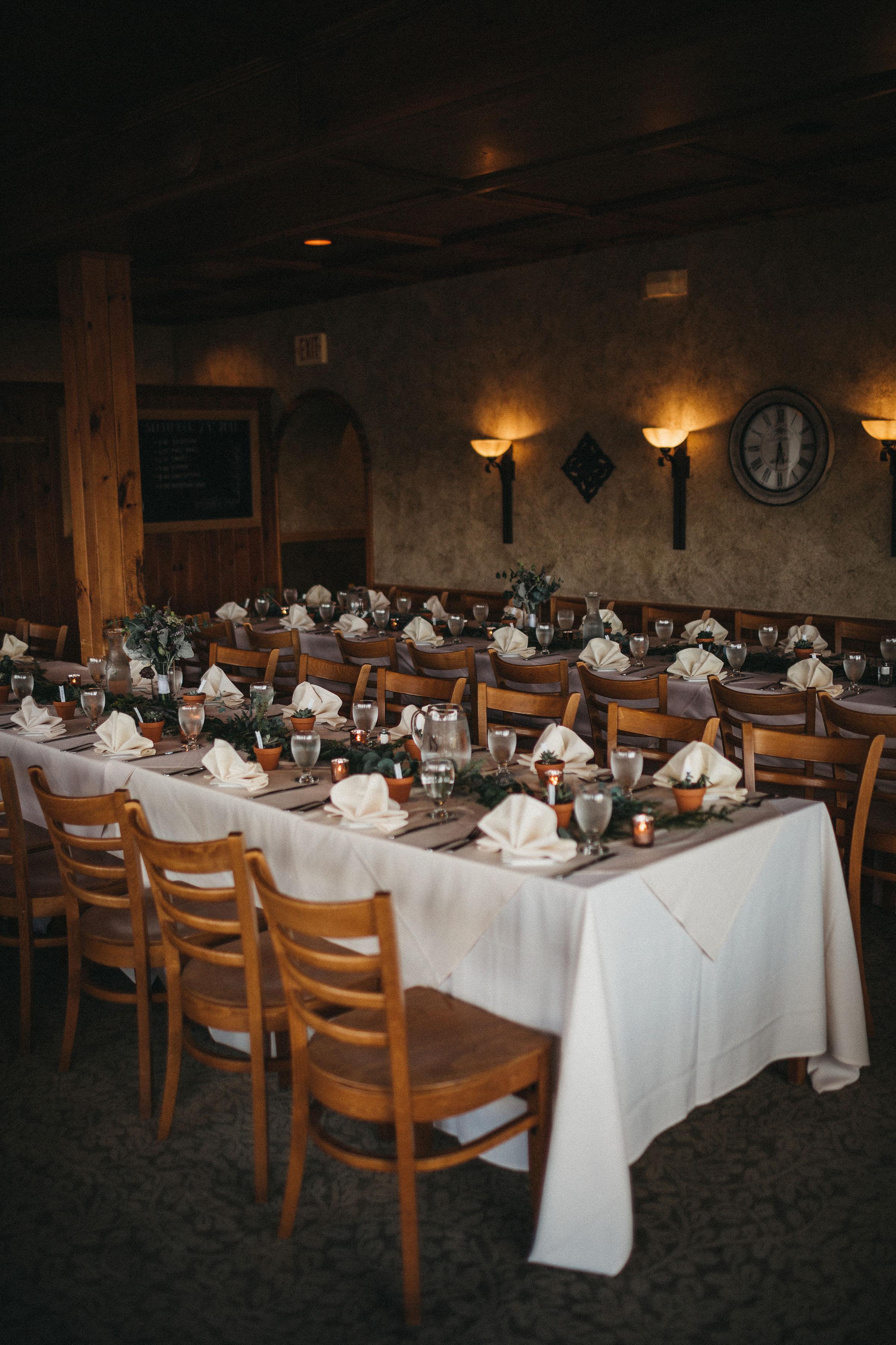 This private upstairs dining room, located above Generations Restaurant, is brightly lit with views of the high peaks. It also features a fireplace in the event space.