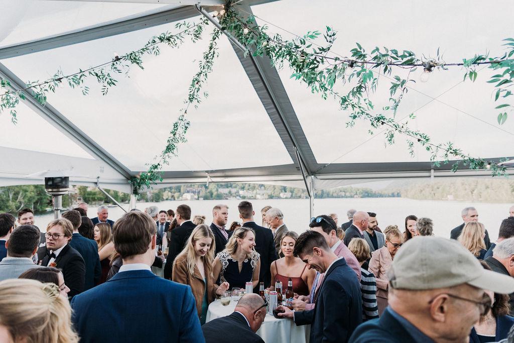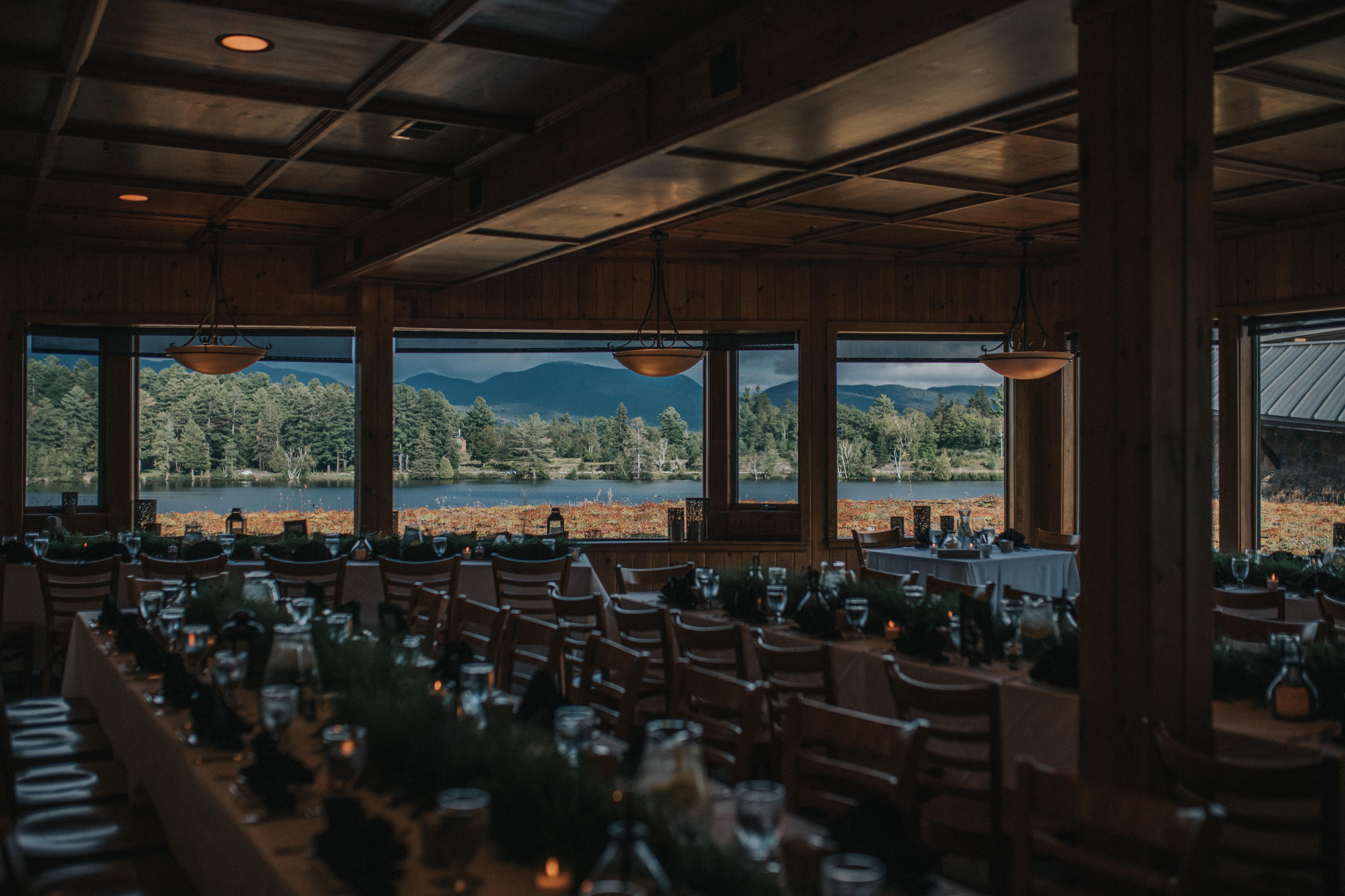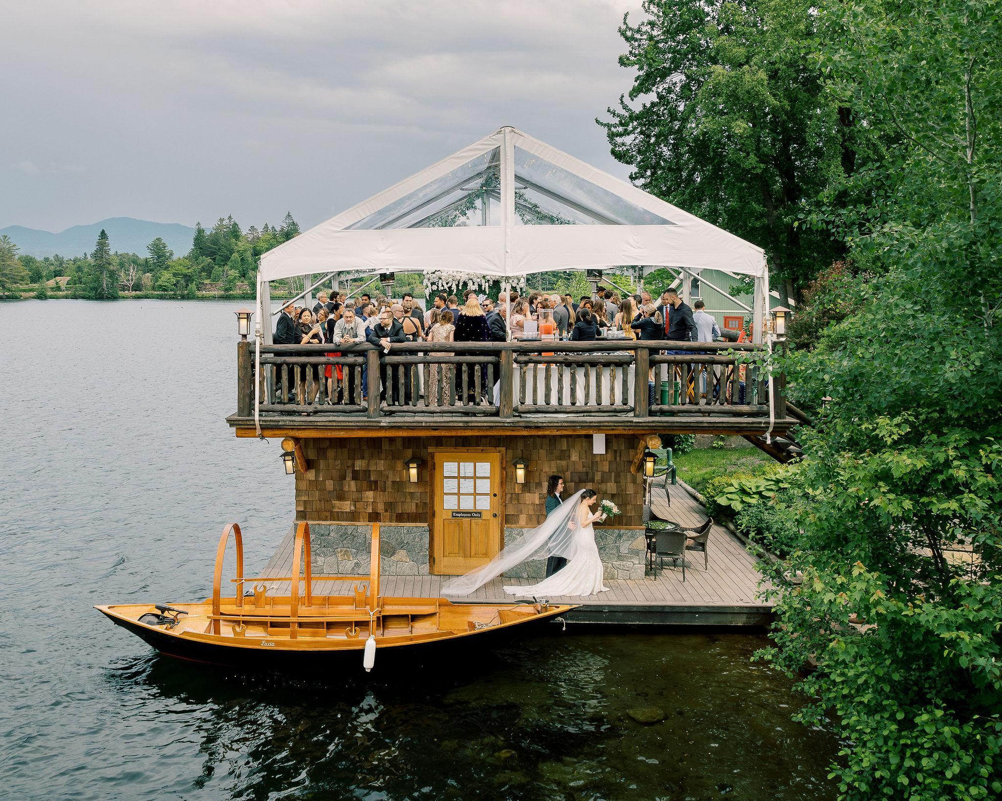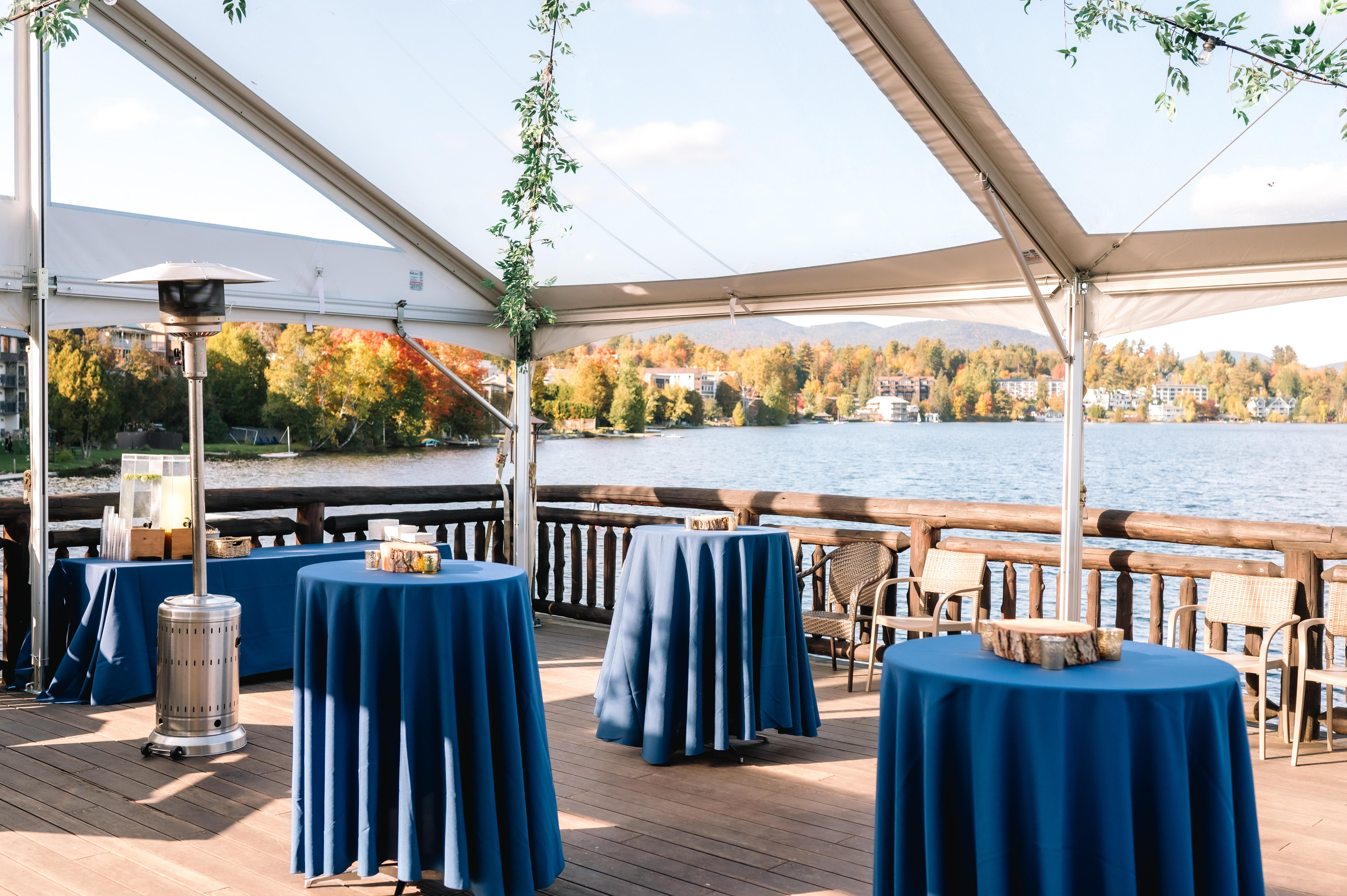 Our rustic boathouse offers a great location for an outdoor cocktail or smaller wedding ceremony. Overlooking Mirror Lake, you and your guests will love the view of the Adirondack Mountains. May through October, the boathouse has a clear-top tent complete with bistro lighting and greenery. *Overall capacity will be different for a ceremony versus cocktail hour