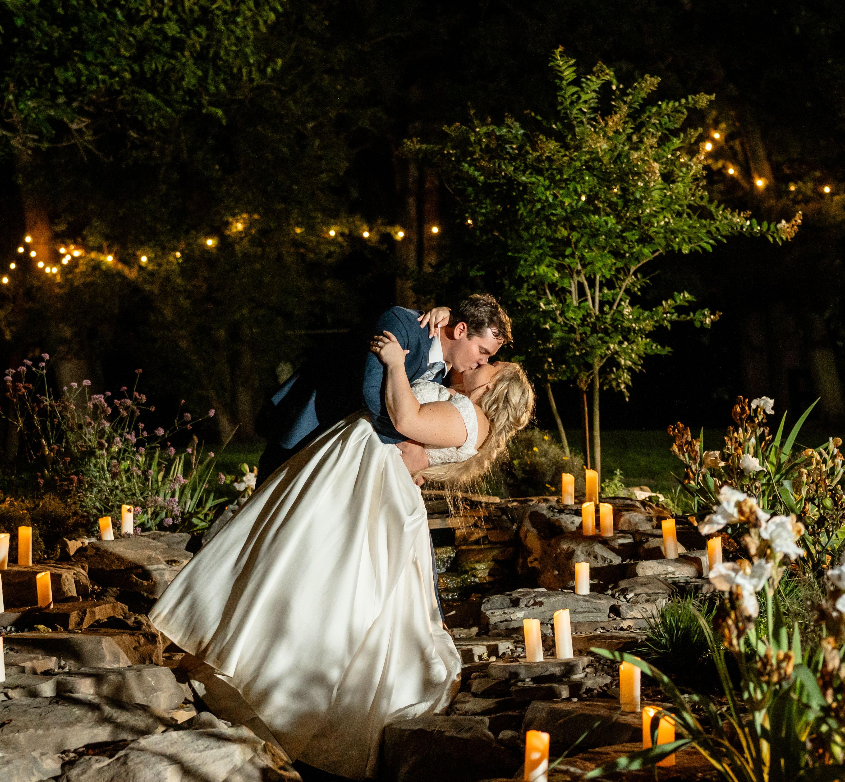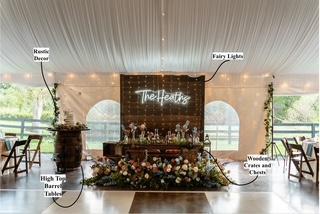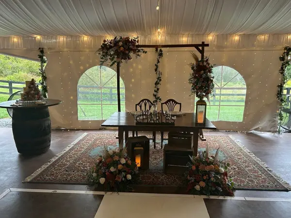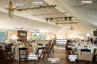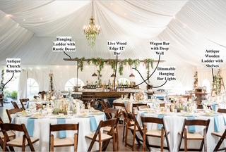-wagon bar -elegant draping and rustic decor -uplighting and chandeliers -live wood edge farm table -padded fruitwood chairs -checkerboard dance floor -high top barrel tables -cathedral window sidewalls -rustic decor -luxury four stall A/C restrooms -Koi pond, gazebo and outdoor fireplace site just outside tent