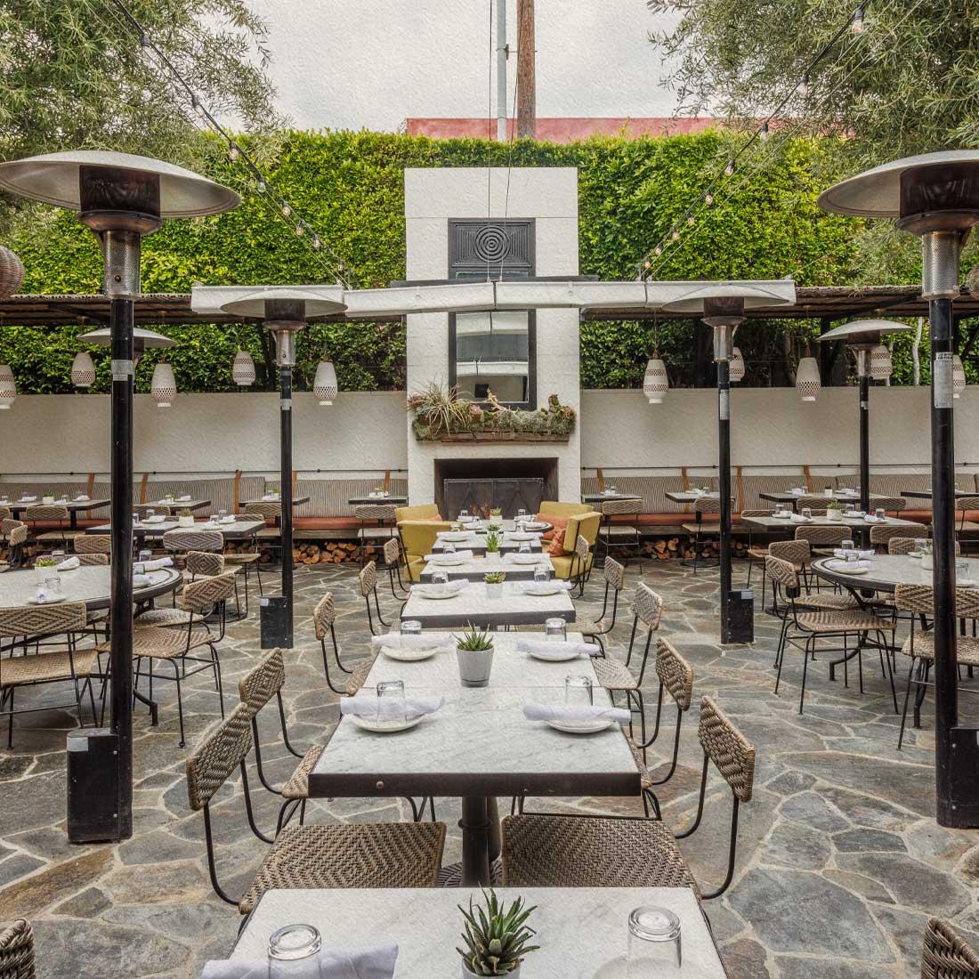 Celebrate outdoors on our private Full Patio, with olive trees, string lights, and a fireplace backdrop—perfect for intimate receptions or brunches.