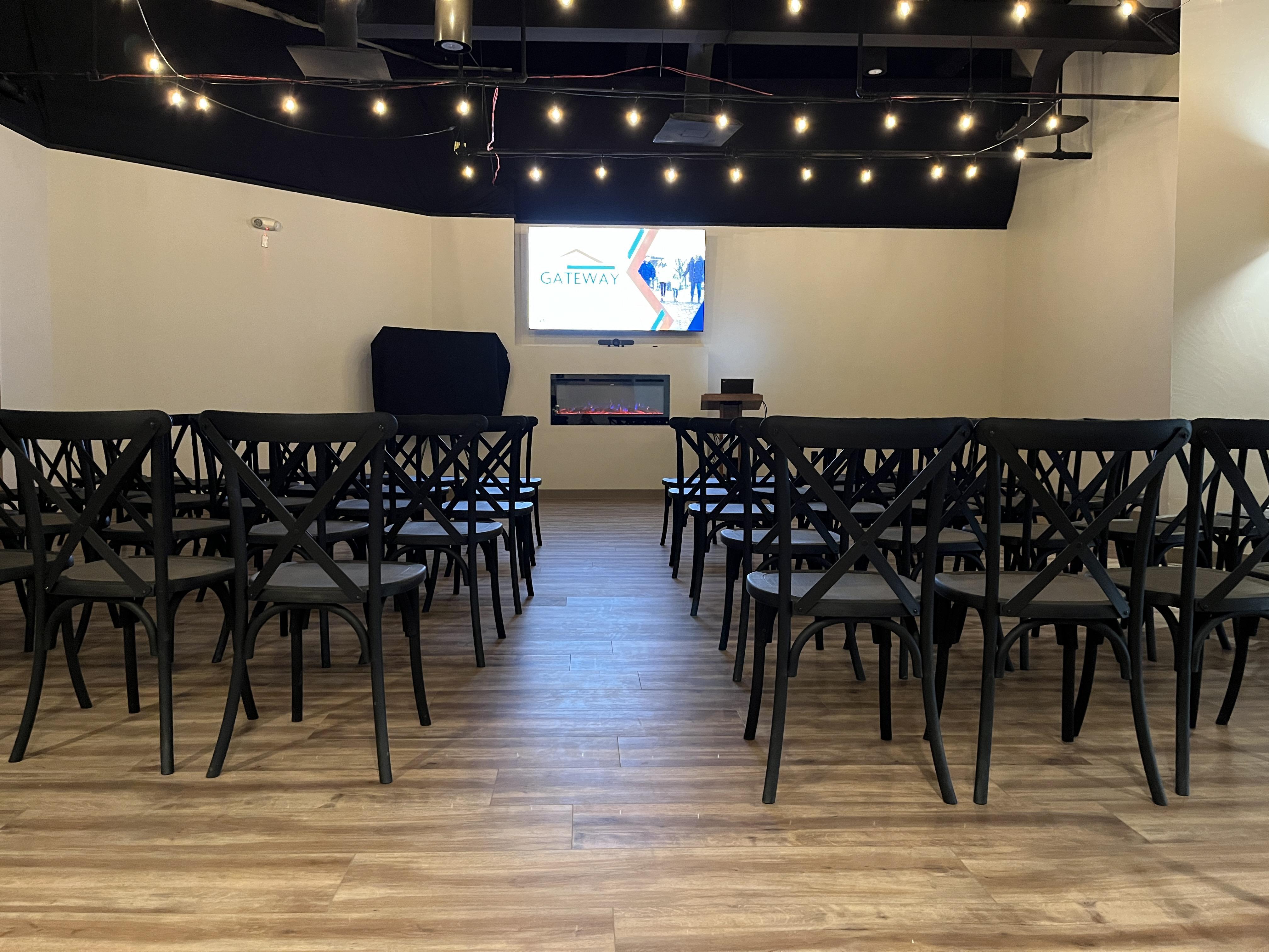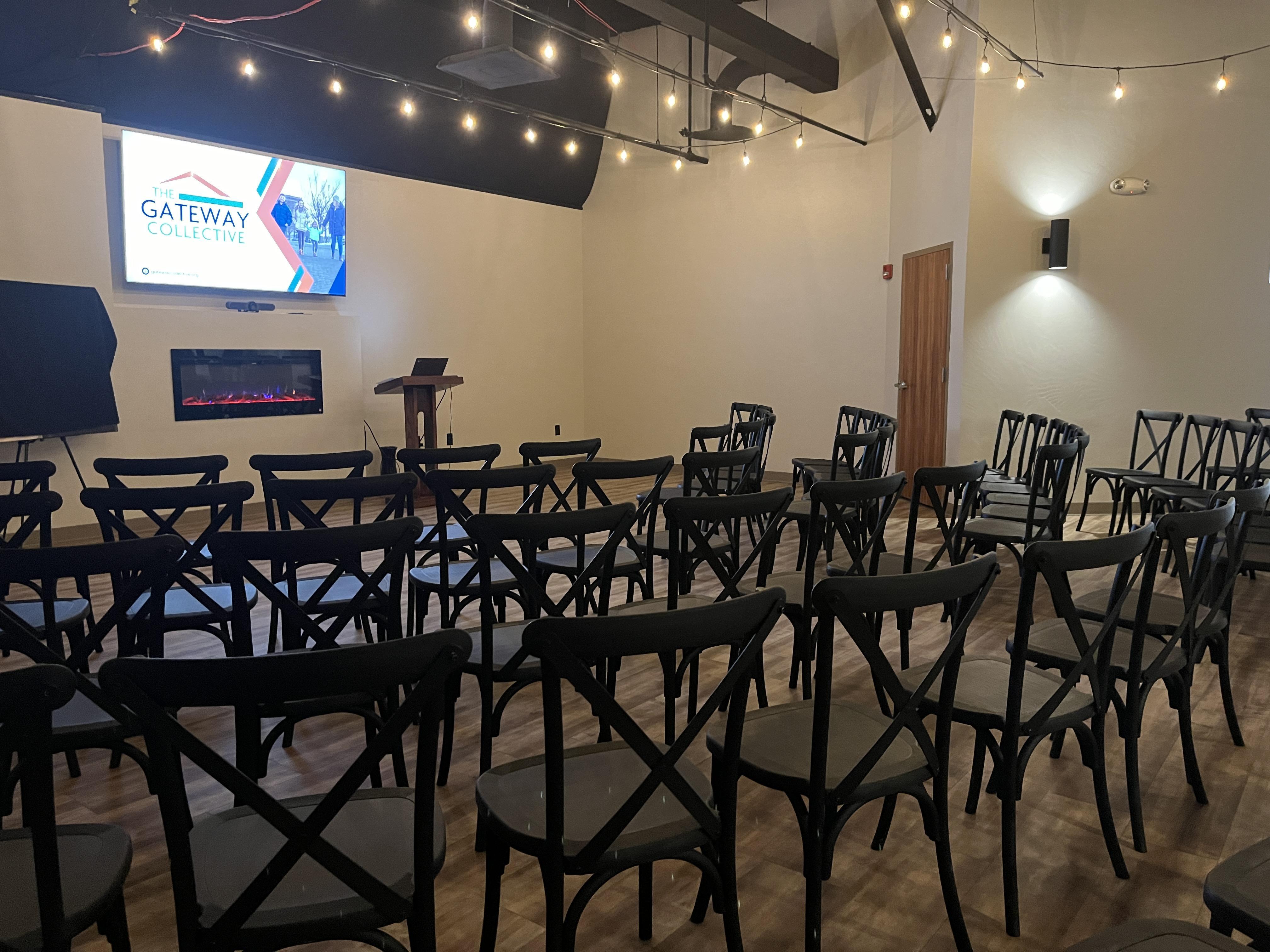 - Monitor with computer hookups - Bistro lights - Tables/chair - Tablecloths (optional) - 2 wall fireplaces - Cozy seating area