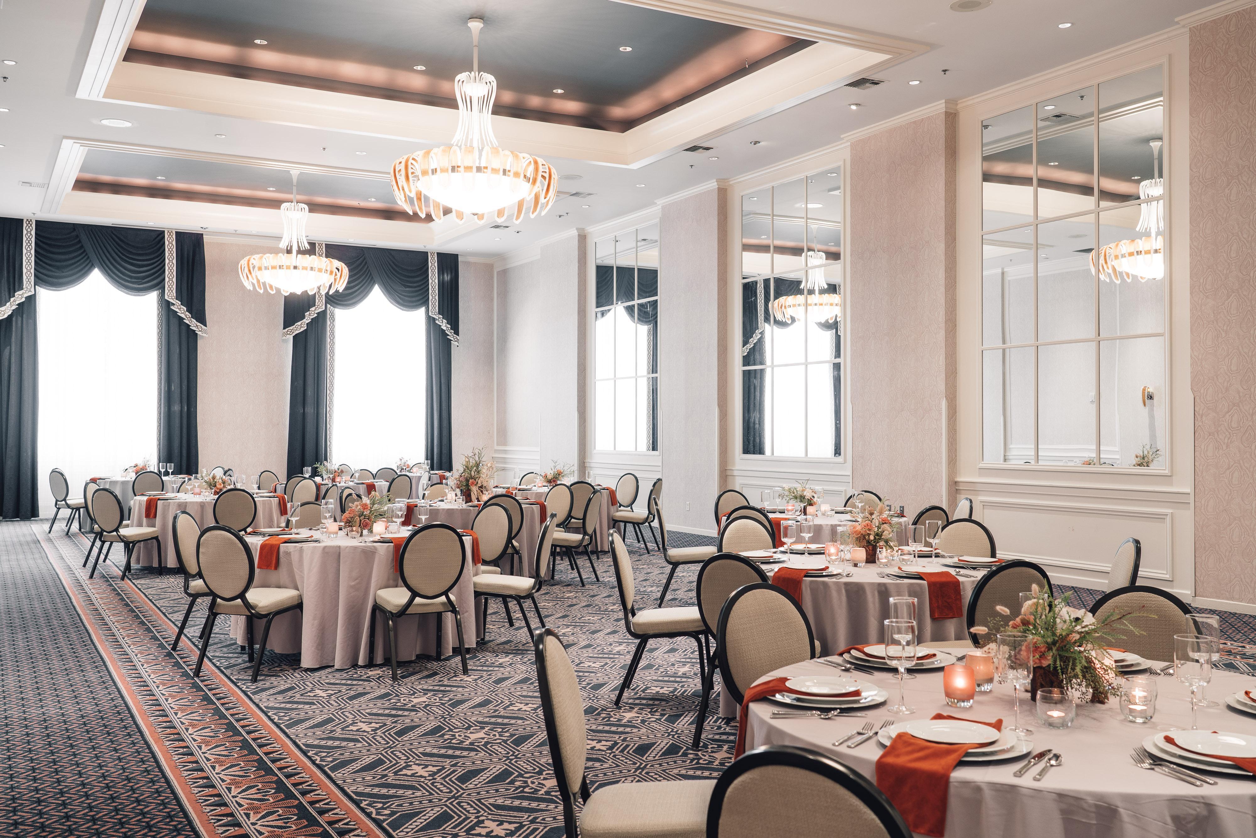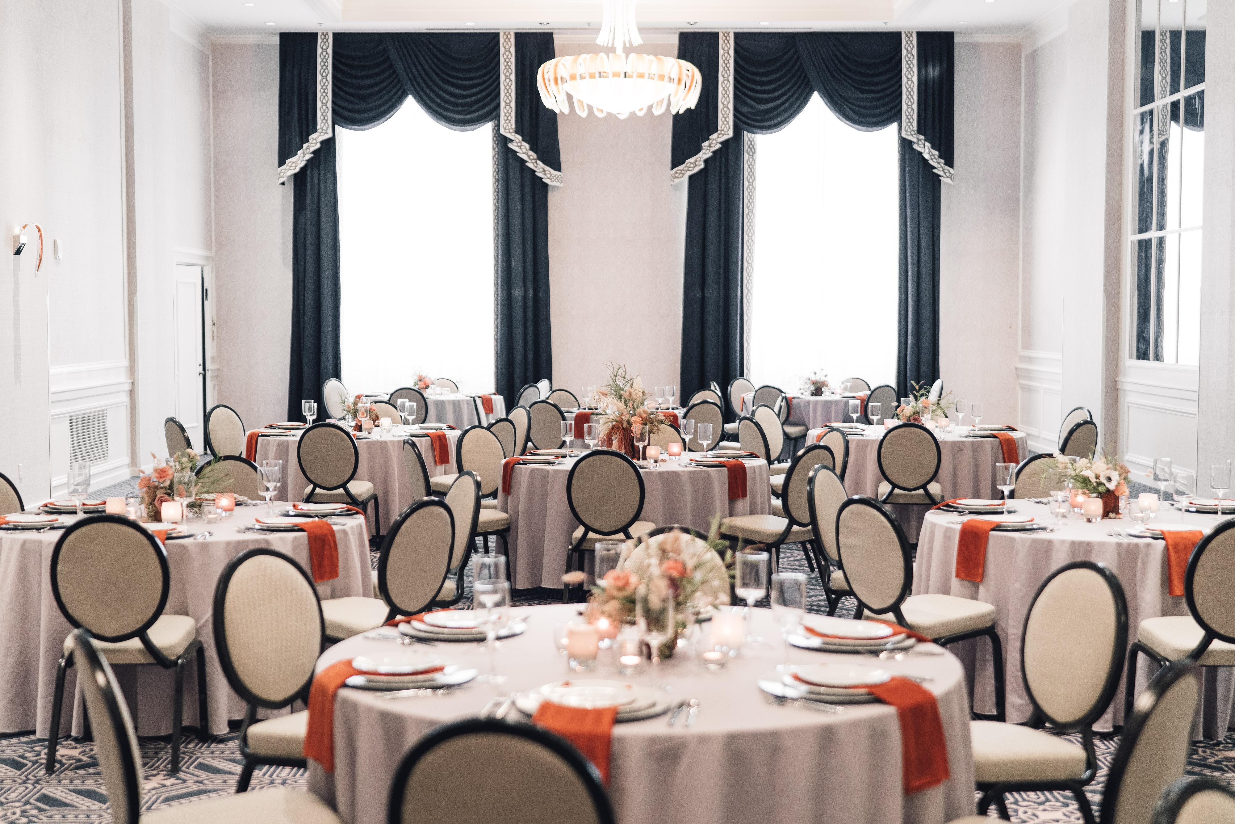 - Large art-deco chandeliers - Dimmers for total lighting customization - 60" Round Tables - Cream Colored Padded Banquet Chairs - Additional tables for gifts, guestbook, or vendors - Large windows for natural lighting