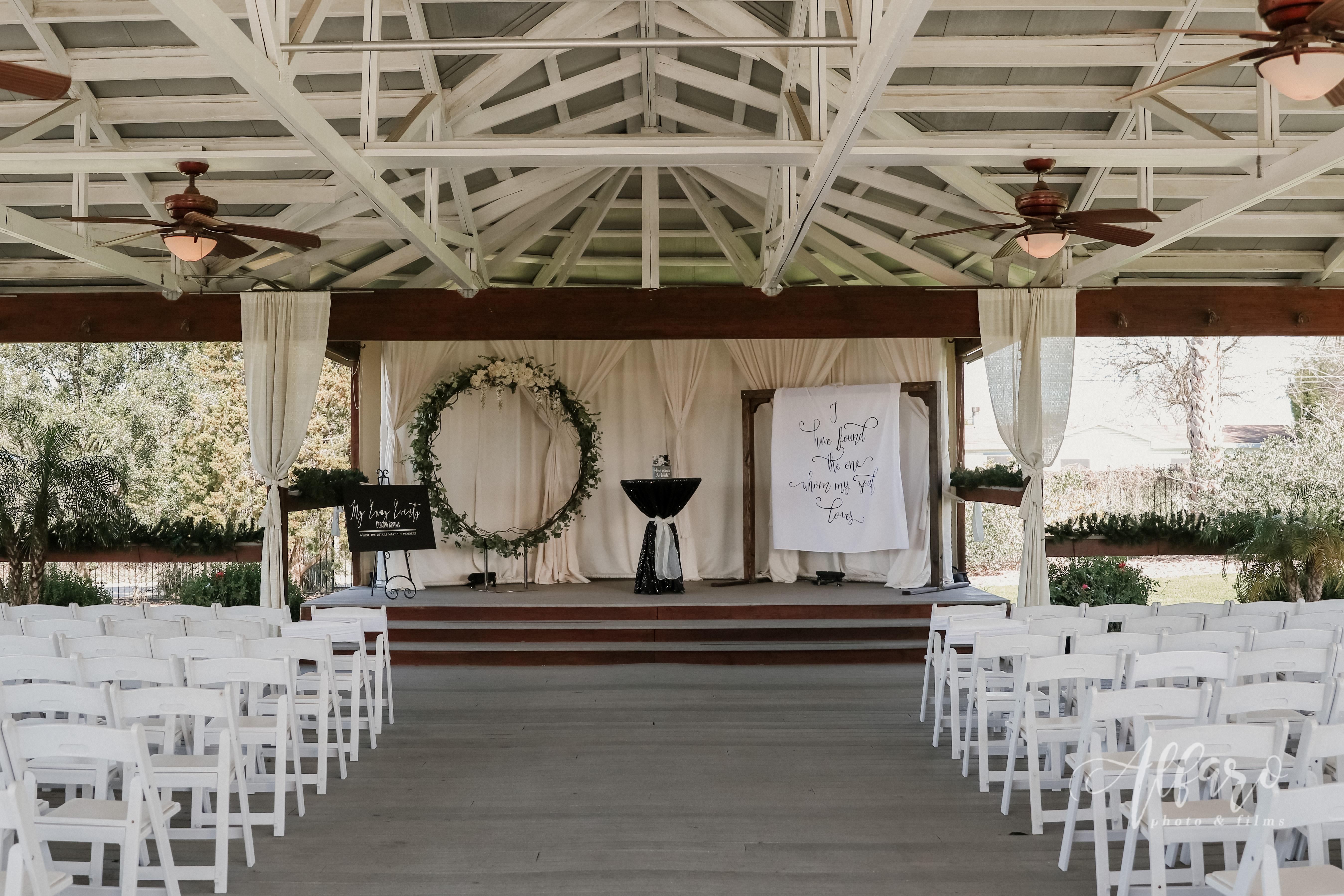 Our 5,000 sq ft. glass-enclosed Ballroom has exceptional views of our grounds and features a large crystal chandelier with vaulted ceilings. Our plush bridal suite has plenty of space for you to relax before the ceremony. Our 2,800 sq. ft. covered wrap-around porch is an ideal location to host a cocktail hour. Adjacent to the Ballroom is our ceremony area. It is a covered, open-air pavilion with numerous ceiling fans and a raised altar which gives every guest the perfect view of the couple.