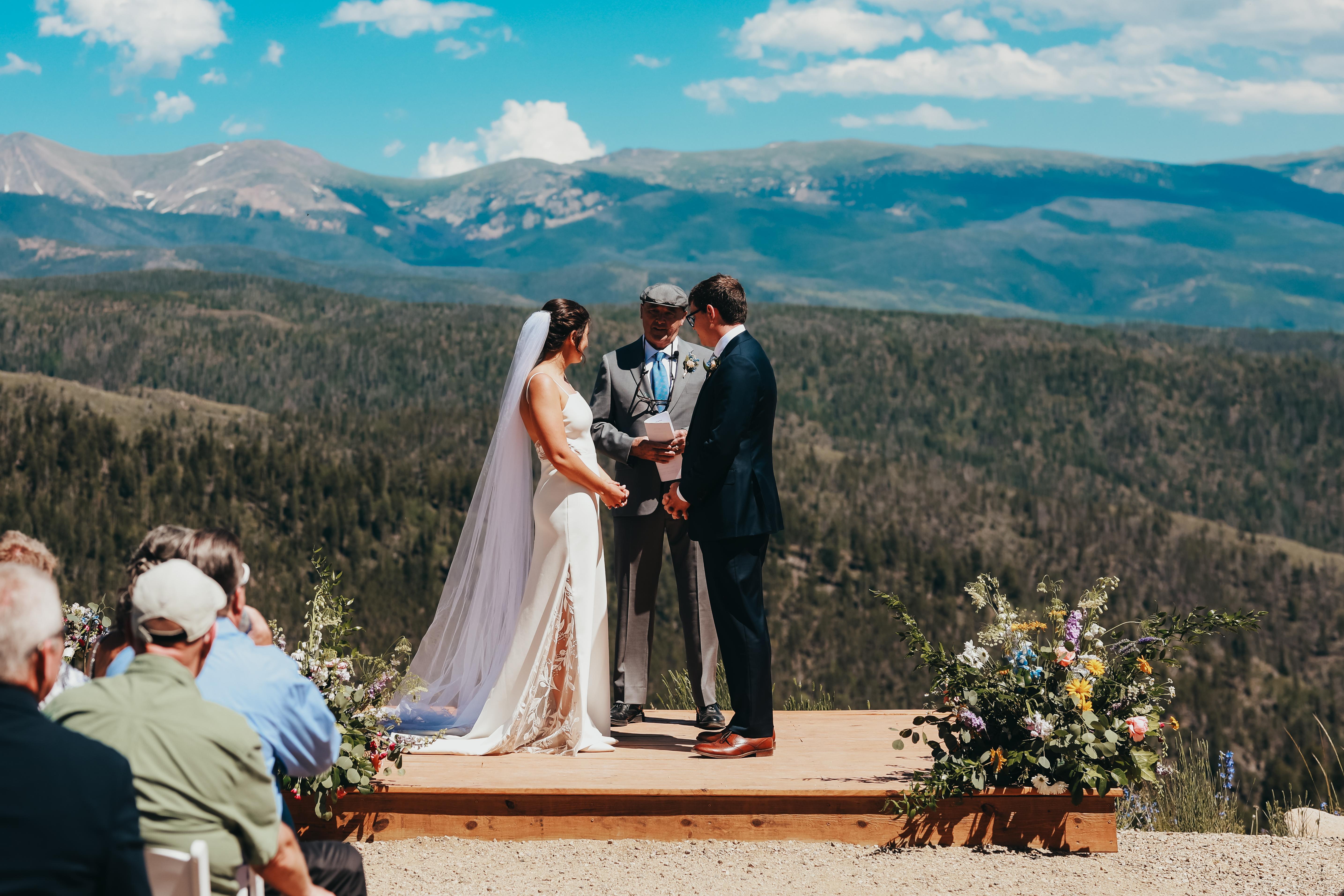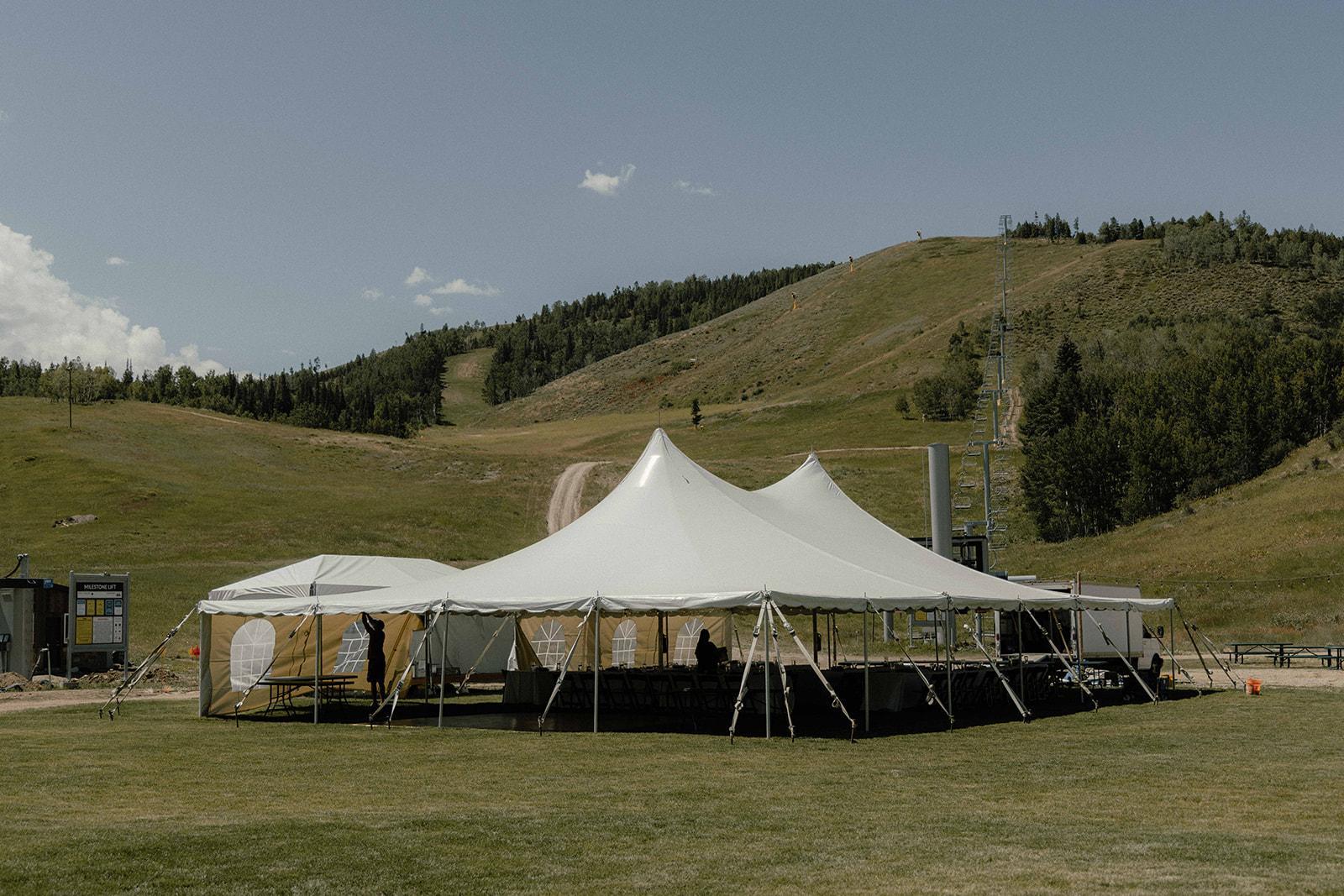 The ceremony site is accessed by chairlift. You and your guests will arrive to a secluded Aspen grove on a flower-filled mountaintop, where you’ll exchange vows overlooking the breathtaking Continental Divide. The wedding party will have access to our special Mountain Yurt where you can enjoy mimosas and apply finishing touches before the ceremony. After the ceremony, your guests can relax at the base lawn area, enjoy cocktails and play lawn games while they wait for you to chairlift down the mountain. •• Available May-Sept, Thurs-Sun paired with reception venue. “Ceremony Only” May-Sept, Thurs and non-holiday weeks during winter ••