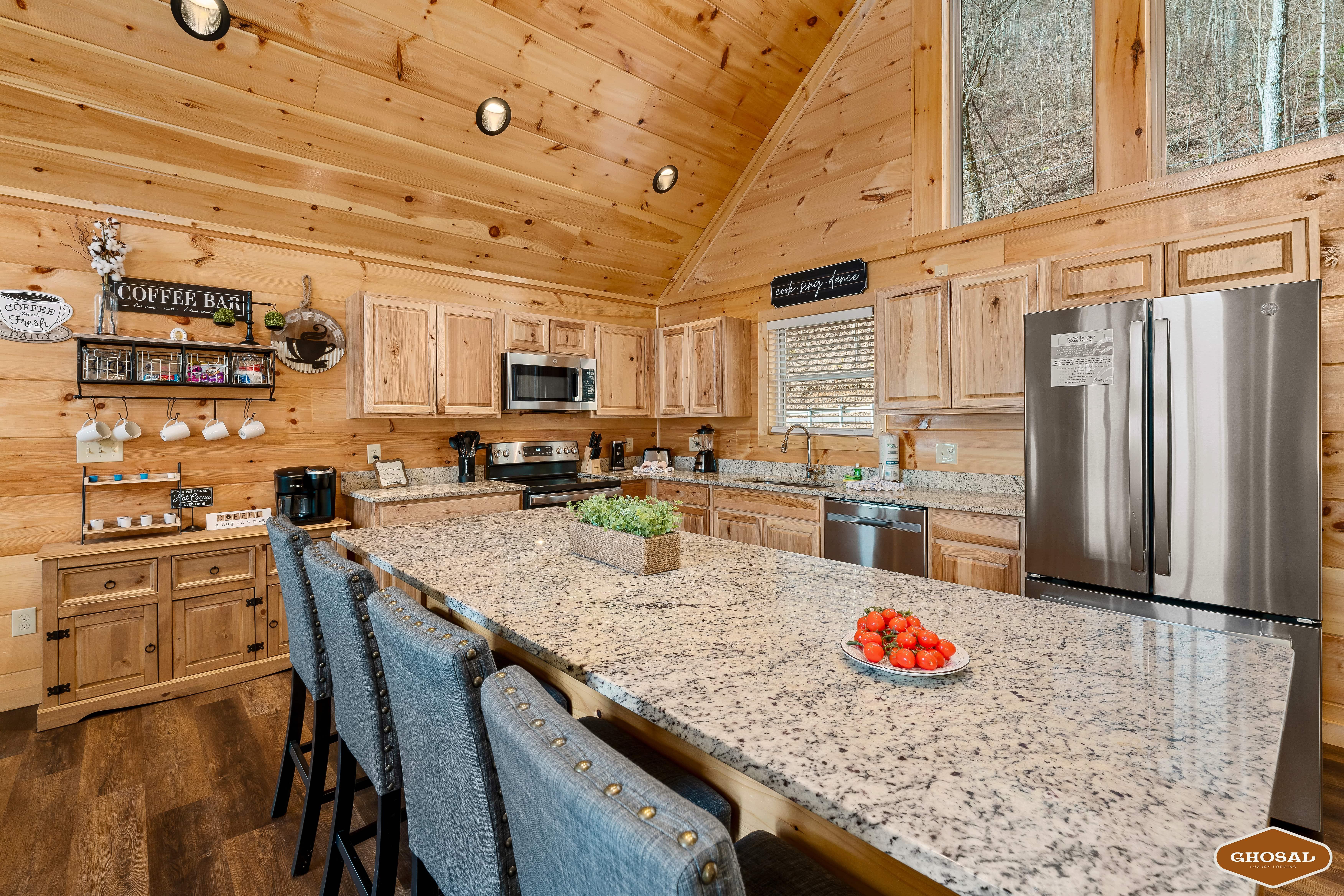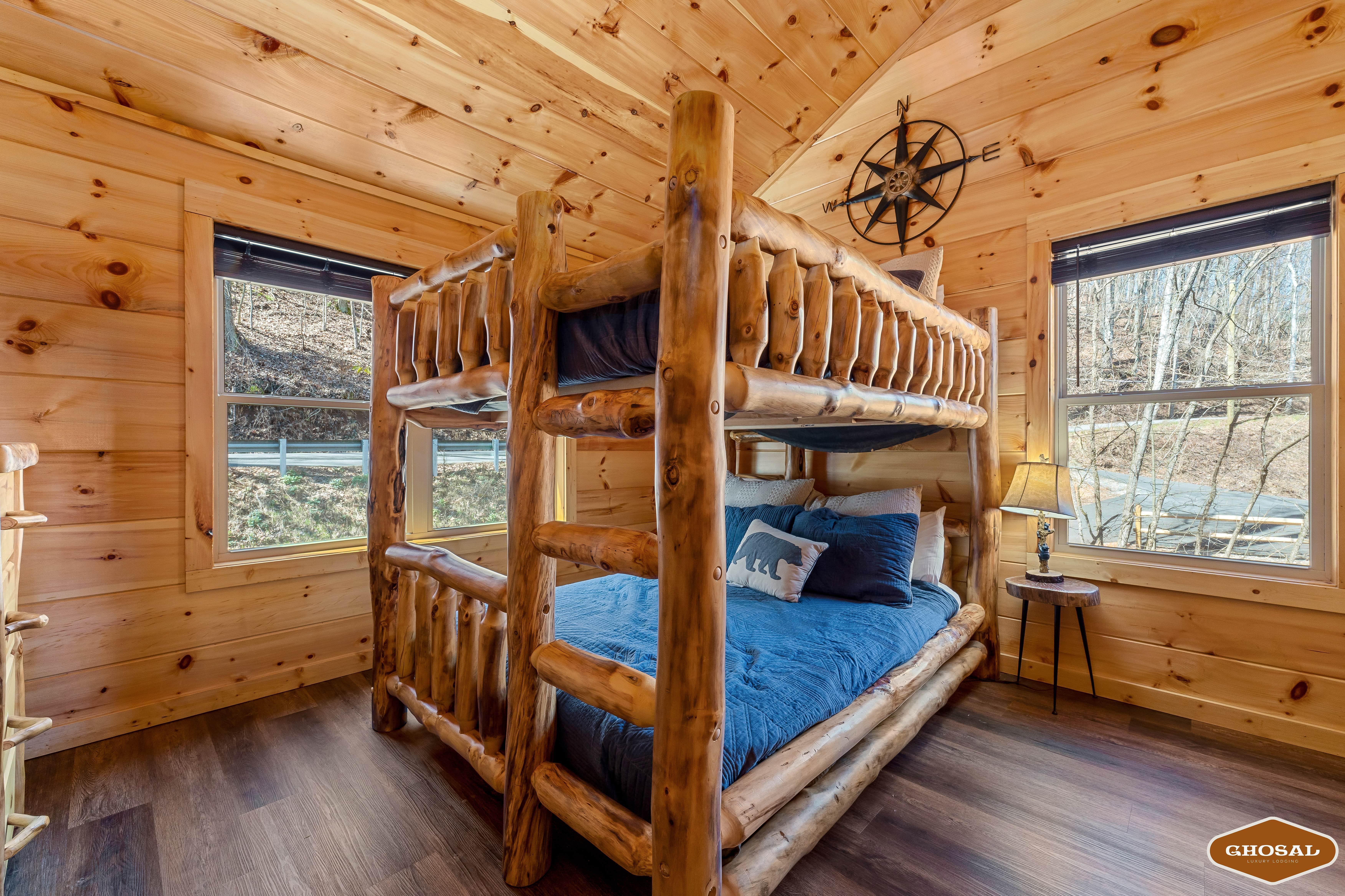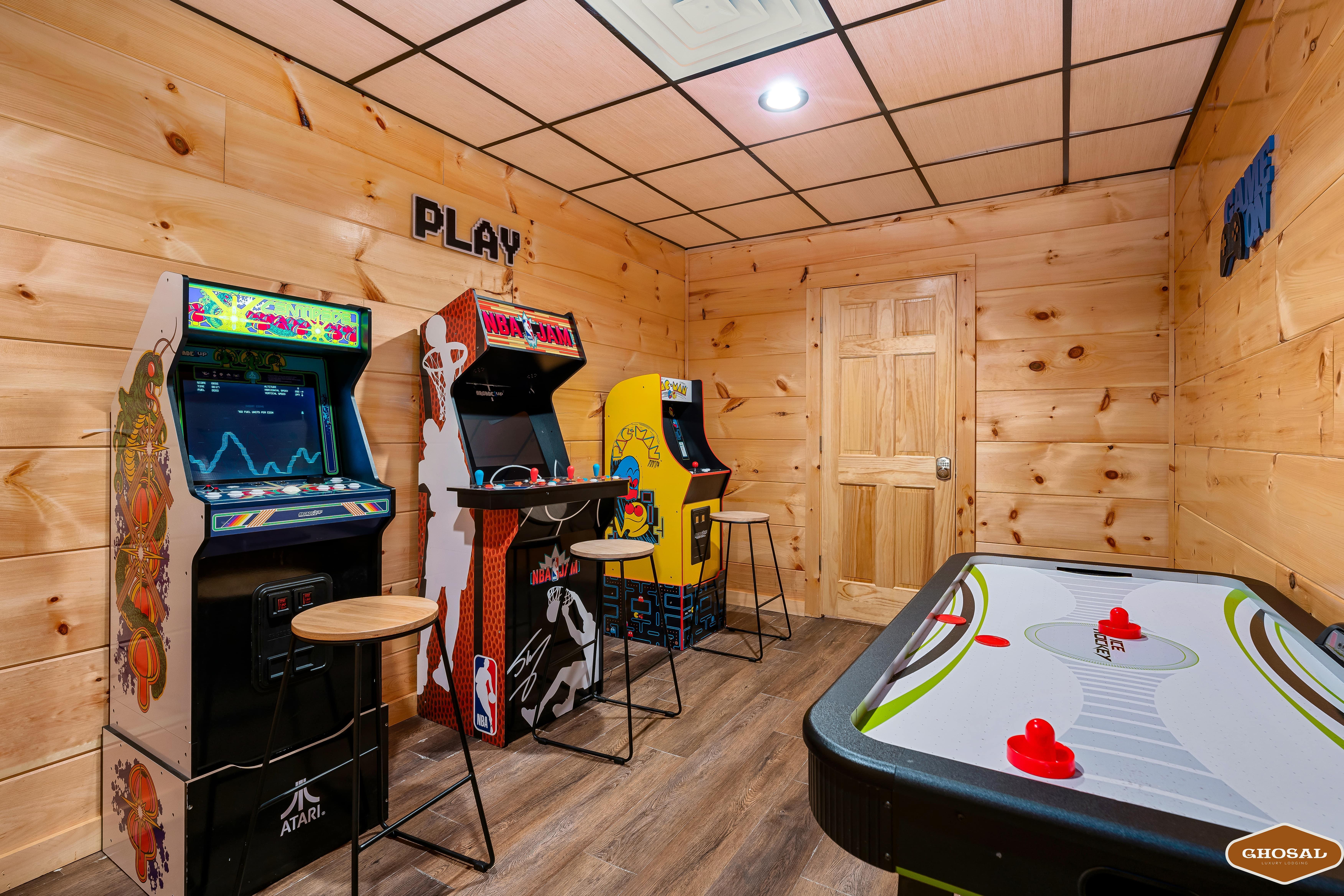 “Elevated Escape” offers the ultimate in comfort and privacy, with spacious bedrooms and modern amenities that ensure a luxurious stay. The fully equipped kitchen is perfect for gathering and enjoying homemade meals together. Entertainment is at the heart of this cabin, with a home movie theater, arcade games, and a classic pool table for endless fun. Whether rain or shine, the indoor heated pool adds an extra touch of luxury to your stay.