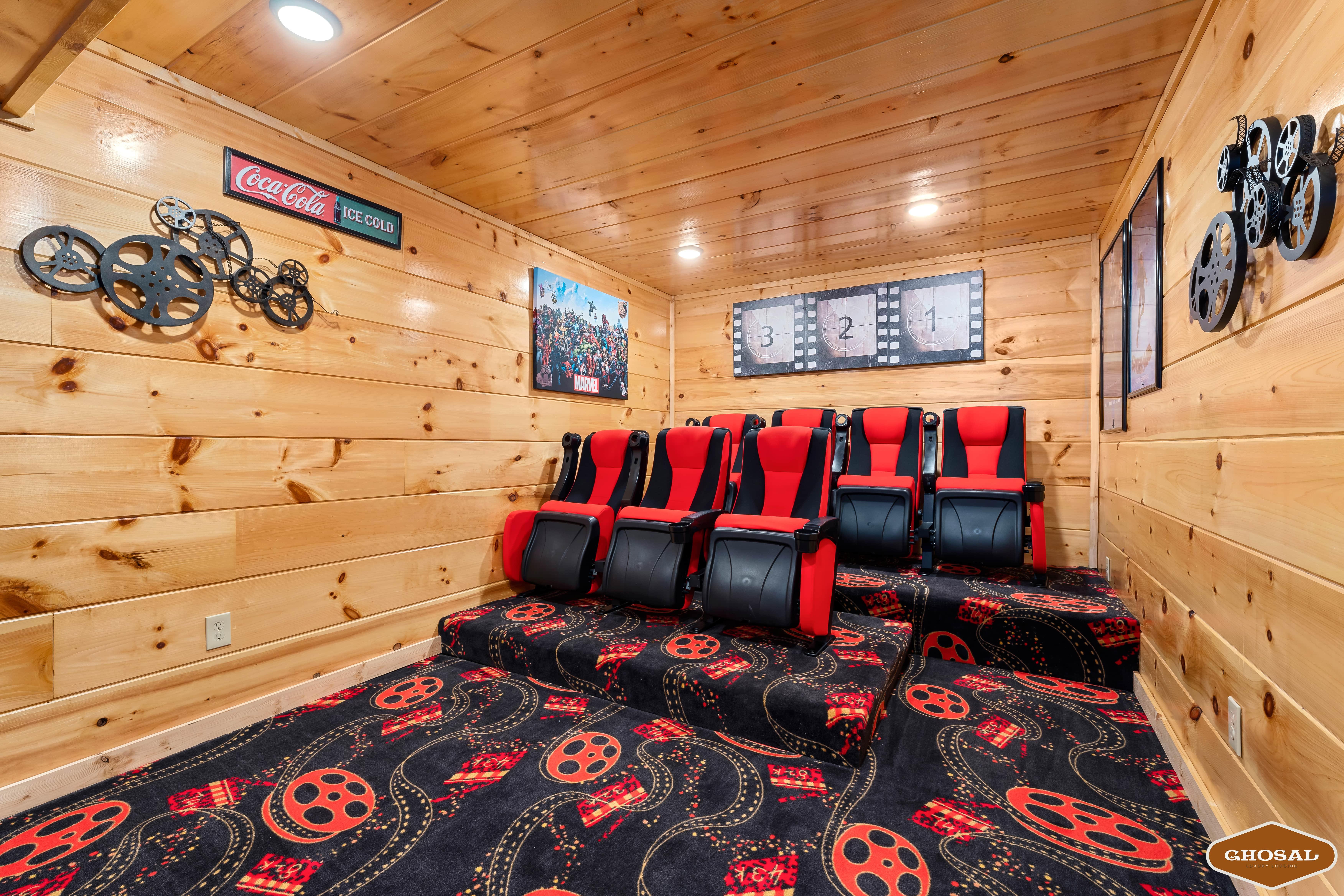 Inside “Heavenly Heights,” you’ll find a fully equipped kitchen that makes cooking both fun and effortless. Entertainment is abundant, with a private movie theater, a classic pool table, and a selection of arcade games that cater to all ages. The expansive indoor pool provides a unique swimming experience with stunning mountain views, making relaxation and fun a central part of your stay.