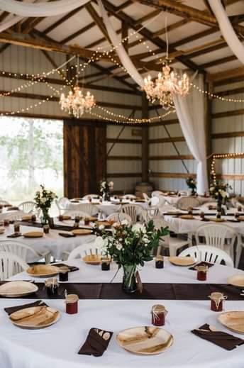 Includes bar service area with live edge wood planks set on wine barrels, catering prep area with commercial size refrigerator and freezer stocked with ice. Dance Floor with special lighting add to your celebration as well as outdoor patio space for your guests to enjoy the amazing views over the water. Tables, chairs, & linens as well as wood rounds, lanterns, and greenery for centerpieces. Beautiful wooden benches for ceremony in the woods, as well as classic white seating for estate lawn ceremony.