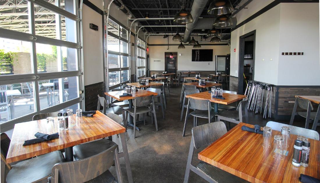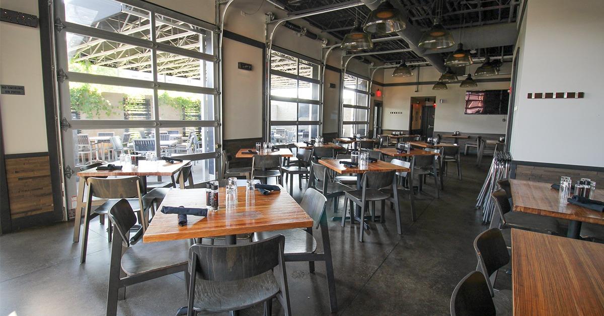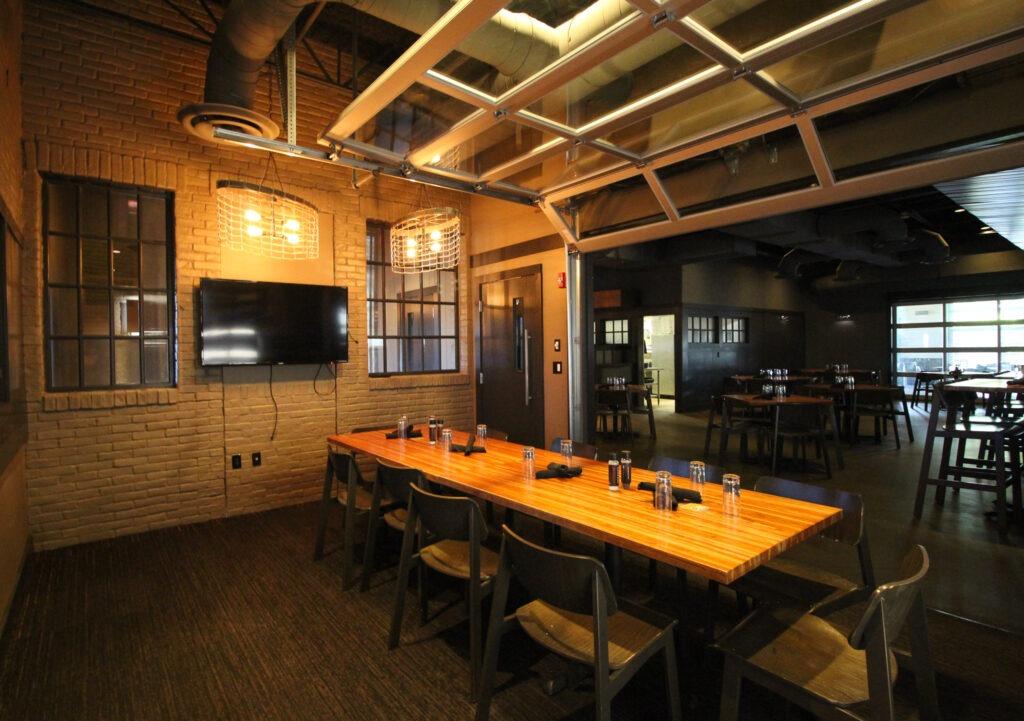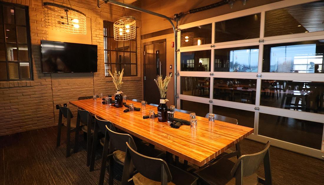 Ideal for special wedding-related gatherings like small rehearsal dinners, bridal party luncheons, or an elegant engagement celebration, this room offers a unique ambiance. Its standout feature is the retractable glass garage door, which allows for a seamless connection to the lively atmosphere of the main taproom when open, or a private, cozy setting when closed. With stylish decor, a beautiful communal table, and the flexibility of an open-air feel, the Hop Room provides a memorable and sophisticated backdrop for your most cherished moments.