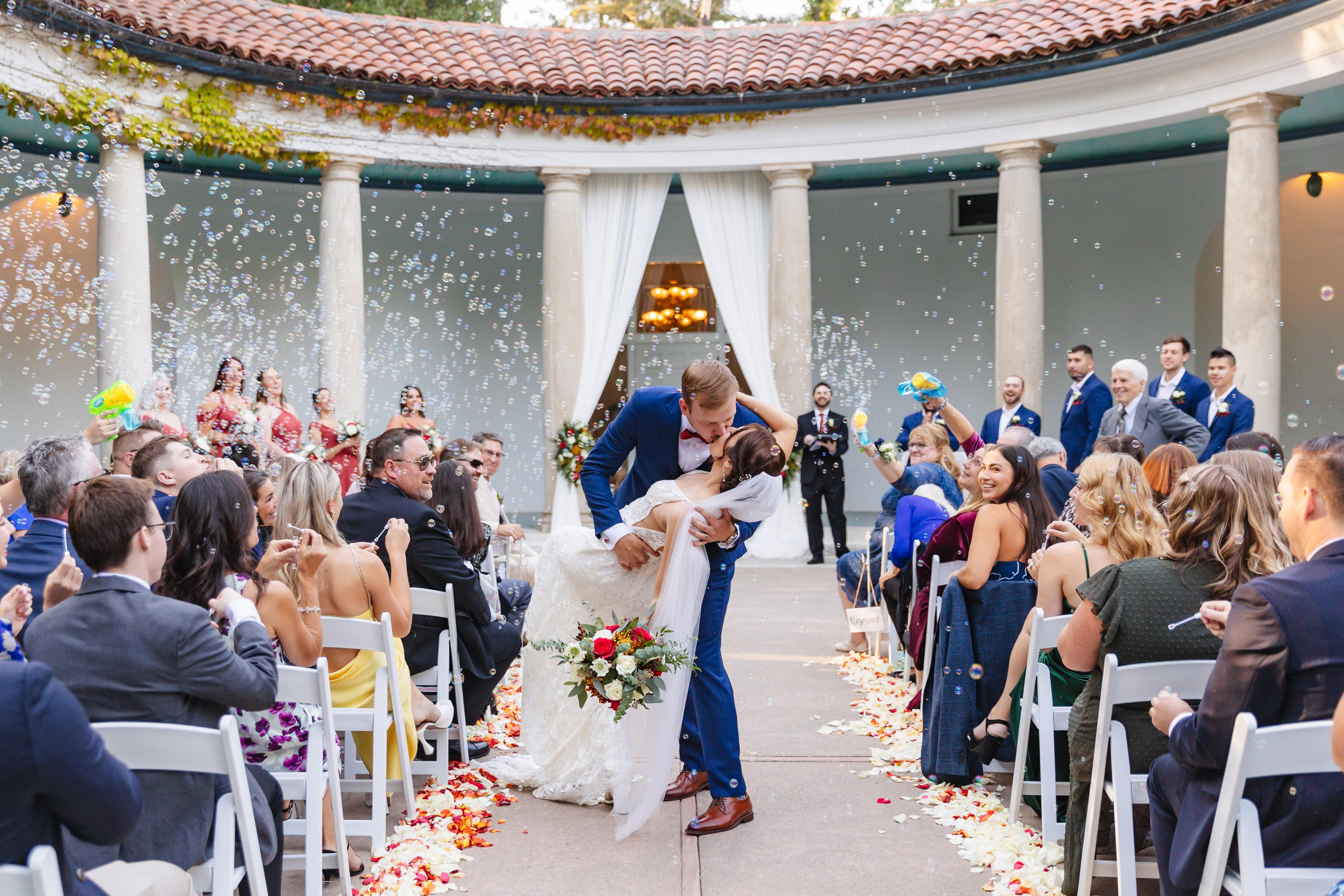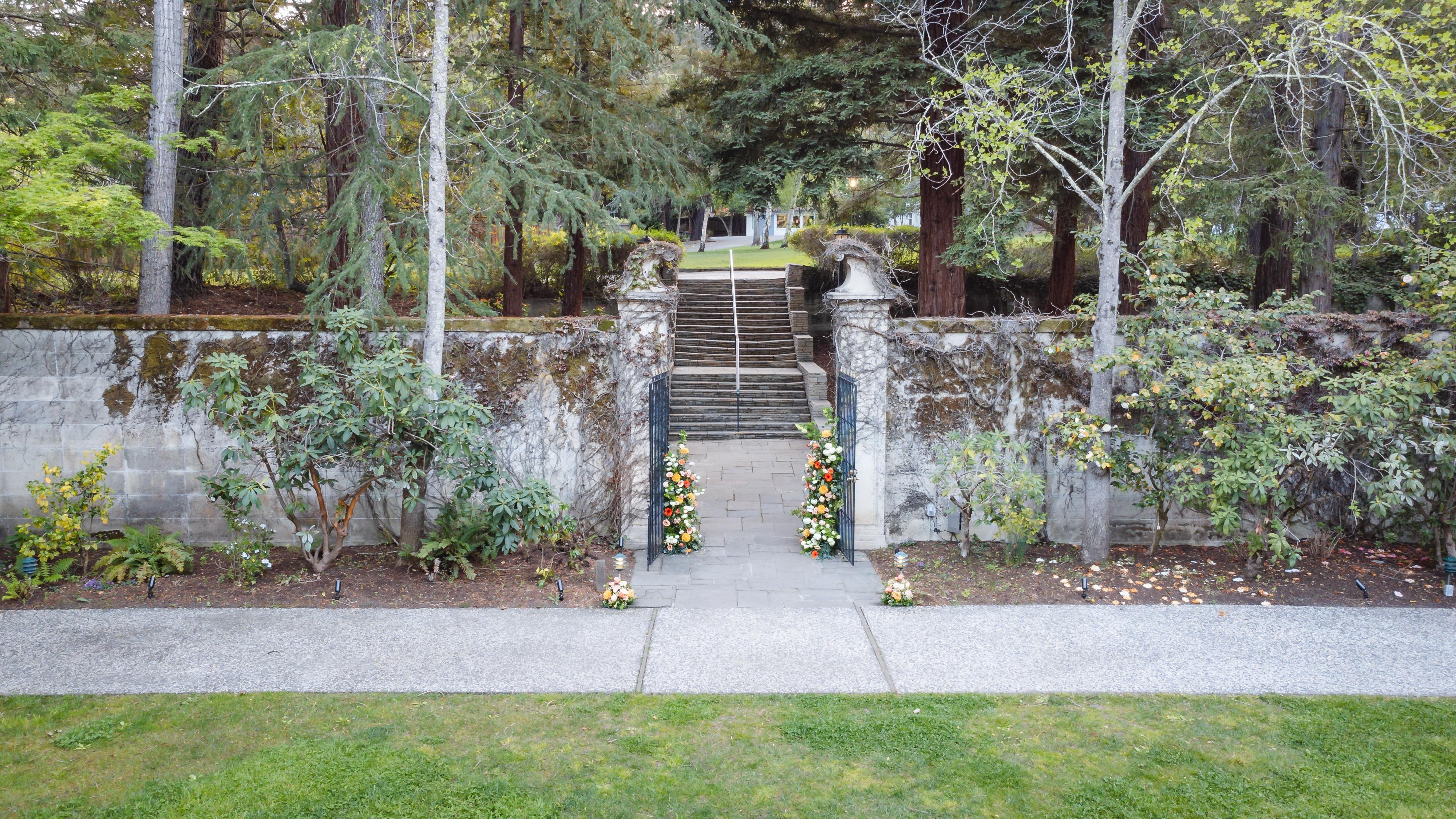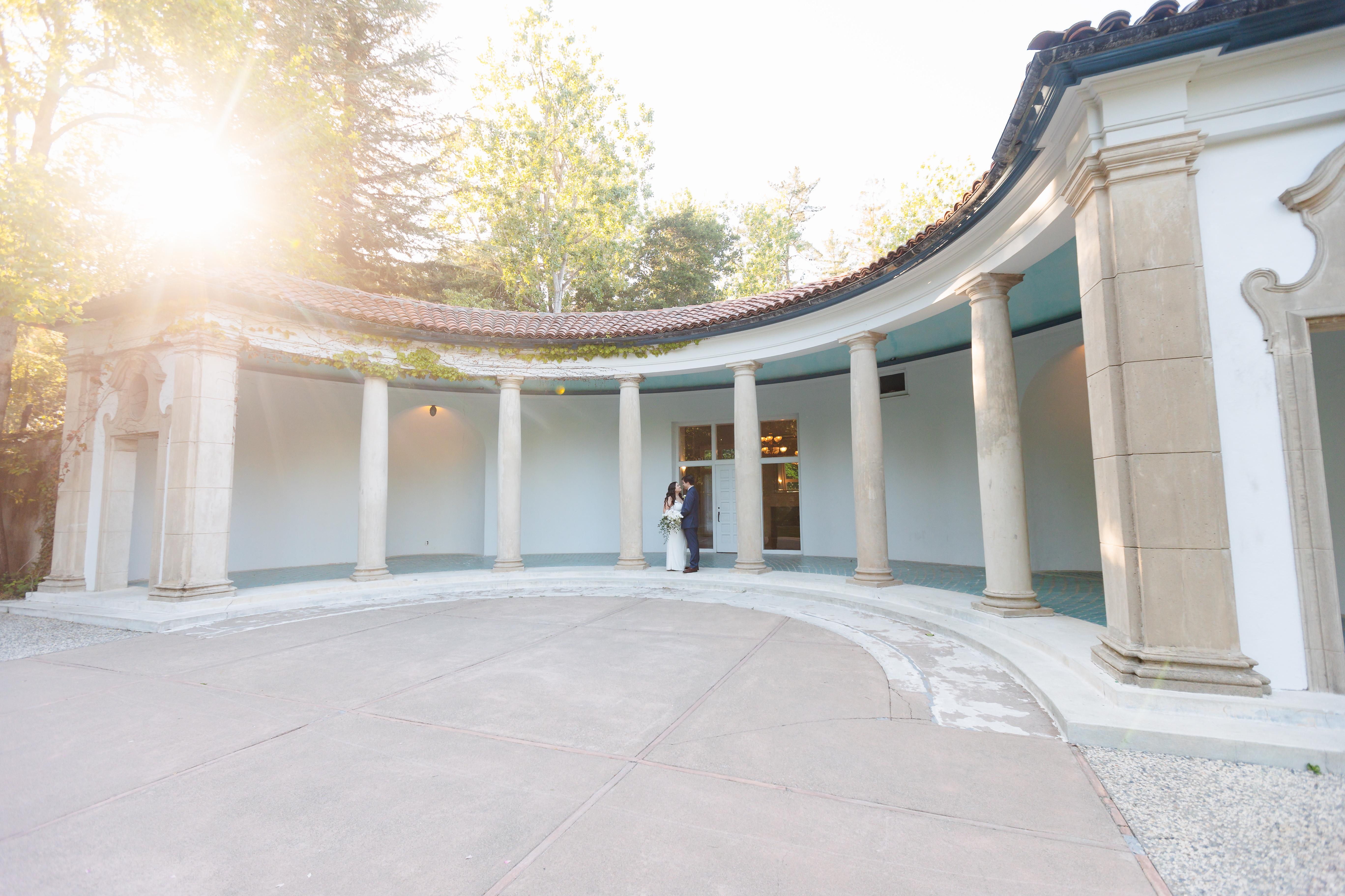 Marry in your own secret garden in front of this breathtaking neo-classical style building with Roman columns. The patio is surrounded by lush ivy, century-old trees, and a manicured lawn. Enjoy your choice of multiple backdrops for 'I do' in this breathtaking space. Make a dramatic first entrance through the dramatic wrought iron gate or from the Pavilion itself. Enjoy dancing in the Pavilion later on in the night, surrounded by vintage stylings in this one-of-a-kind space.