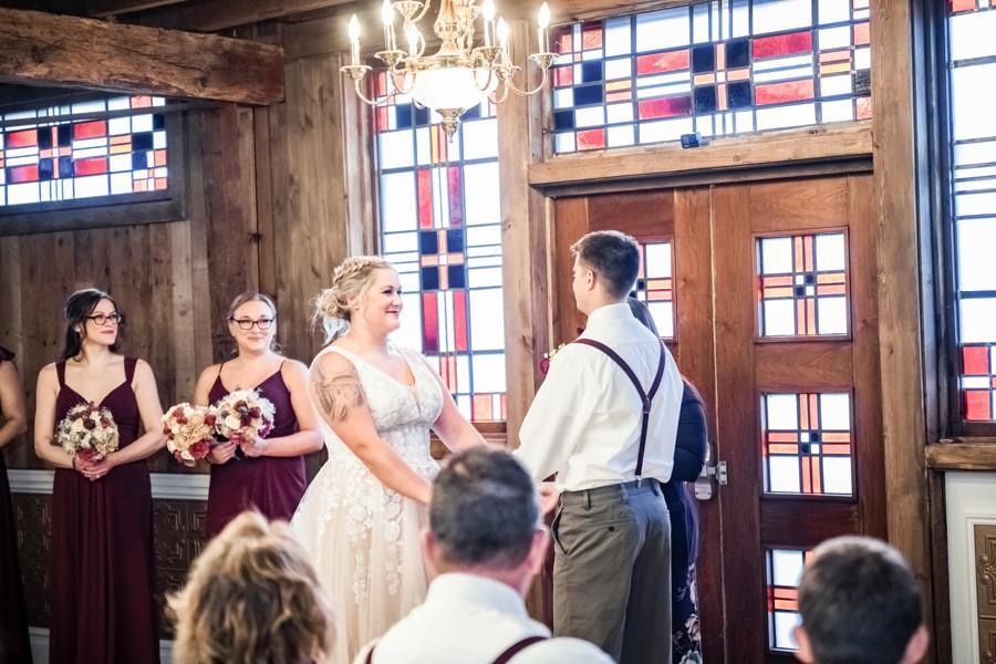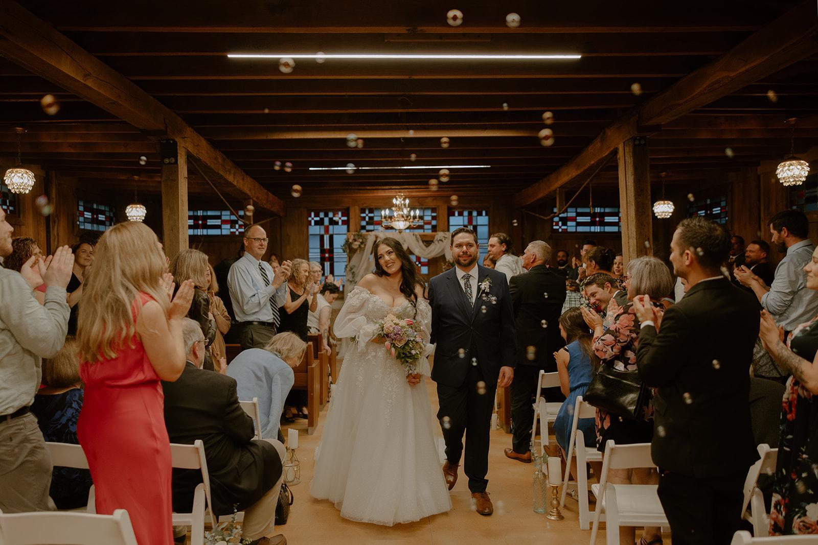 Converted horse barn filled with stained glass and warm lighting it's so beautiful it's not just a "rainy day" option. Combination of pew & white padded chair seating for your guests.