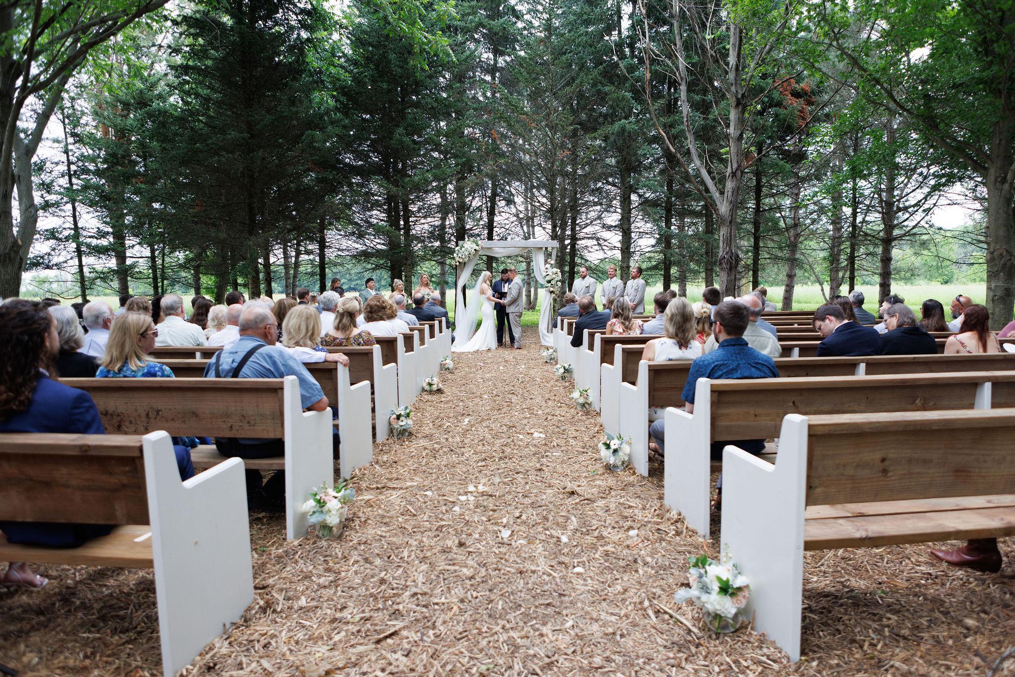 Our Pines ceremony space features a picturesque setting among soaring mature pines with farm field backdrop. Full pew seating for up to 180 guests & meandering aisle path just off Victorian Mansion for the most beautiful of entries.