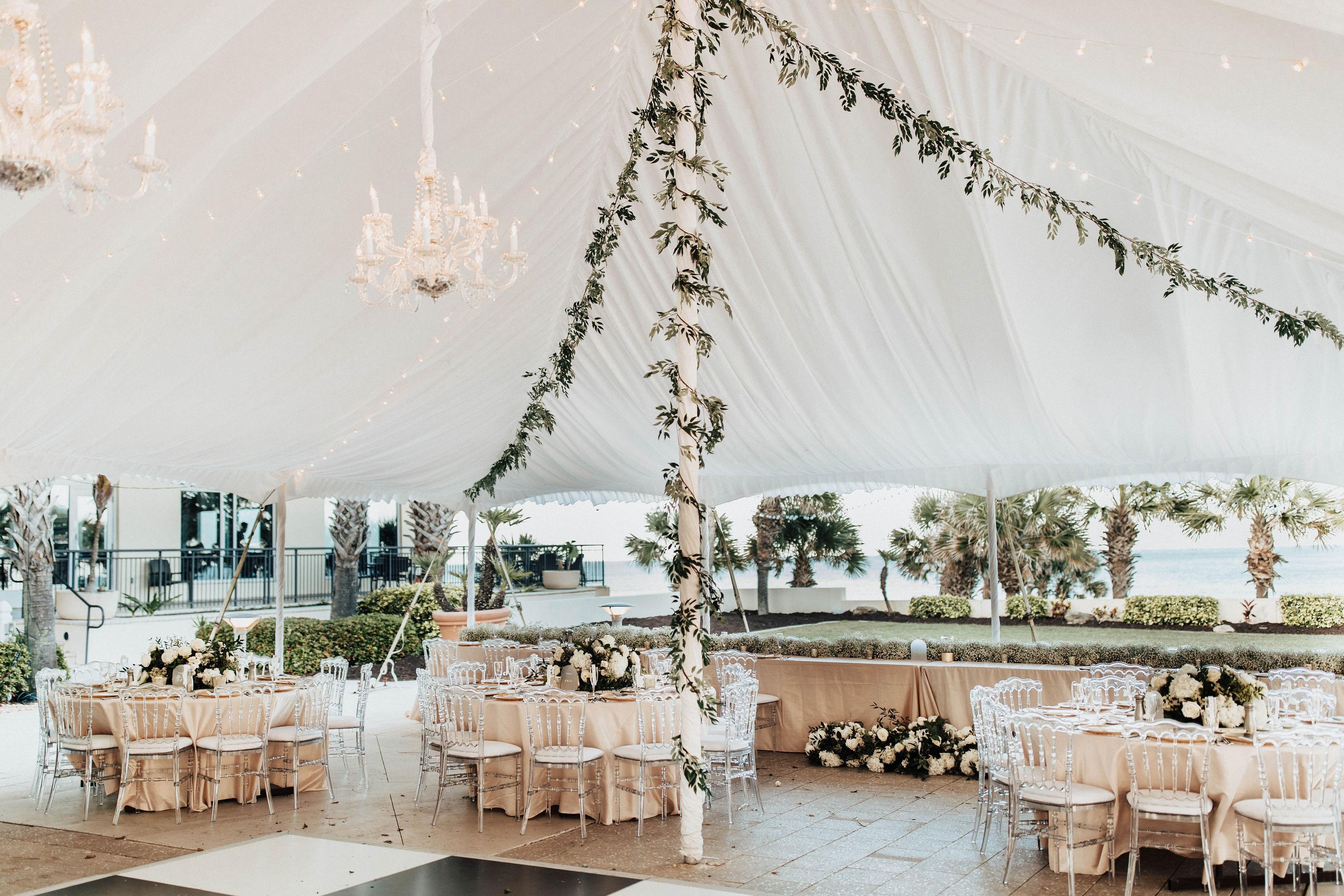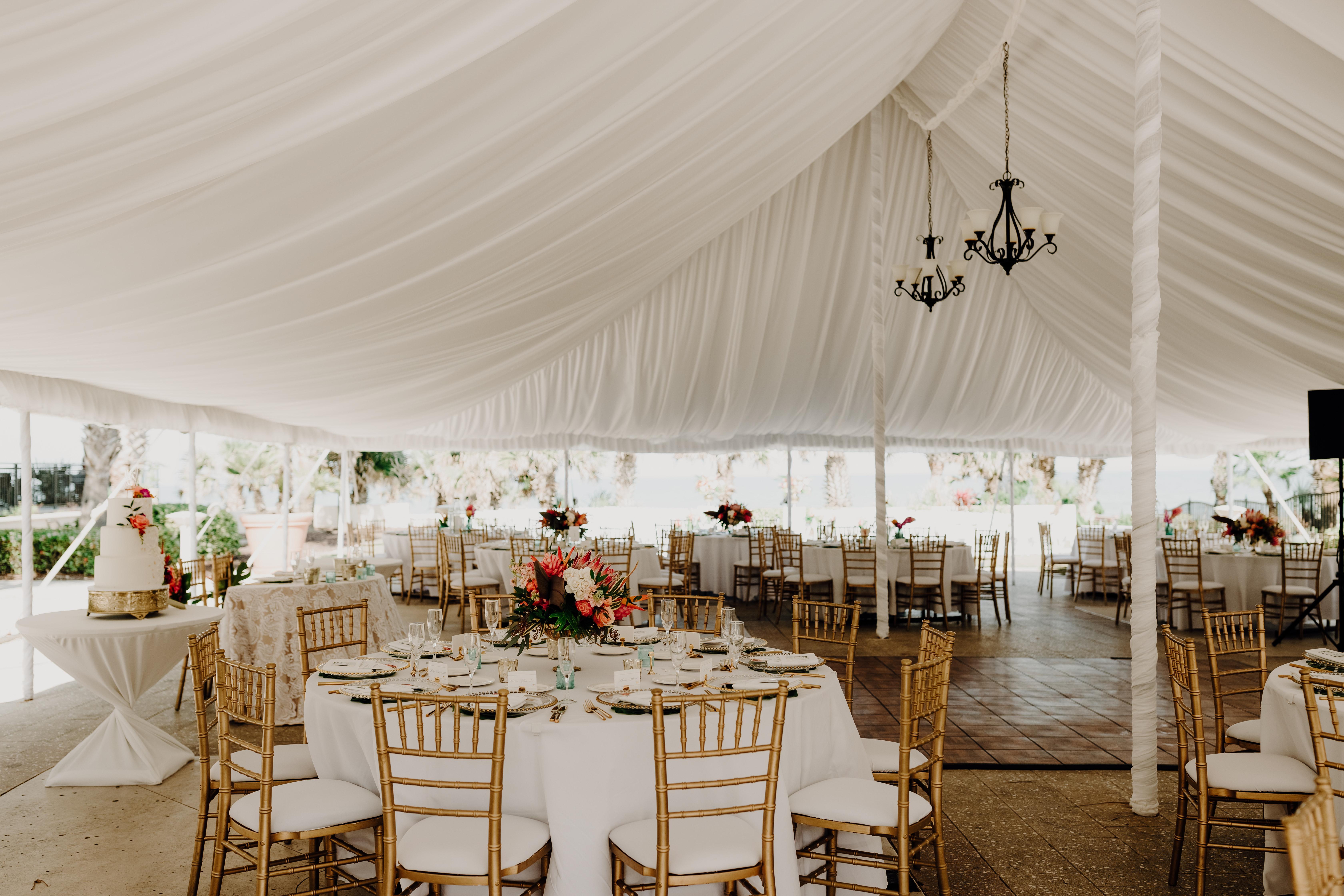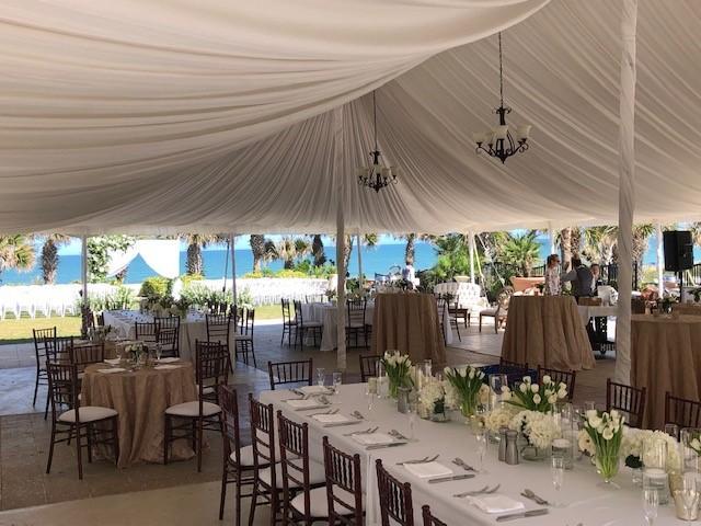 Draped in white chiffon, our rain-or-shine lodge tent offers unobstructed views of the Atlantic ocean, while your guests enjoy world-class cuisine and a classic beachfront atmosphere.