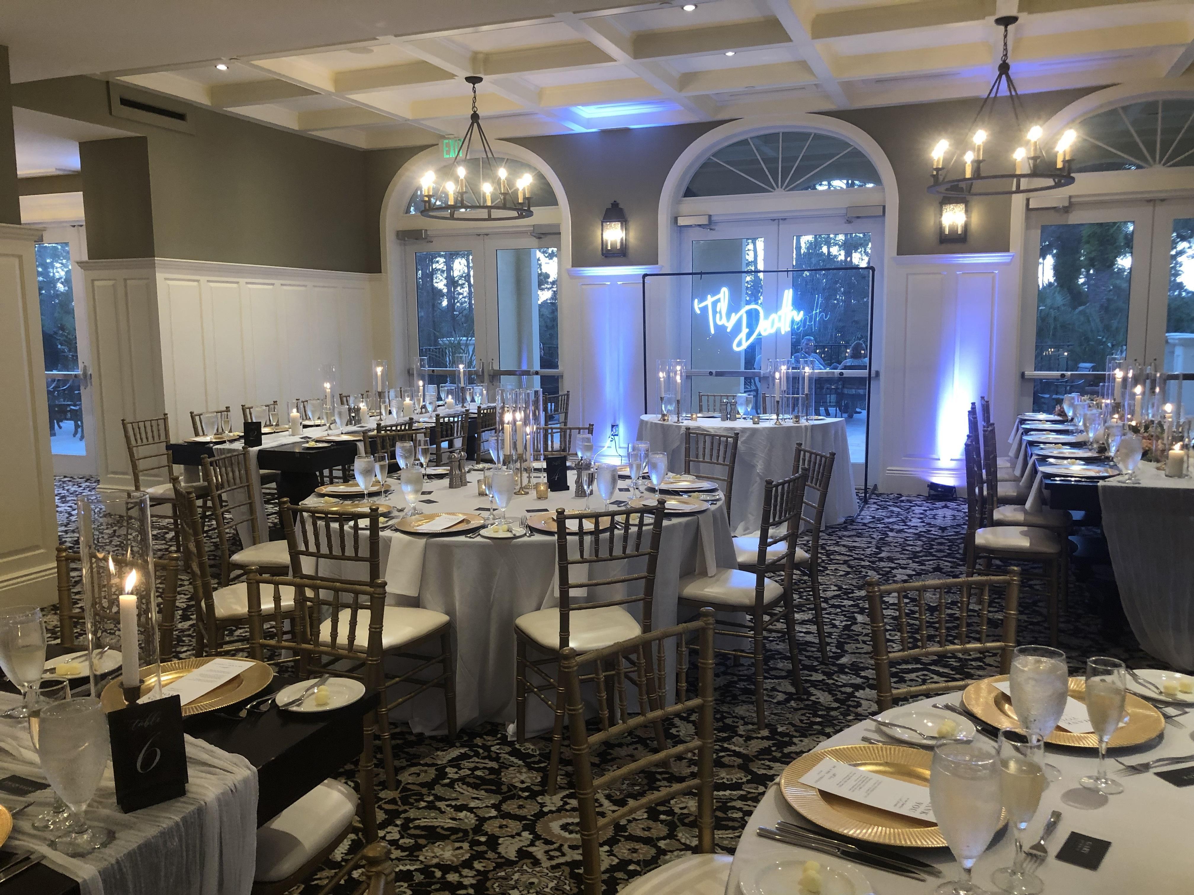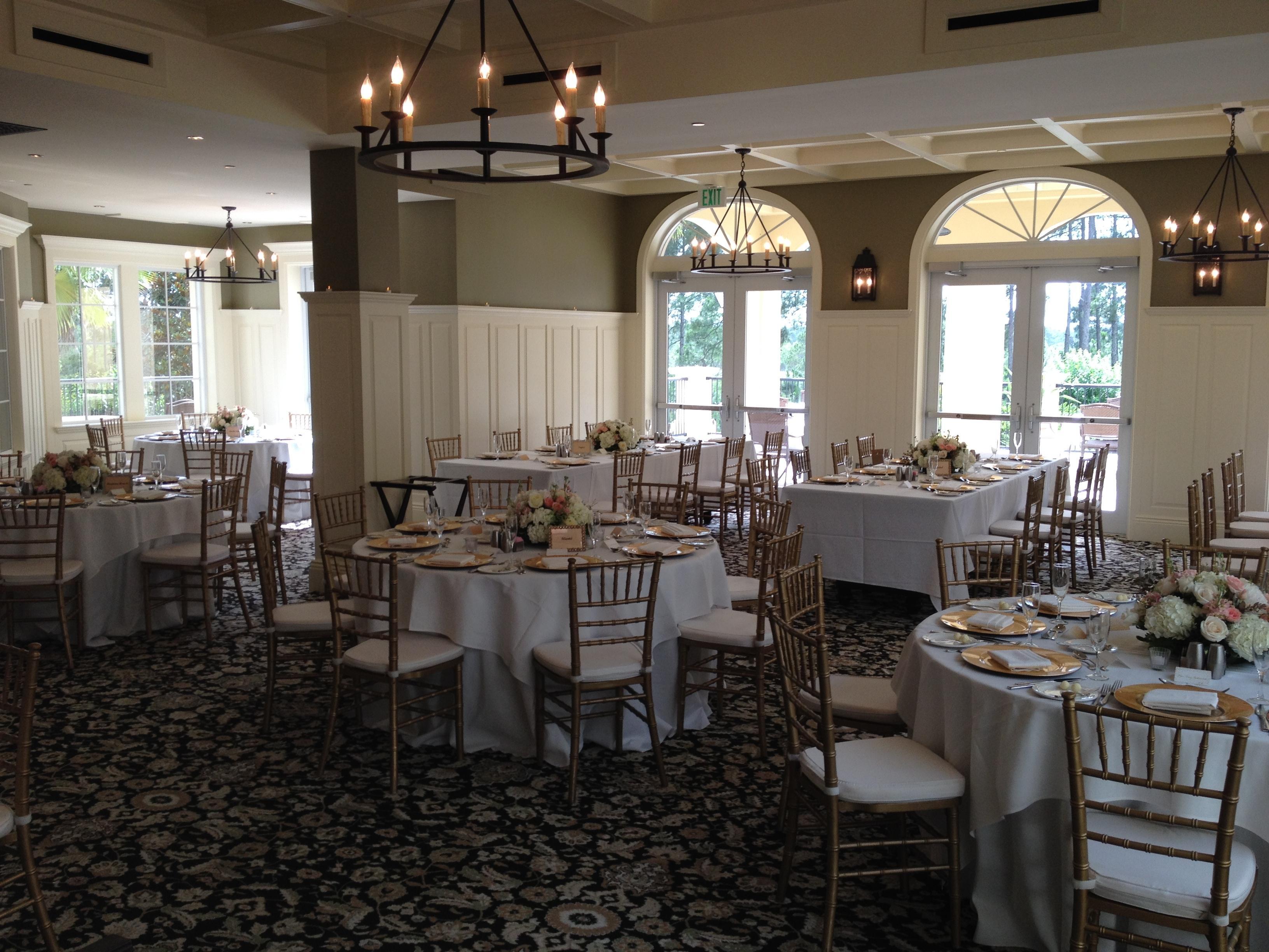 Sophisticated elegance brings the outdoors in, with floor-to-ceiling windows overlooking a natural Florida preserve with a glass ceiling atrium. A private terrace and fire pit off the dining room make a picturesque and private location for a cocktail reception. Located 15 minutes from the resort.