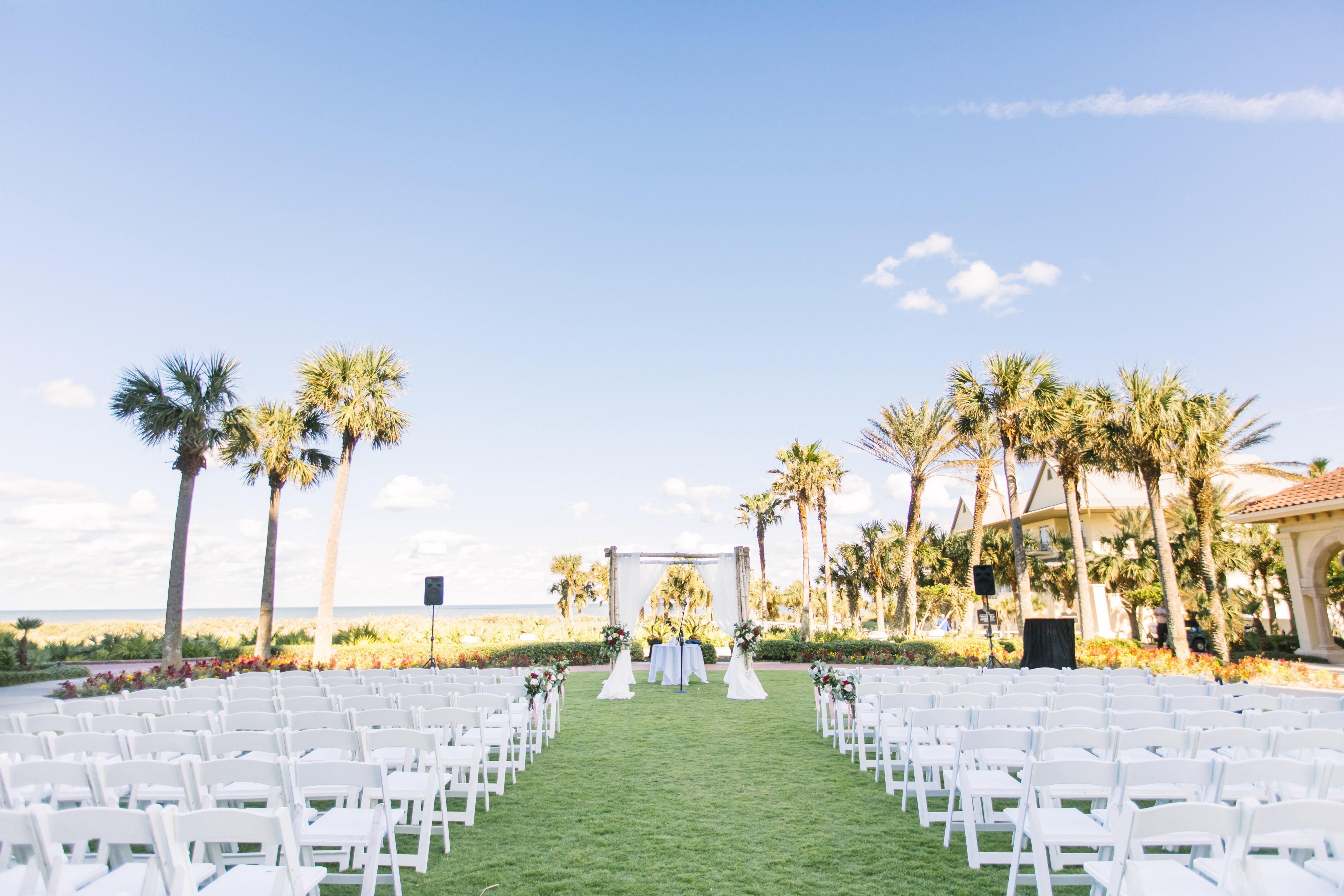 A beautiful pergola on an intimate lawn overlooking the golf course and ocean sets the stage for your intimate reception.