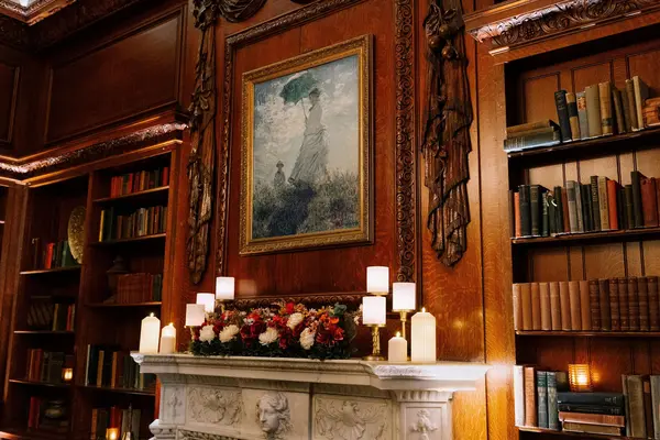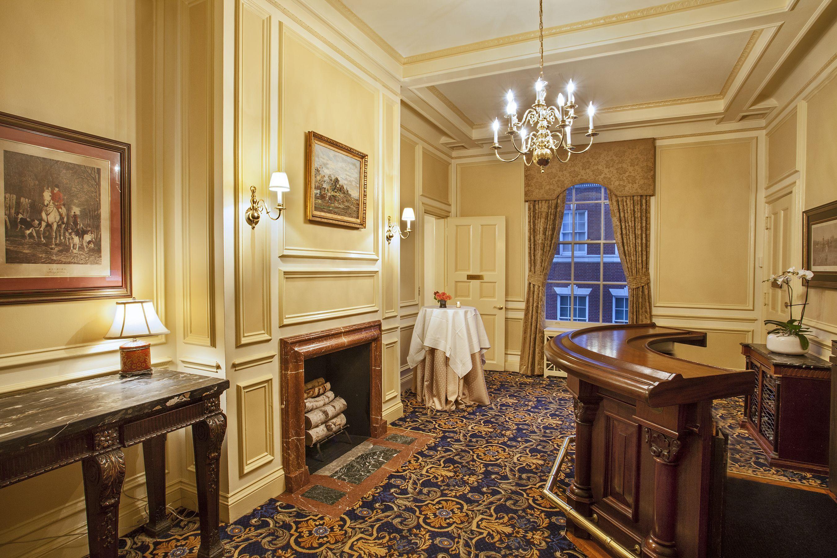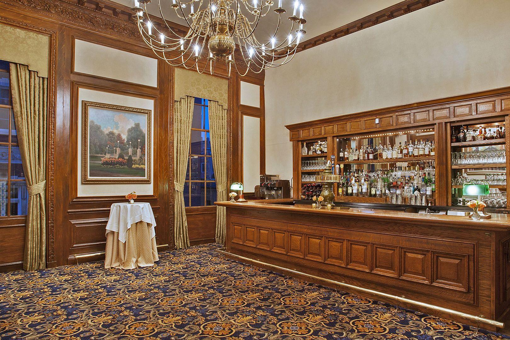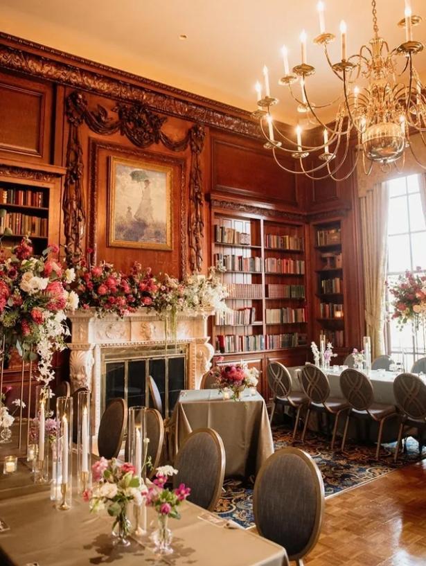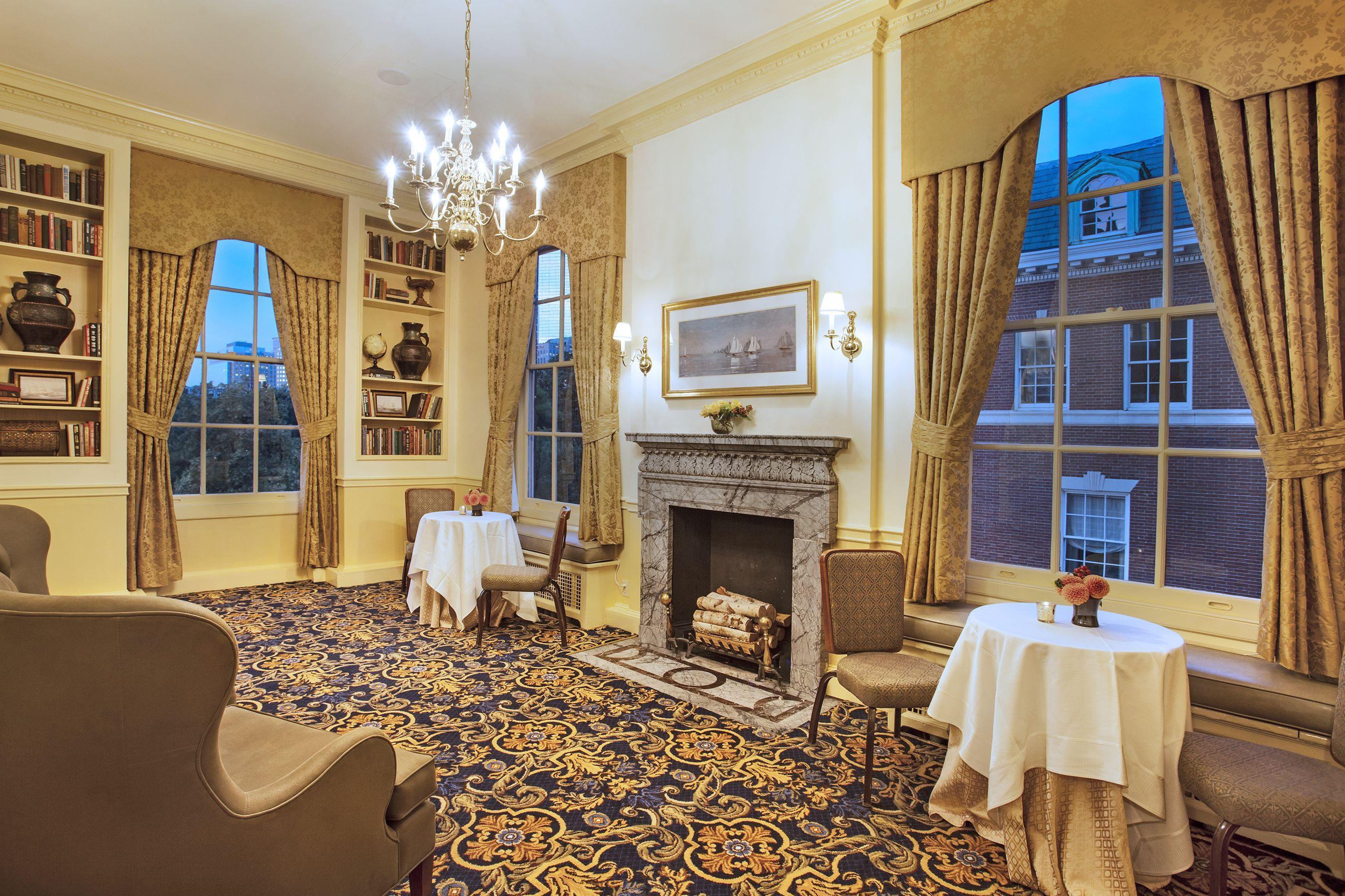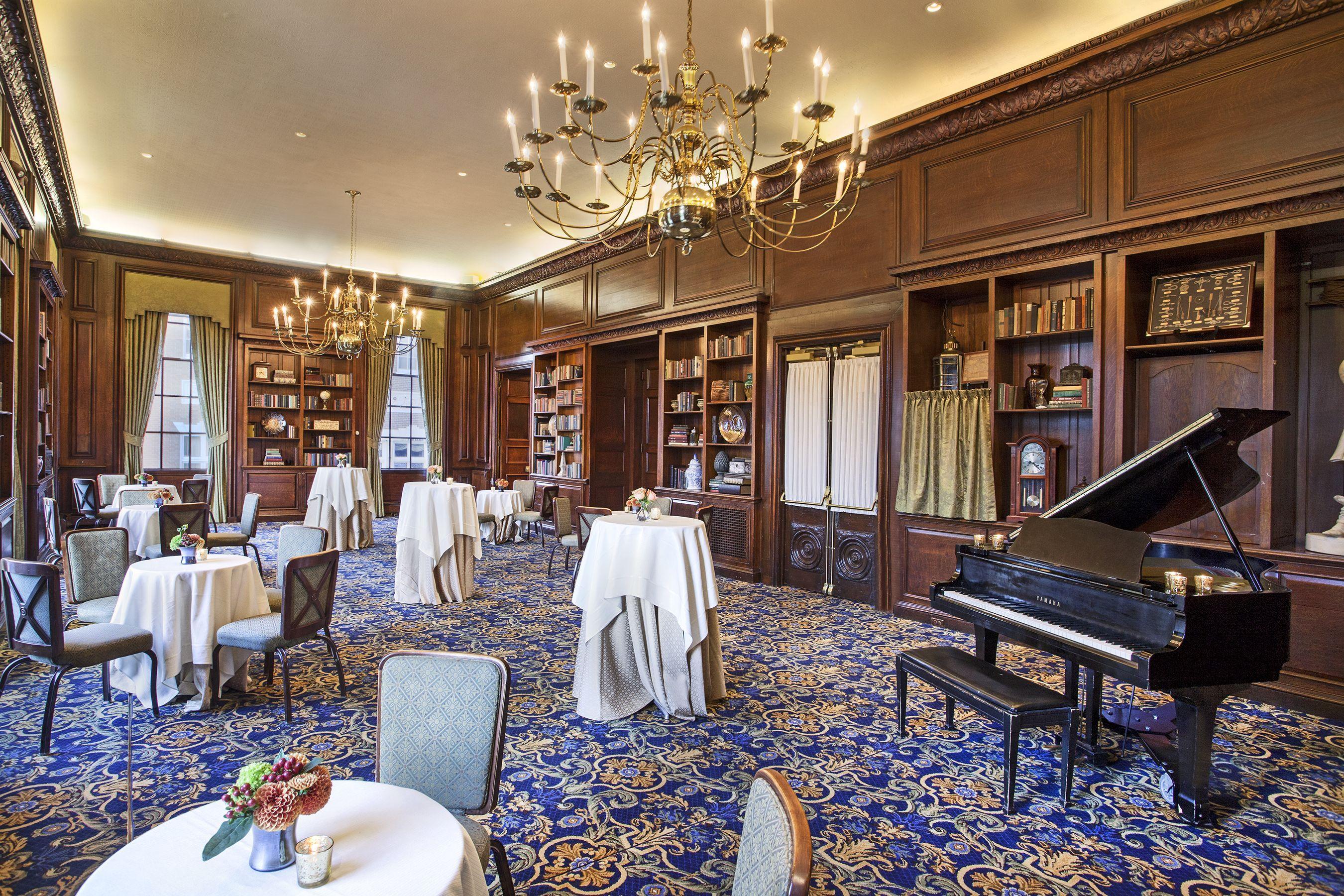 The Second Lloor Library is the grandest room in our mansion. It is designed with high ceilings, tall windows overlooking Beacon Street and the Boston Public Garden, intricately carved oak paneling with bookshelves, a magnificent working marble fireplace, and a functional baby grand piano. The space allows your guests to experience a true and classic Bostonian venue. This space can accommodate a maximum of 100 guests for a plated meal and up to 150 for a reception style event.