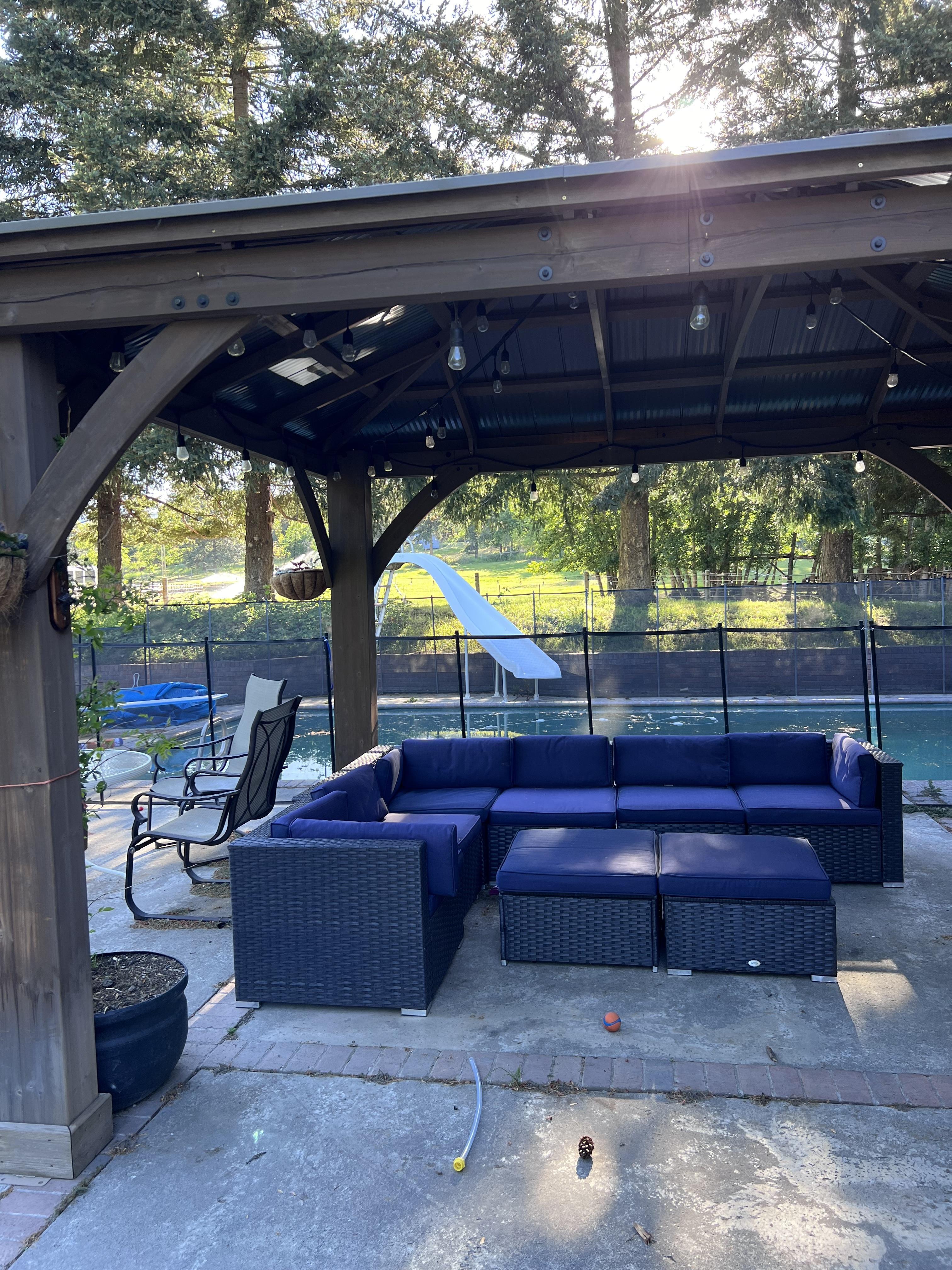 - Pool w/ diving board and slide - Built in Hot Tub - Large outdoor wood-fired pizza oven - Outdoor bathroom and shower - Nature Immersion - Gazebo - Firepit - Pergola covered in grape vines - Shade Garden - Smoker & Grills - Trampoline - Grassy Area - Farm Animals (alpacas, goats, chickens, ducks, bunnies, mini-pony)