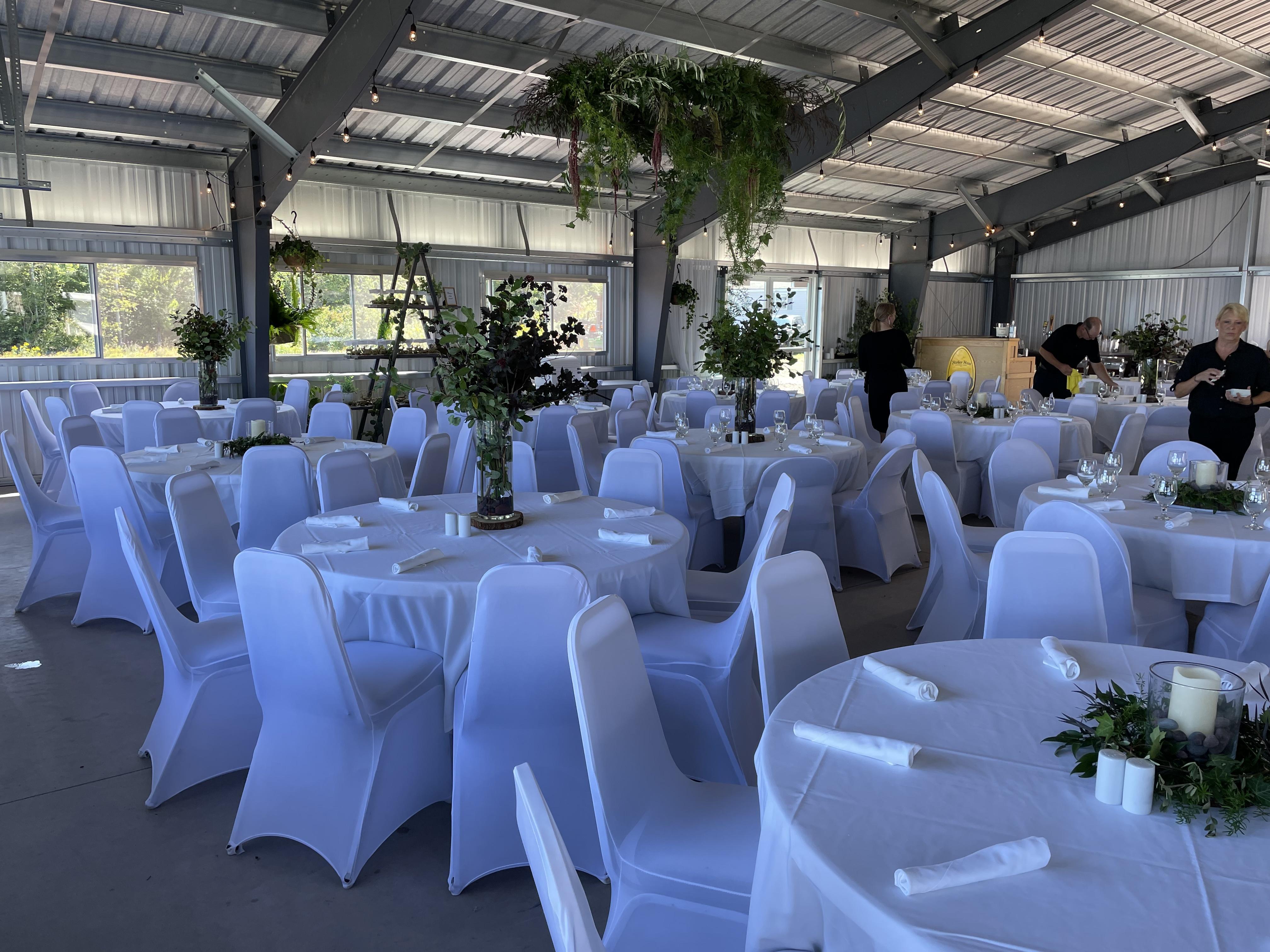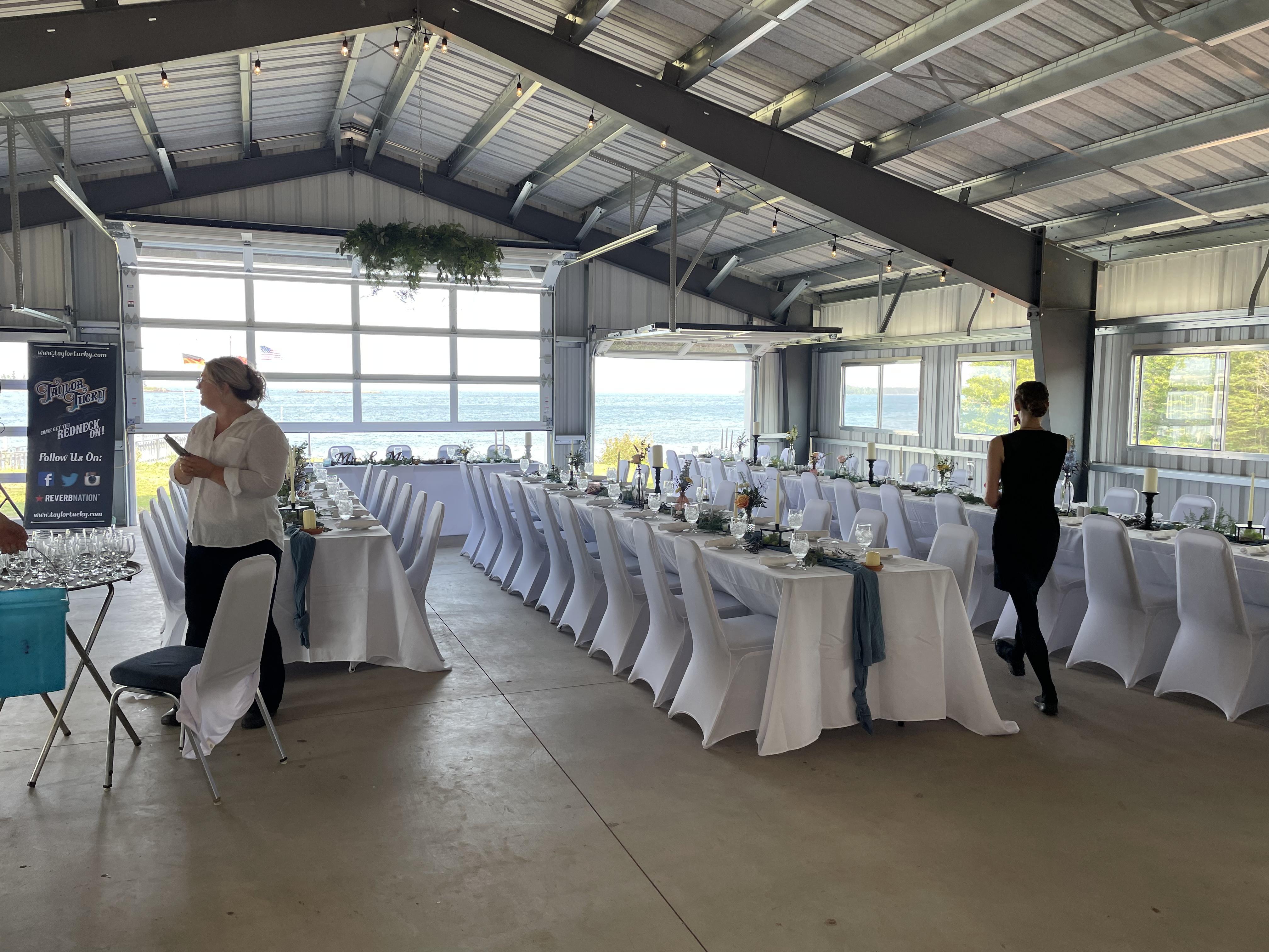 The Vue is a newly constructed event center with four 4 ft x 6 ft windows on each side and front wall facing the harbor with three glass-paneled garage doors (10 ft, 16 ft, 10 ft). The event center is dressed with both patio and uplighting. In addition, local florists are experienced in creating the perfect romantic setting for your wedding!