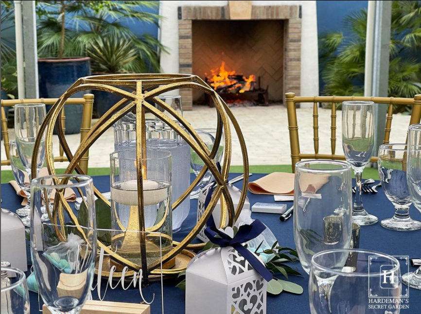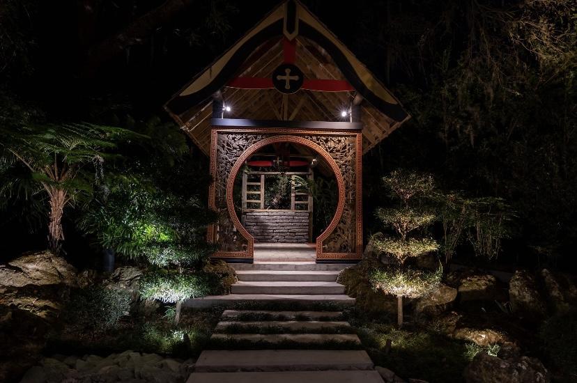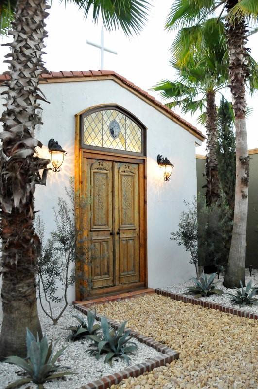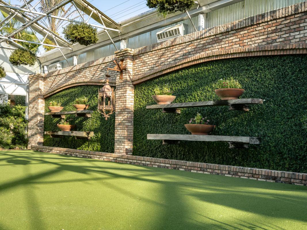The succulent garden is located at the east end of the orchid house and features a working fireplace for evening enjoyment. This area also includes a paved walkway leading to a set of rustic doors, perfect for great photo opportunities.