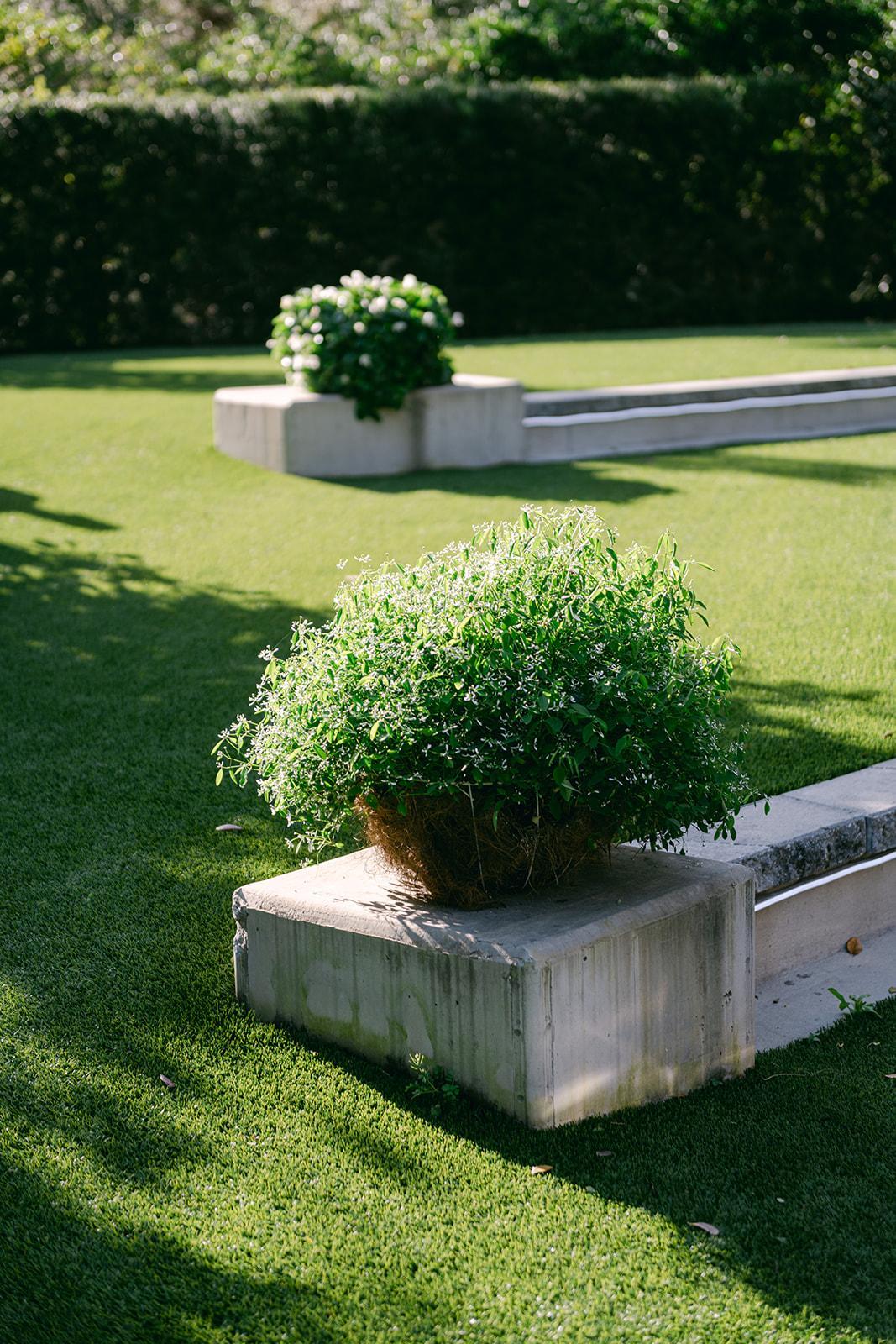 The Front Lawn features lush artificial turf surrounded by beautifully manicured landscaping and framed by the elegant Estate.