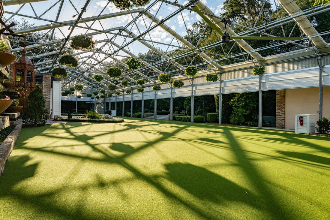 The Orchid House is the central facility, featuring a European-engineered greenhouse that measures 50 feet by 120 feet and stands 20 feet tall. It has a retractable roof and walls for versatility. On the eastern side, there is a 12-foot-high brick and masonry block wall designed to showcase floral pots, creating an attractive backdrop. In the center of this wall is a raised stage, flanked by coral boulders, which can be utilized for bands, speakers, tables, and various activities.