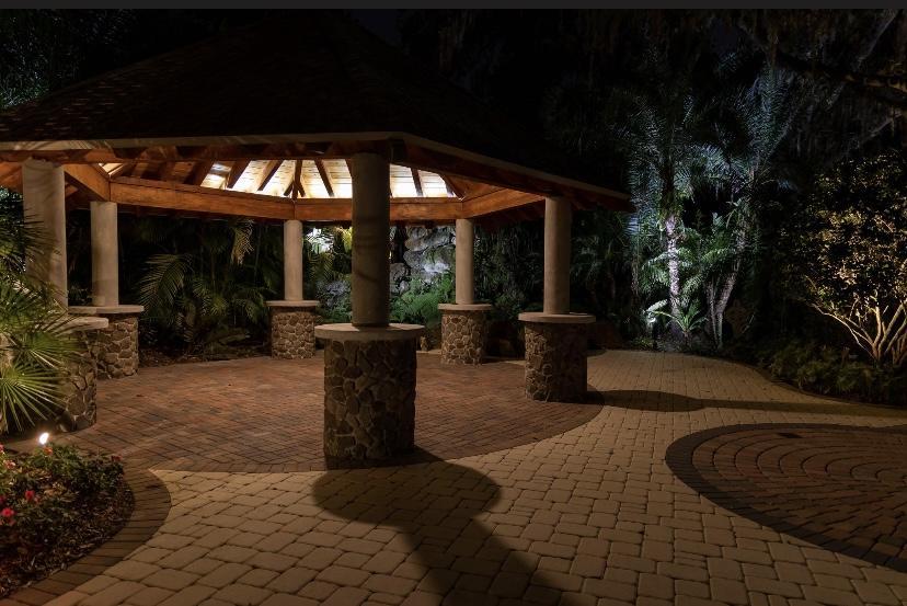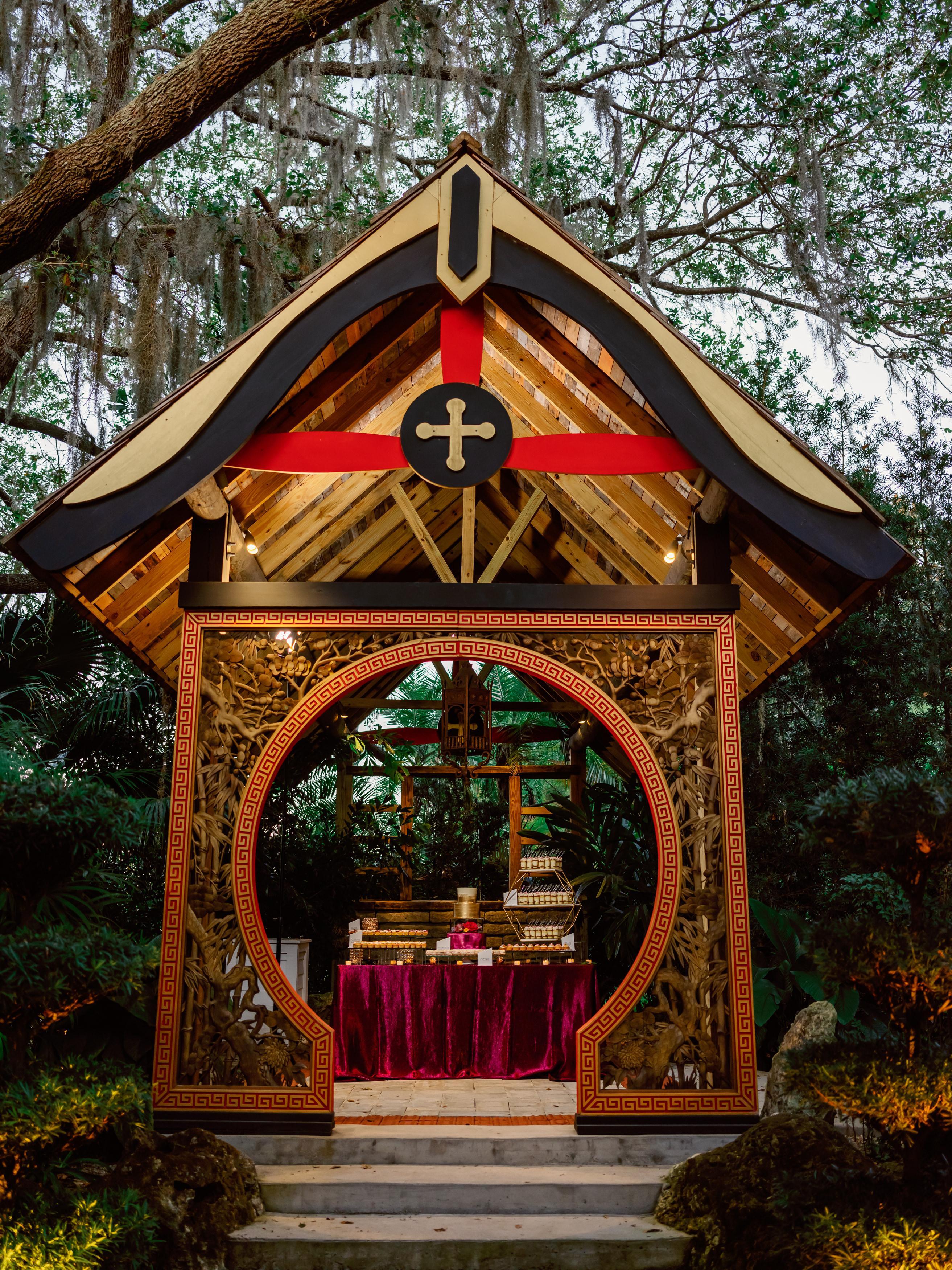 Discover a hidden gem: a picturesque 10'x30' open-air pavilion shaded by a magnificent oak tree. Its entrance features a meticulously carved antique keyhole design, welcoming you into a world of enchantment. Beneath the pavilion's elegantly designed steep gabled roof, you'll find an ideal setting for gatherings and events that effortlessly blend nature's beauty with architectural elegance.