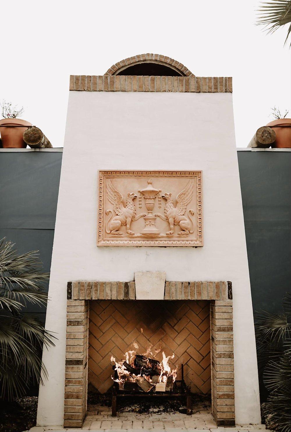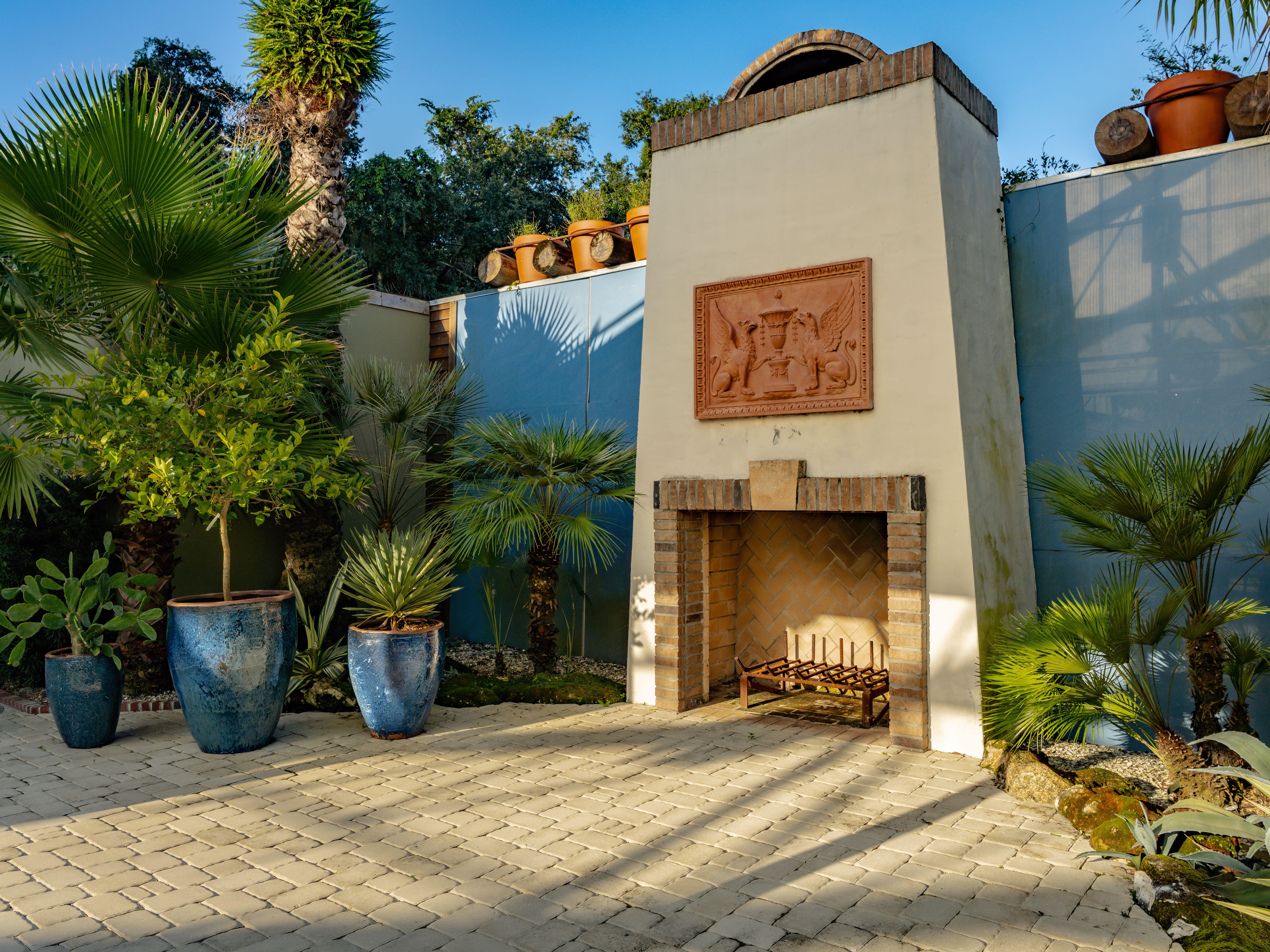 The cozy garden features a charming fireplace, perfect for gathering with drinks and conversation.