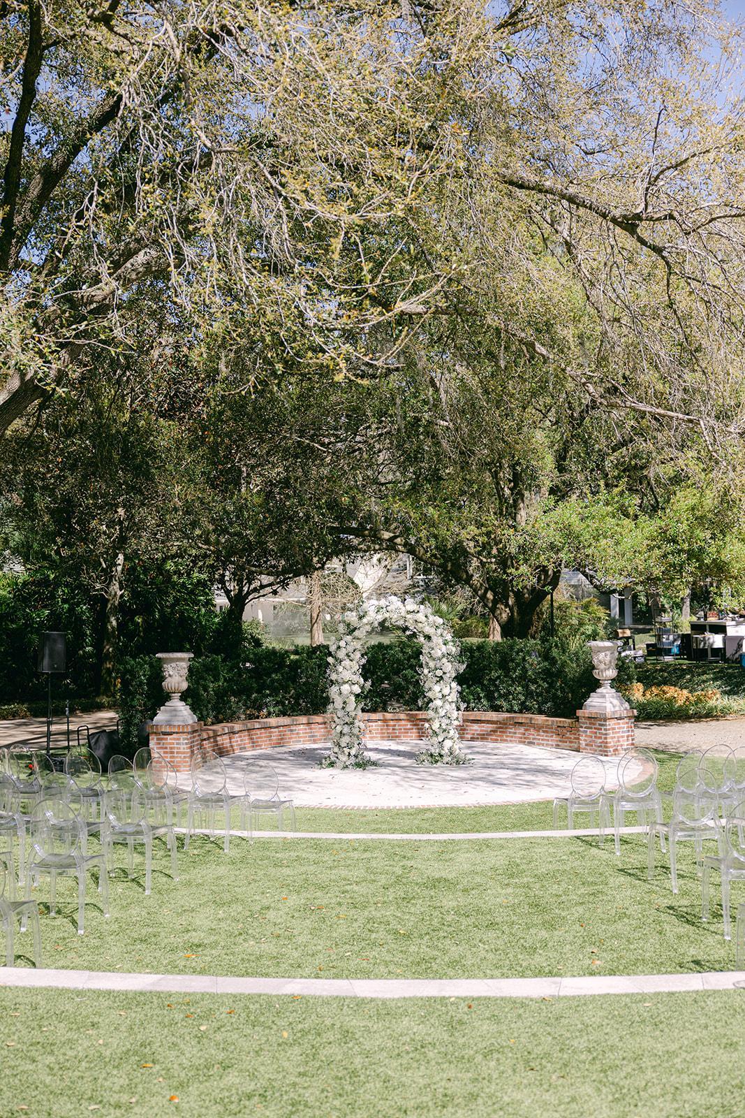 This versatile space is perfect for a variety of special occasions, from enchanting wedding ceremonies to lively cocktail parties and intimate mini concerts. It offers numerous photo opportunities, whether you prefer the semi-circle tiered concrete steps of the amphitheater or the stunning backdrop of lush greenery and the estate's timeless beauty.