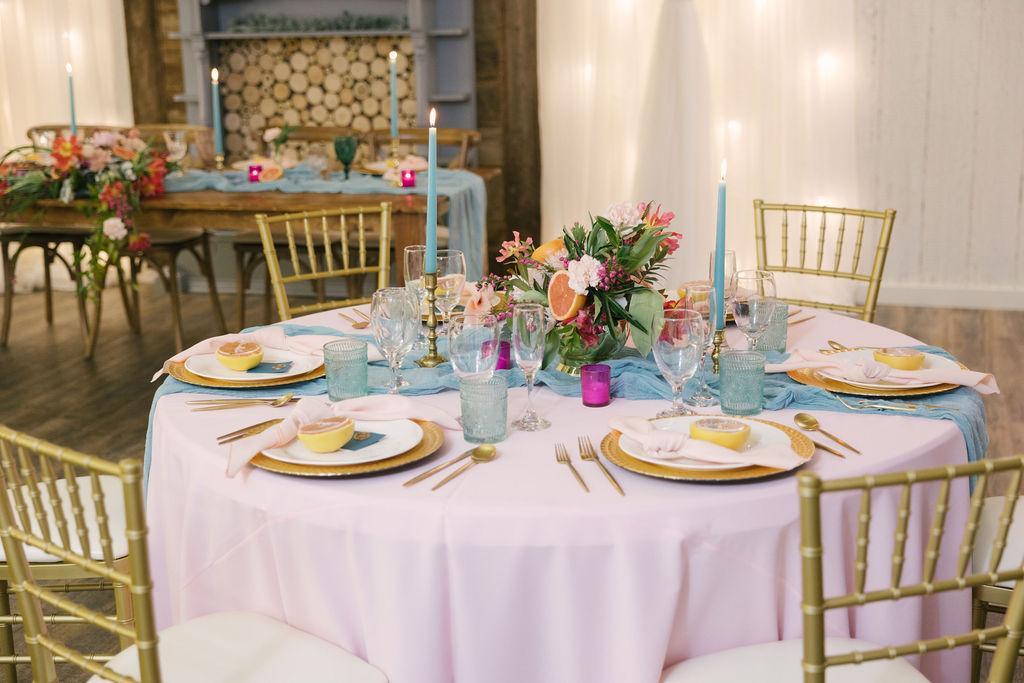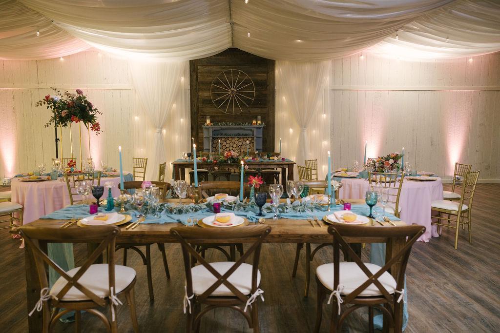 - 60” Round Tables (8 guests per table) - White Resin Padded Garden Chairs - Table Linens for 15 tables in your choice of color - Set-up of All Tables and Chairs - After Event Cleaning/Sanitizing (We ask that you leave the venue “as you found it”.) - Draped/Lighted Ceiling in Reception Area - Access to our Prop Closet (Filled with items that guests find useful - mason jars, wood slices, bird cages, lanterns, chalk signs, easels and much more.) - Bride-Ready Room - The Man Cave