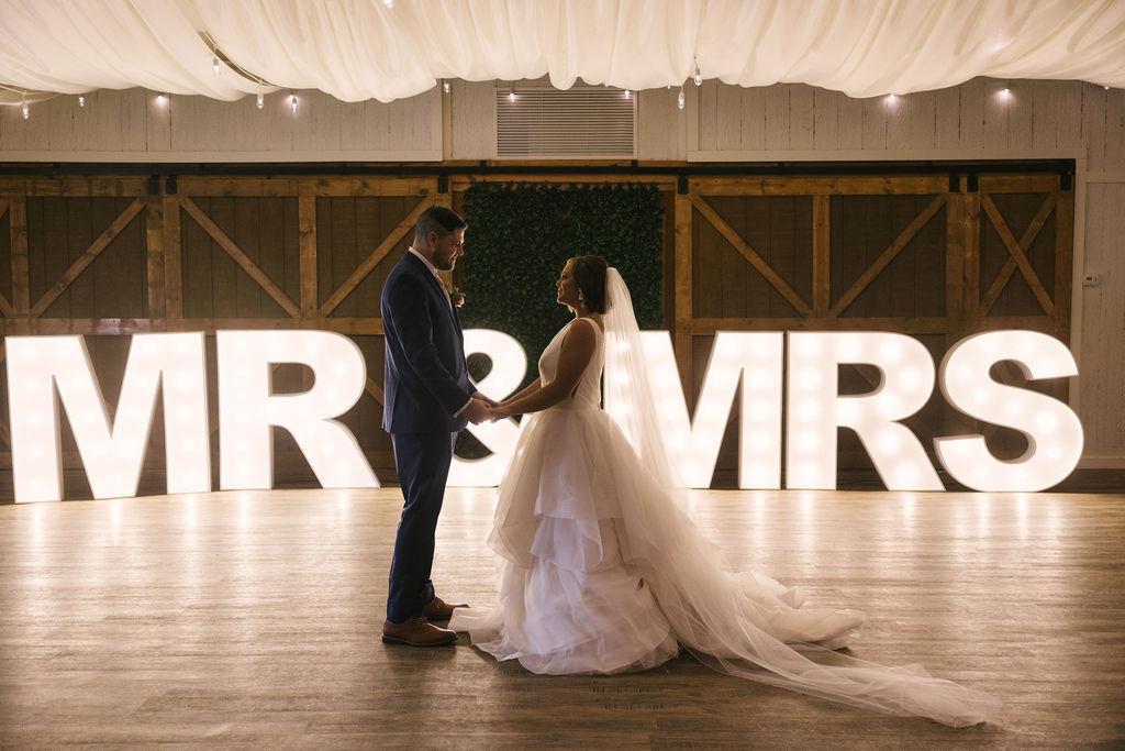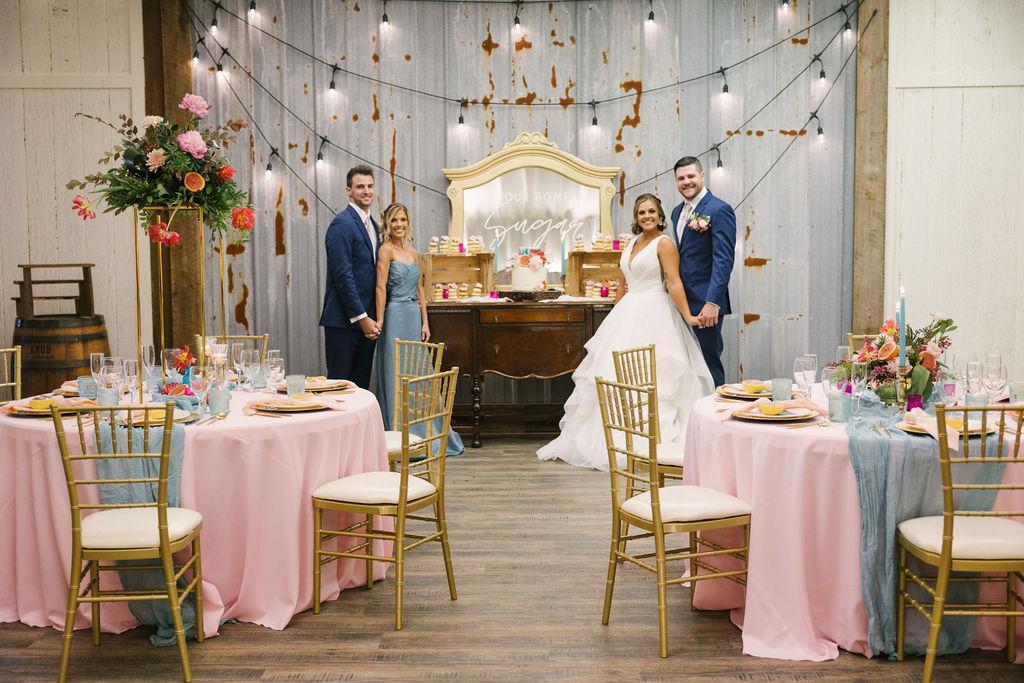 Originally built as a citrus barn in the late 70’s, our rustic and elegantly charming event venue comfortably seats 200 guests. A canopy of mossy oaks surrounds the outdoor ceremony site with market lights strung to create a romantic glow. A paved walkway leads to your happily ever after where vows are exchanged in front of our wooden gazebo. In the air-conditioned reception room, guests will enjoy comfortable seating under our lofty ceiling where draping and twinkle lights create a delightful starry sky atmosphere. We’d love to help make your wedding day vision a reality.