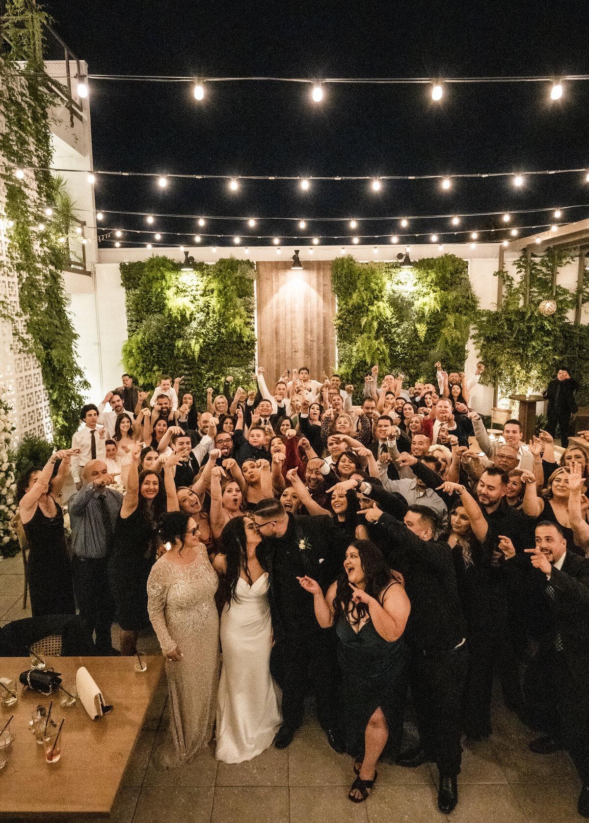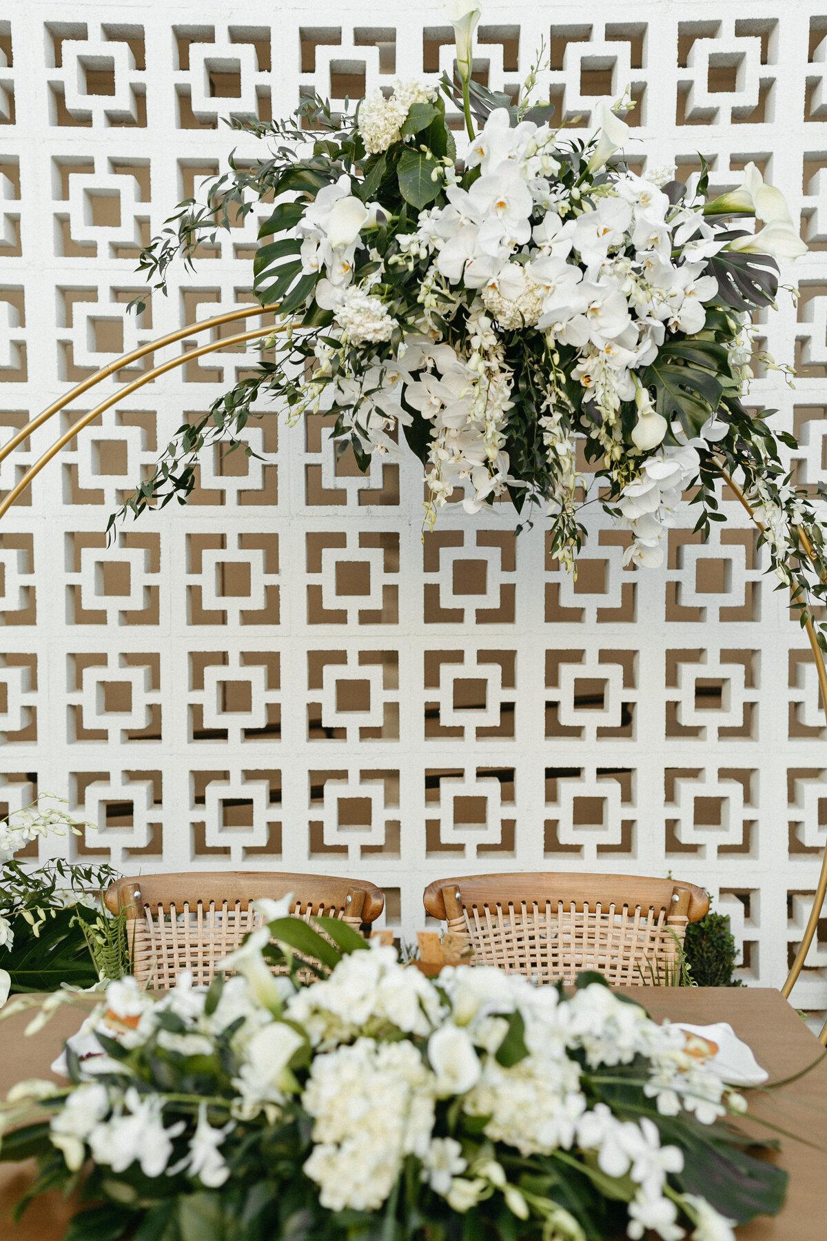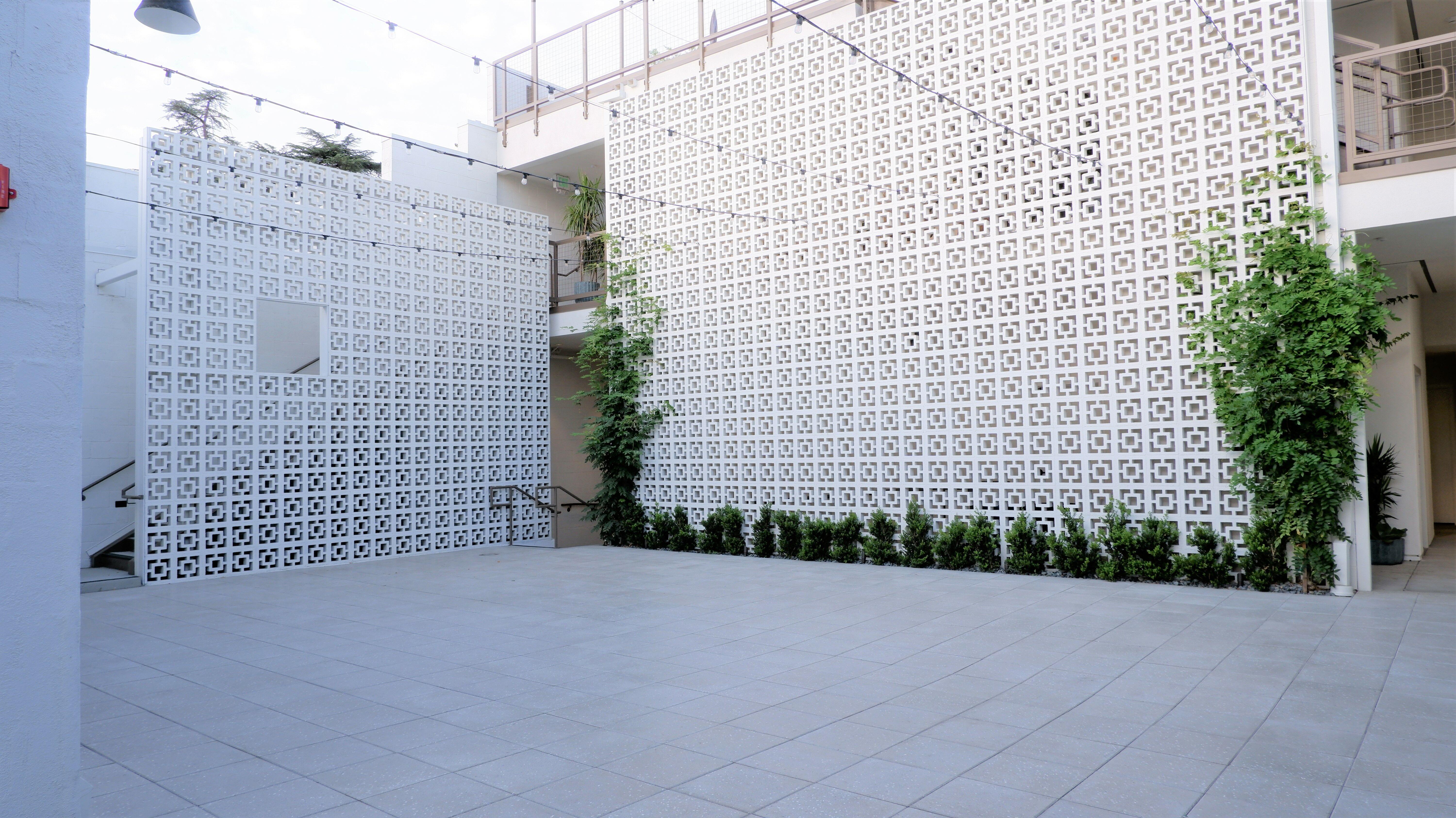 On the lower level, soon-to-be-newlyweds can exchange vows in front of an intricate white breezeblock wall or a lush green wall of vegetation. Here, draping bistro lights cast a warm and romantic ambiance over the festivities, while tasteful landscaping completes the look.