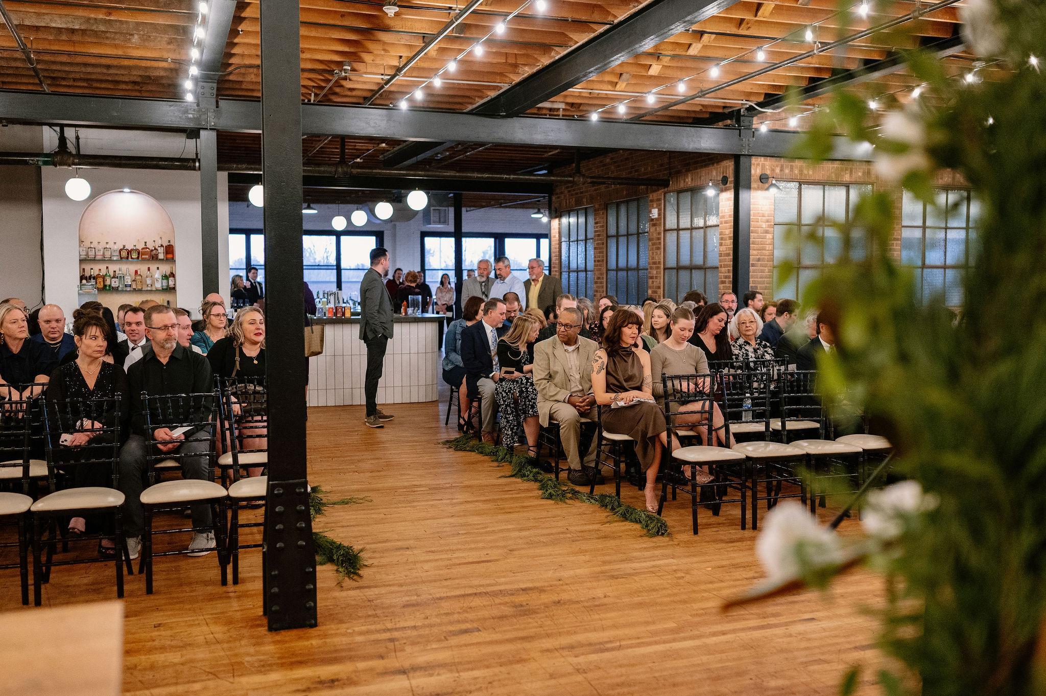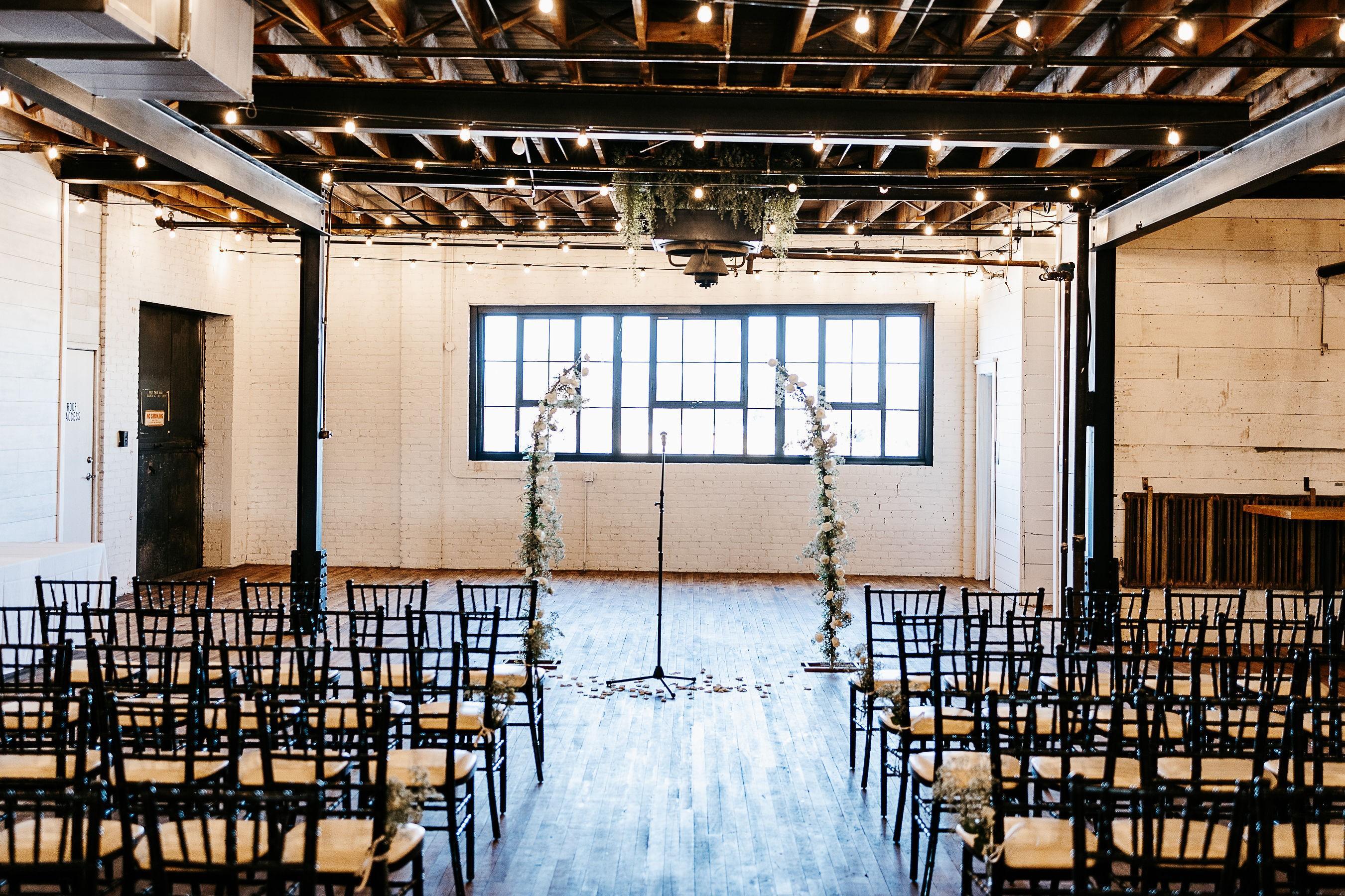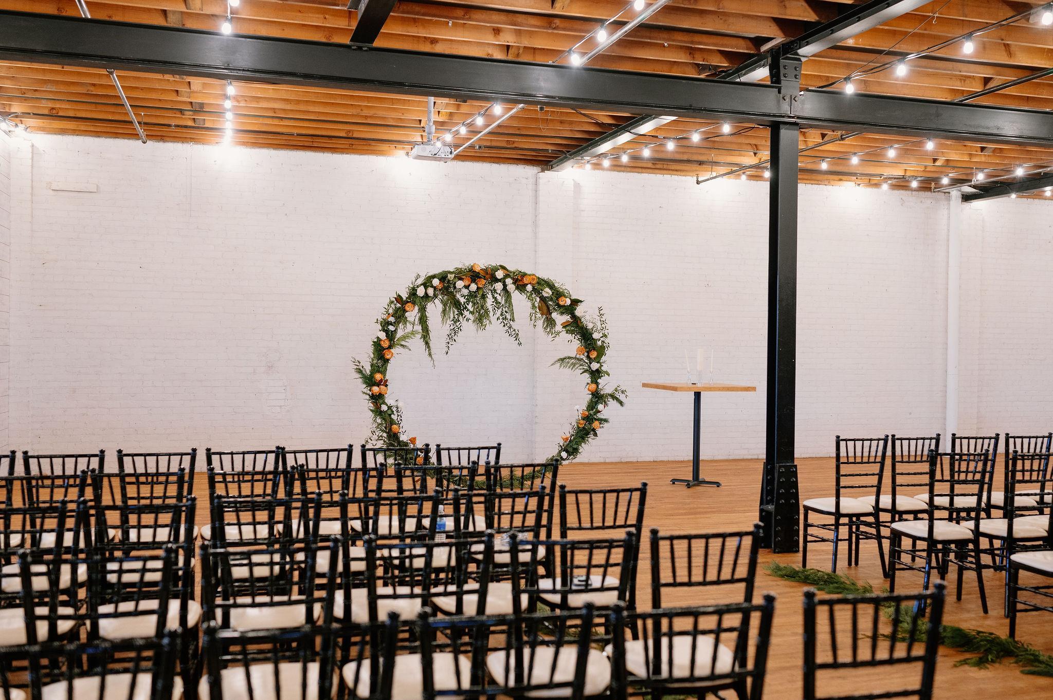 Both our East and North ceremony options are held in the reception space. This option is more "horizontal" while the East option is more "vertical." This space allows you to use the white brick wall as a blank canvas backdrop. After the ceremony we direct guests to the cocktail space and flip the entire space for the reception.